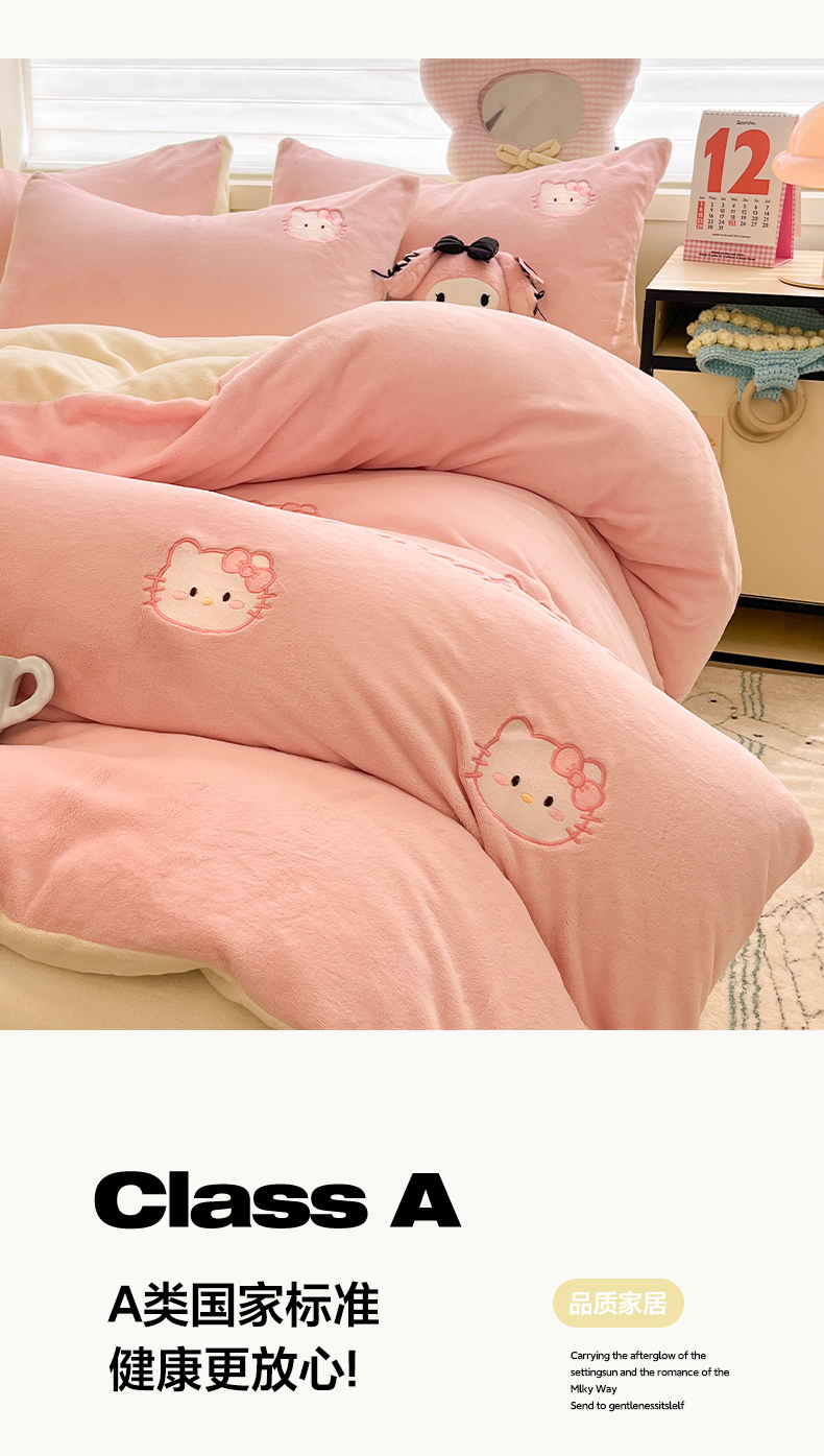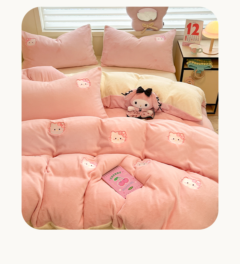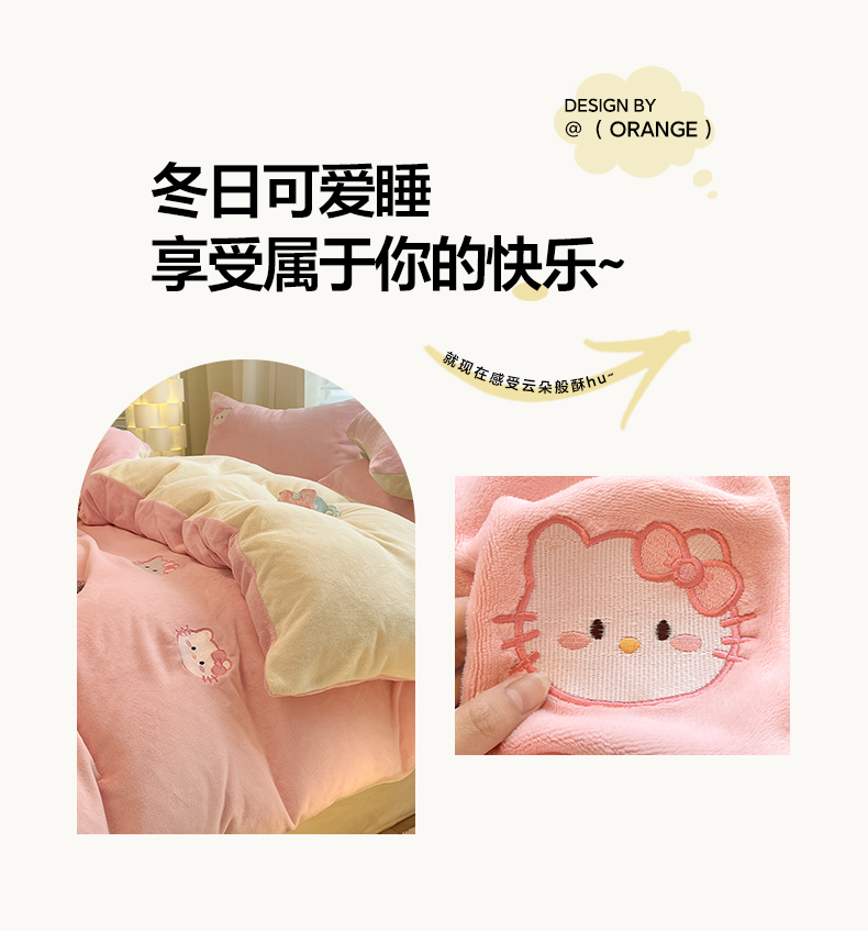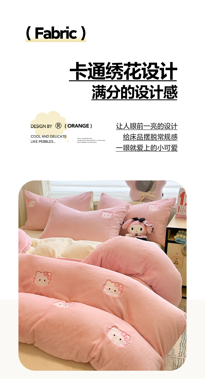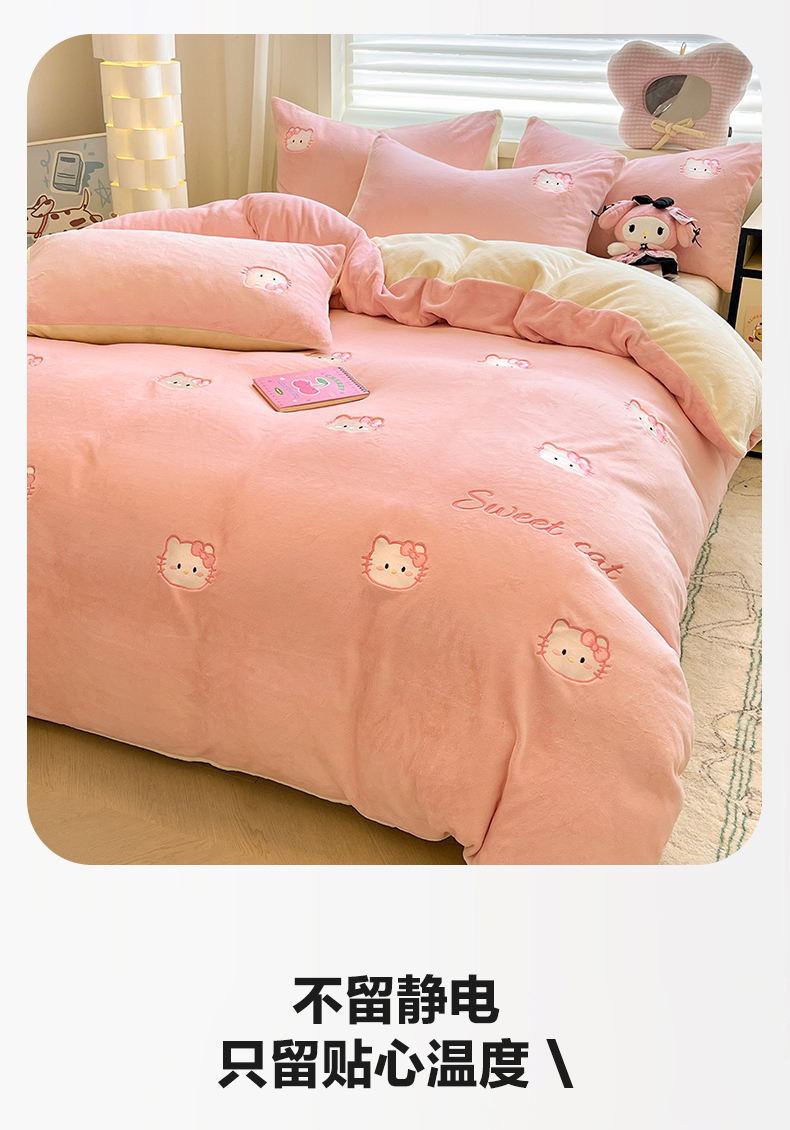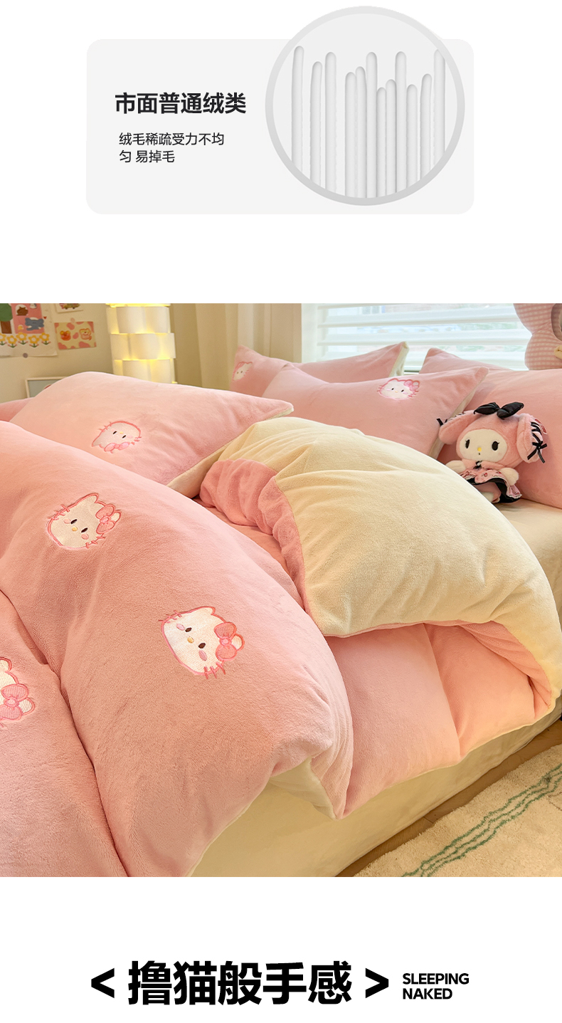 如一 2025新款200克缸染高克重精绣牛奶绒四件套 绒-甜心猫-粉米