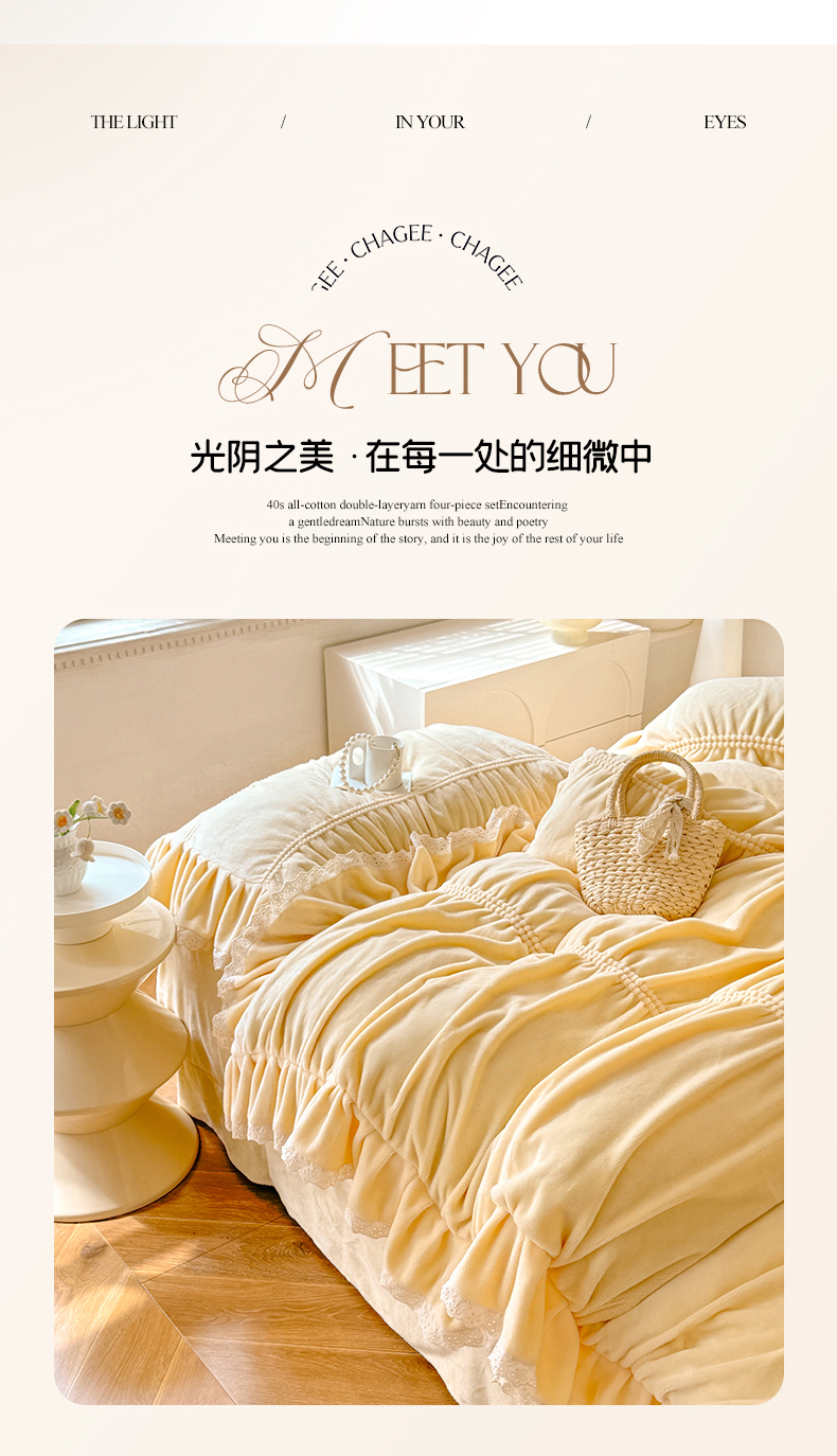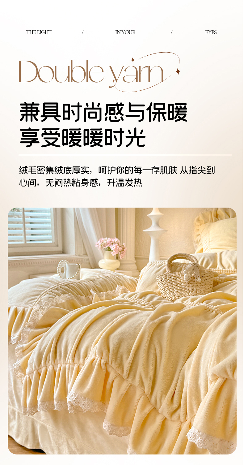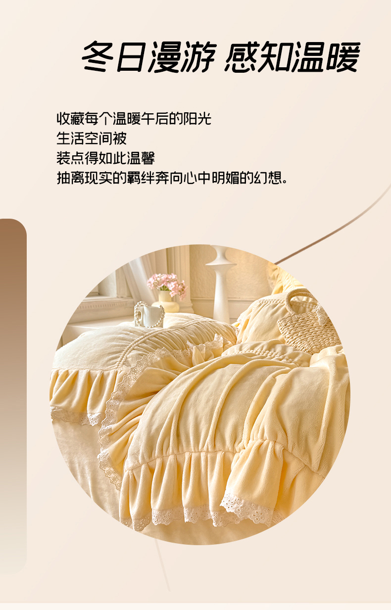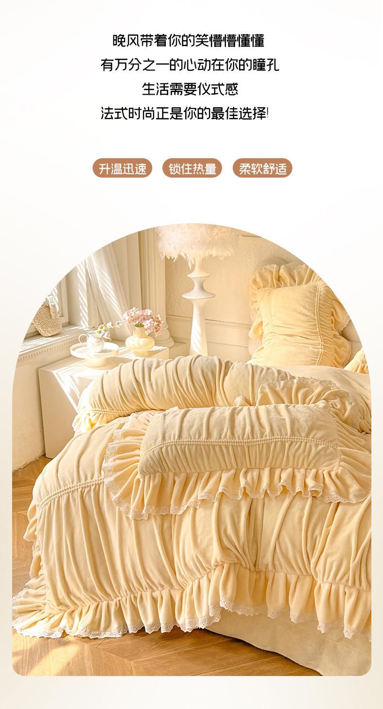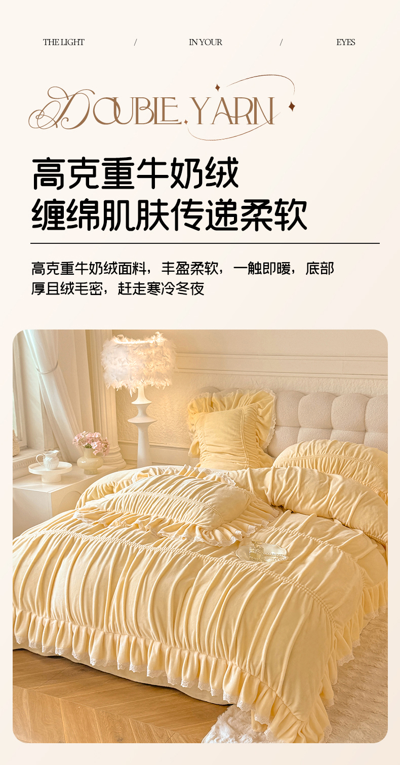 商品名称:满座家居 2025新款高克重230克糯糯绒牛奶绒工艺款消光牛奶绒四件套轻法式简约保暖四件套-洛可可 洛可可-麦黄