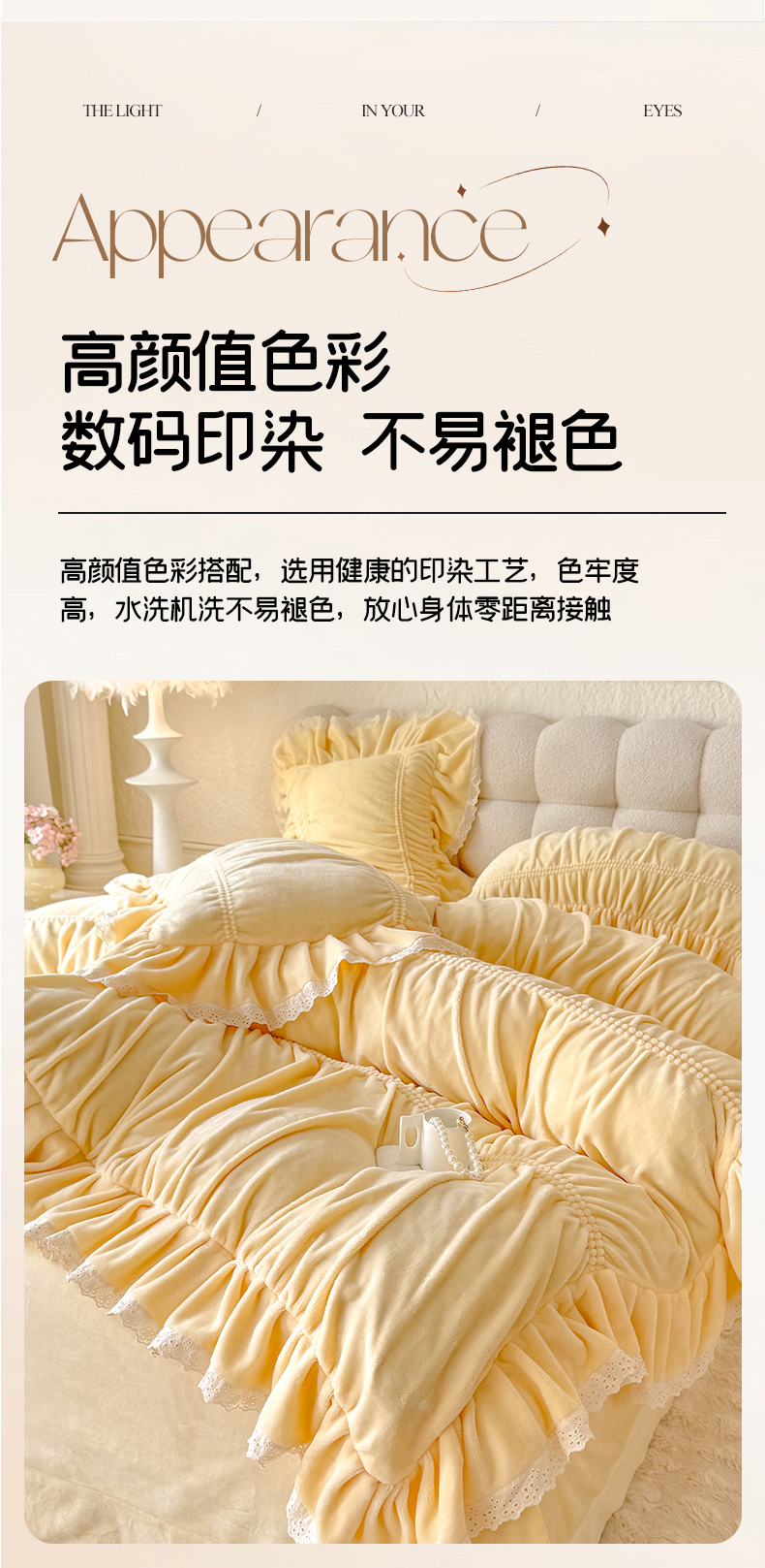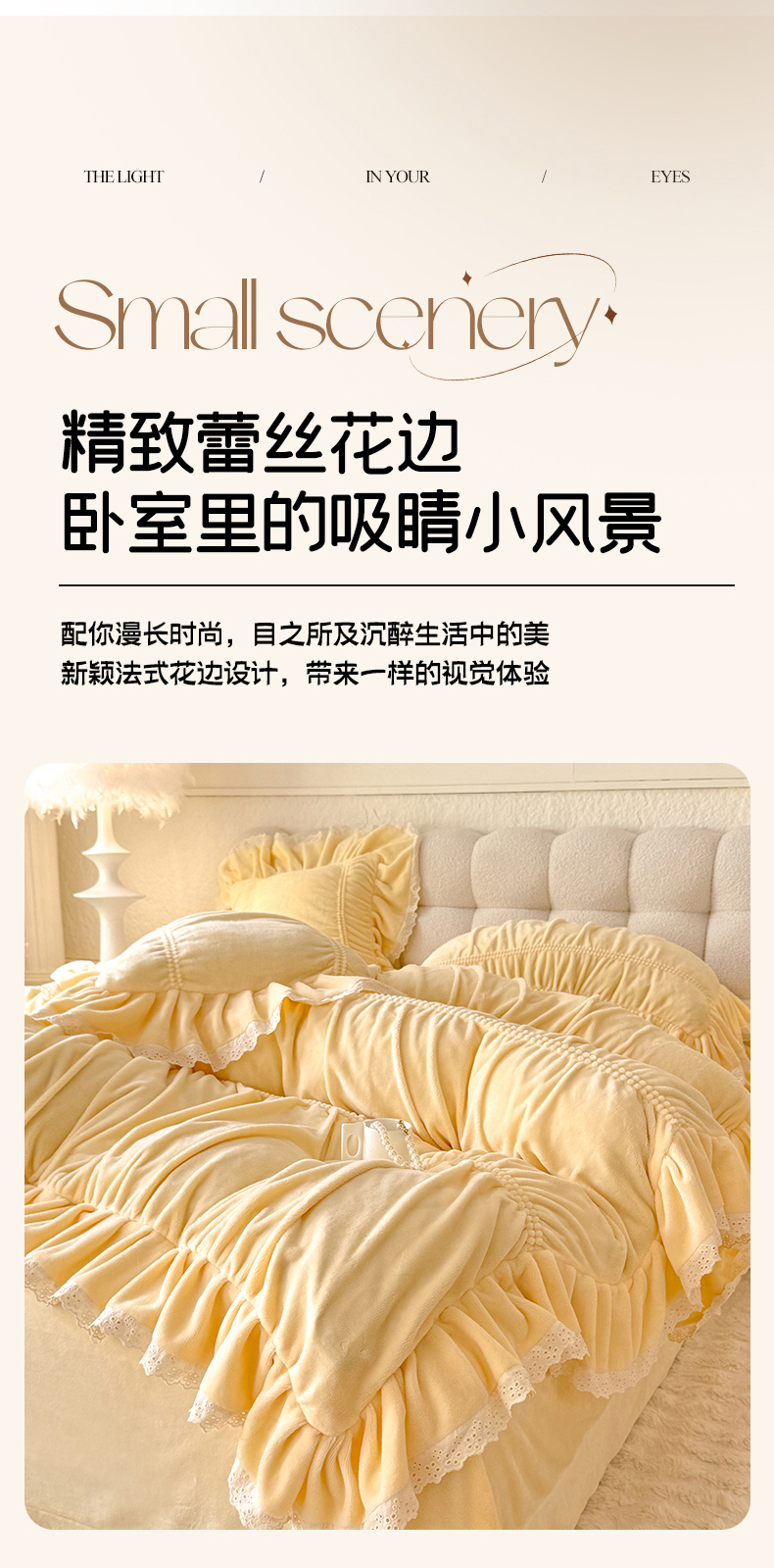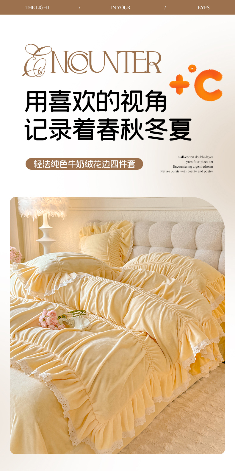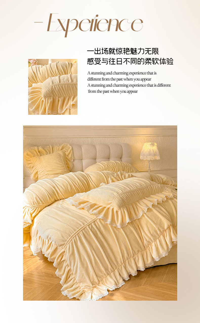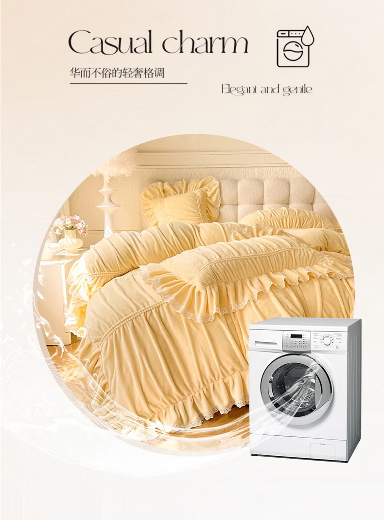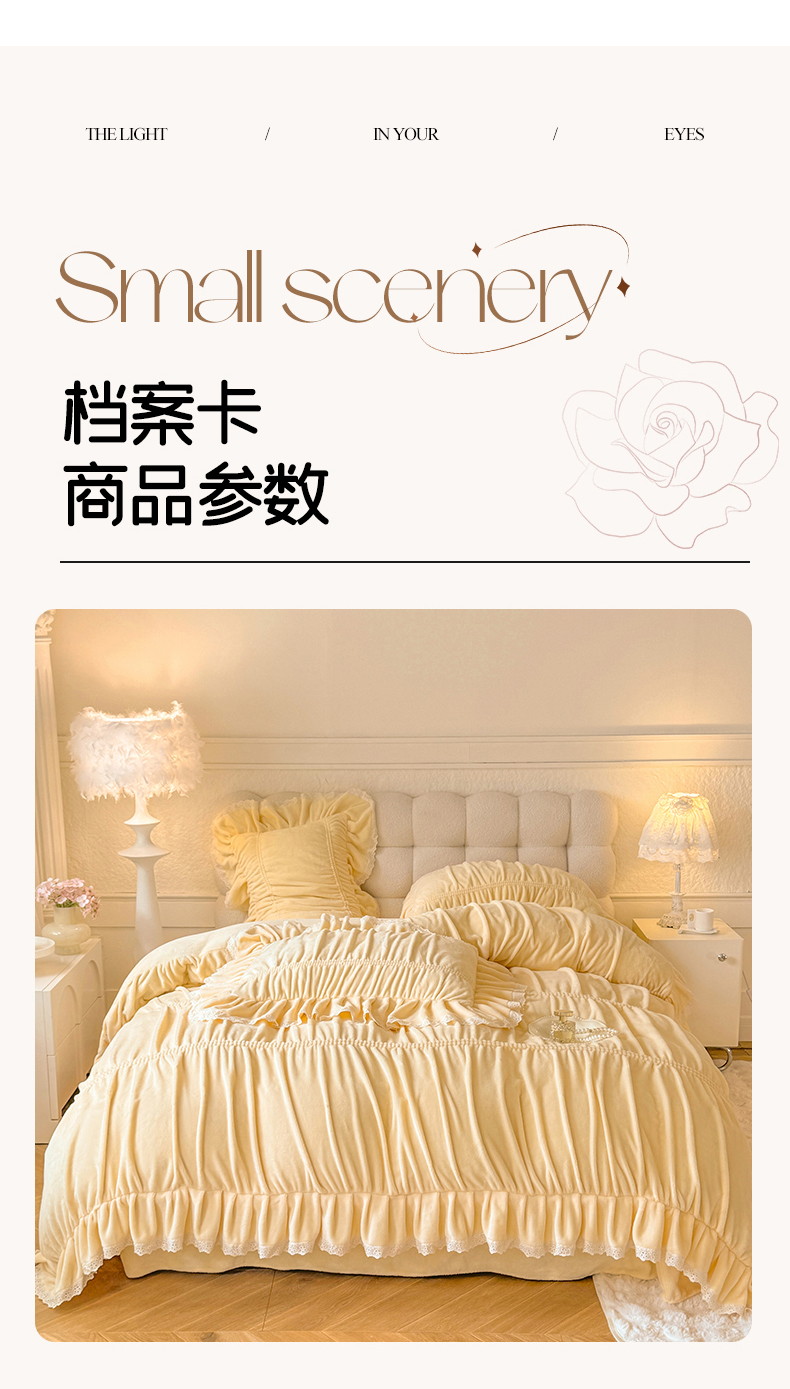 商品名称:满座家居 2025新款高克重230克糯糯绒牛奶绒工艺款消光牛奶绒四件套轻法式简约保暖四件套-洛可可 洛可可-麦黄