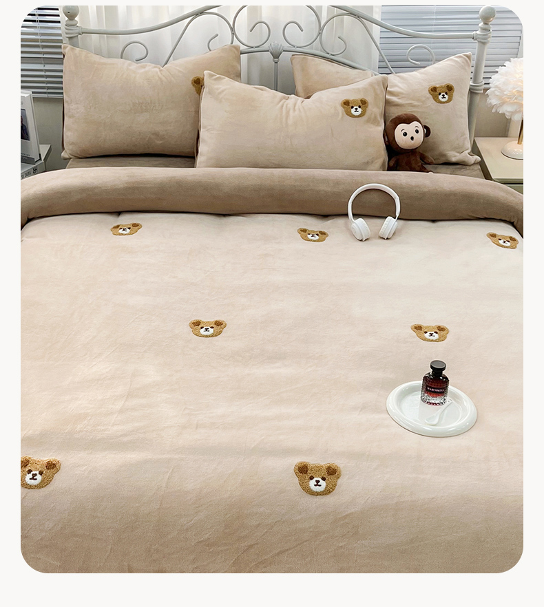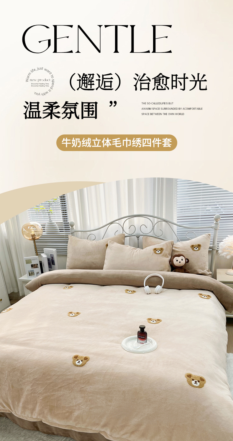 鑫利来家纺 2025新款牛奶绒毛巾绣四件套 小熊-浅咖深咖