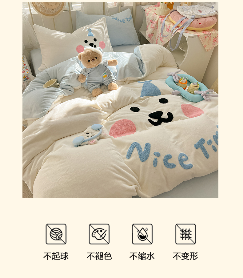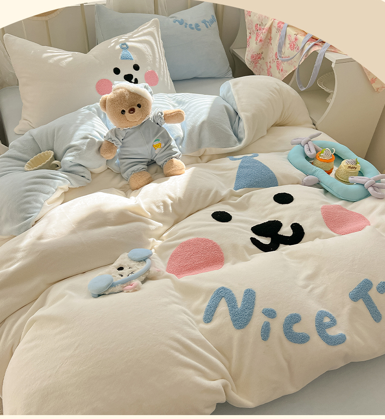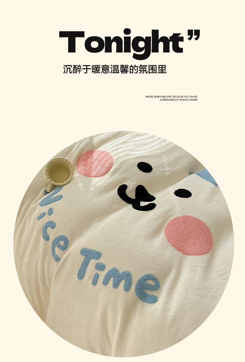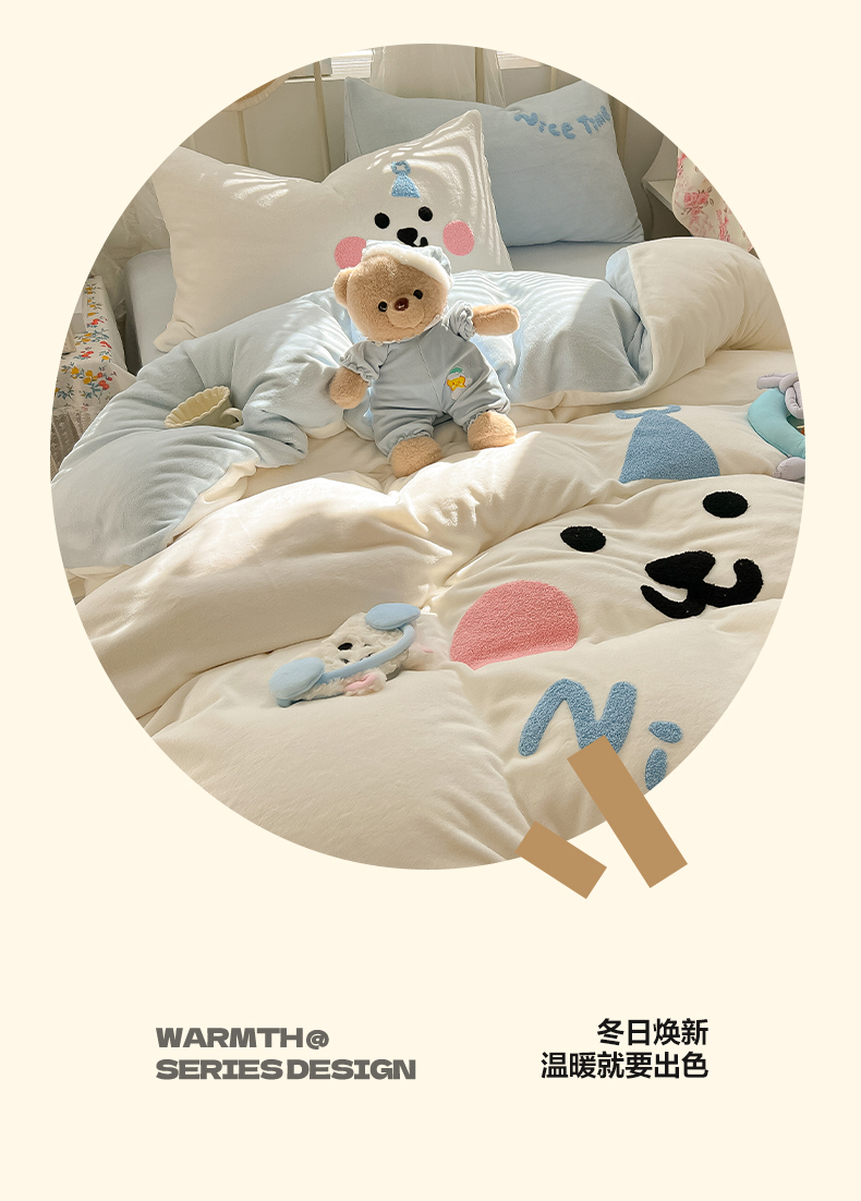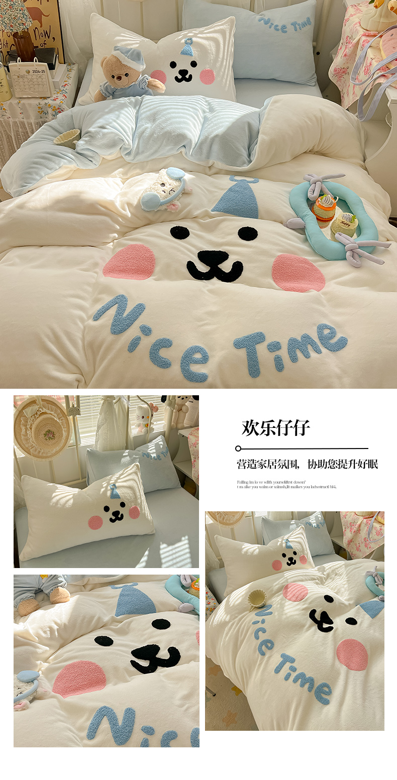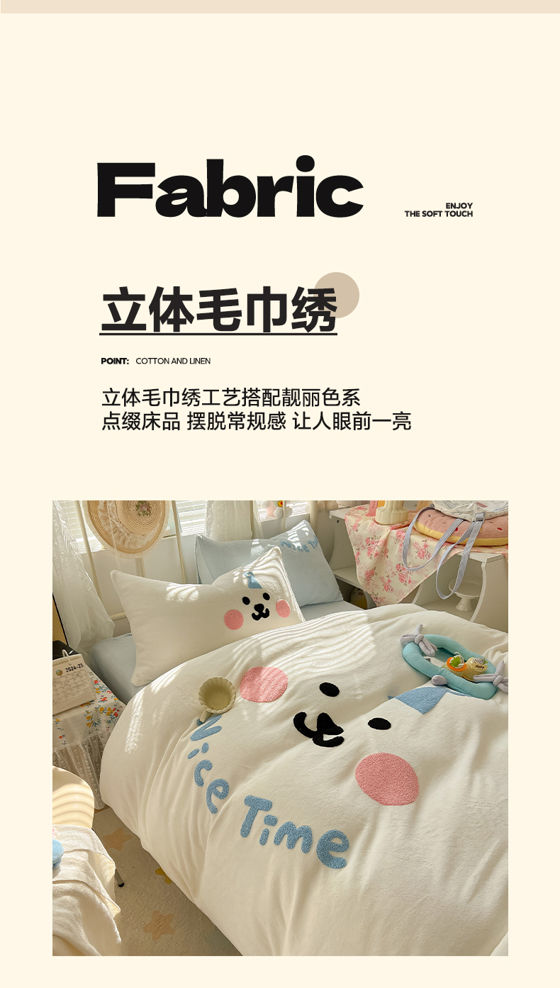 商品名称:韩都家居 2025新款高克重萌系牛奶绒毛巾绣四件套 欢乐仔仔