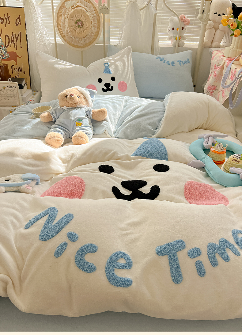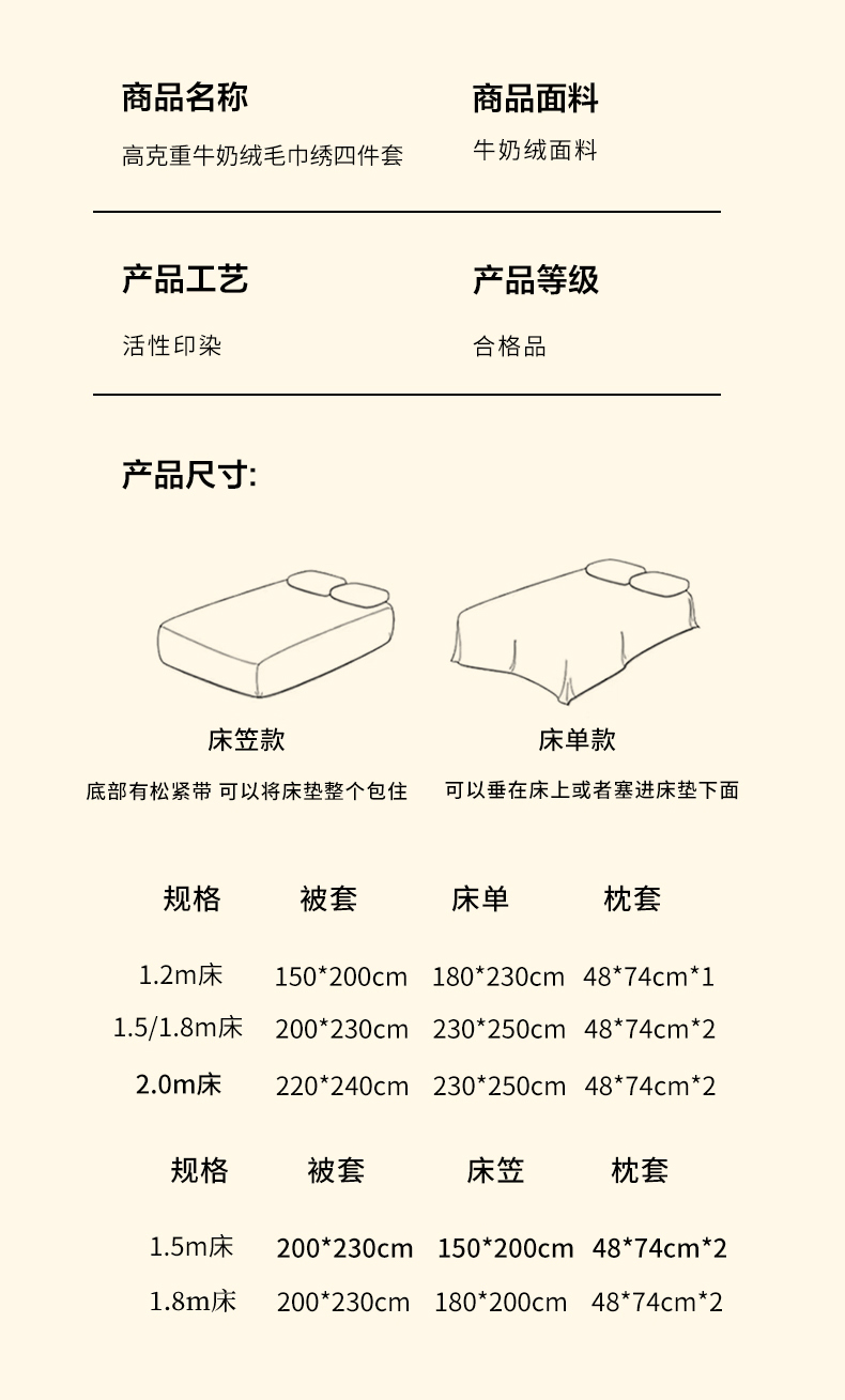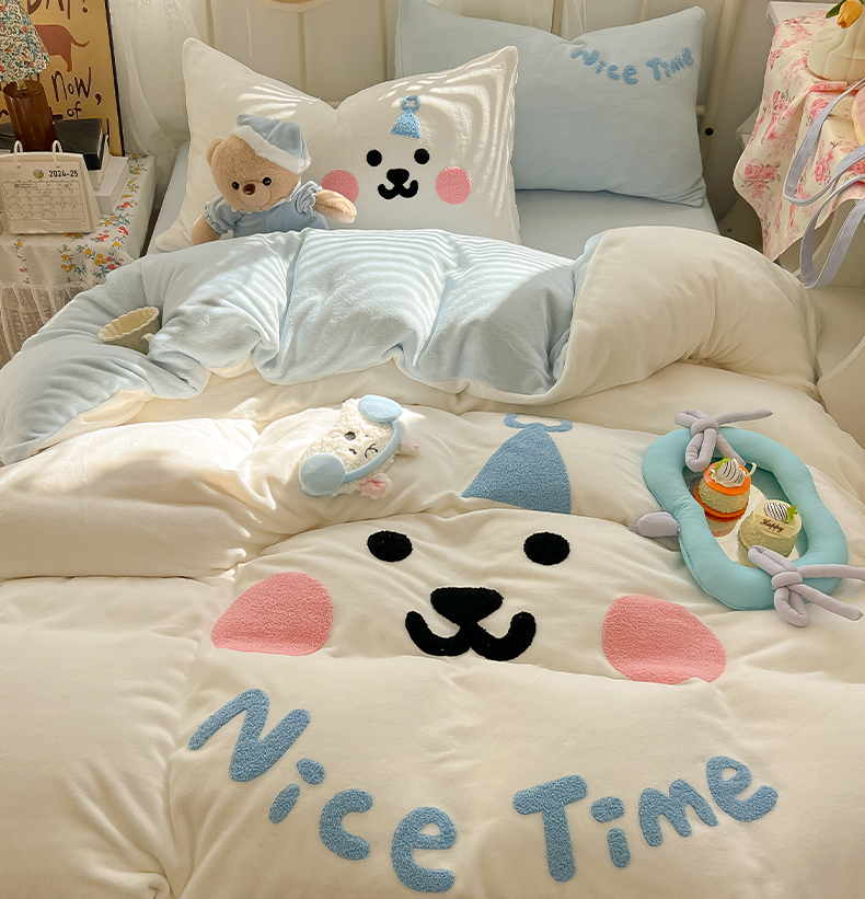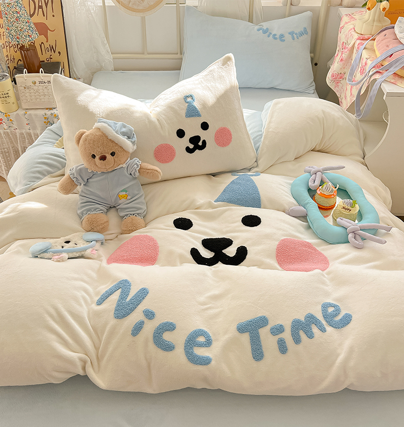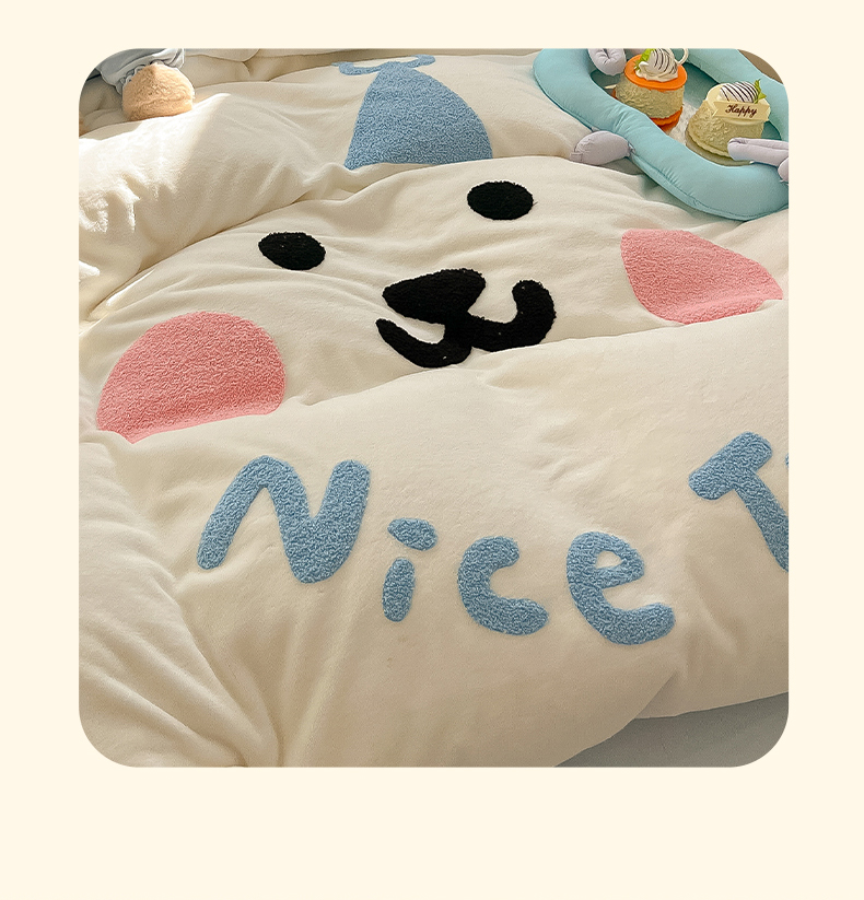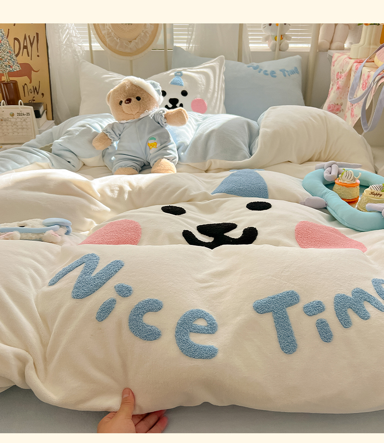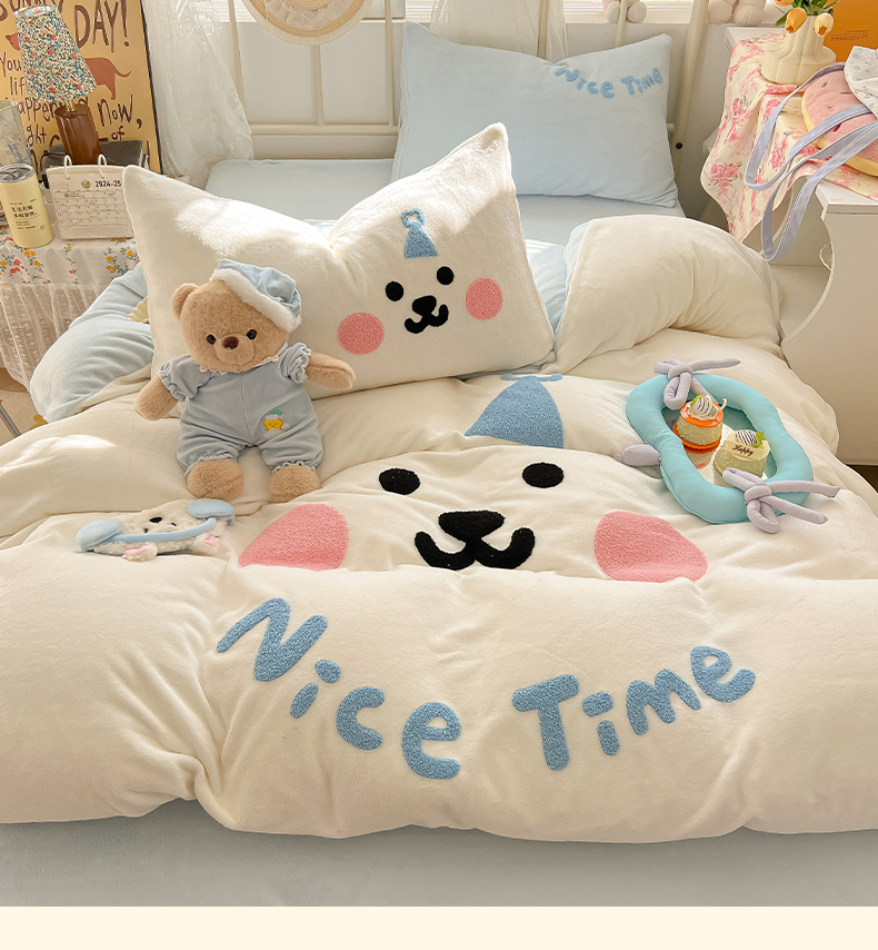 商品名称:韩都家居 2025新款高克重萌系牛奶绒毛巾绣四件套 欢乐仔仔
