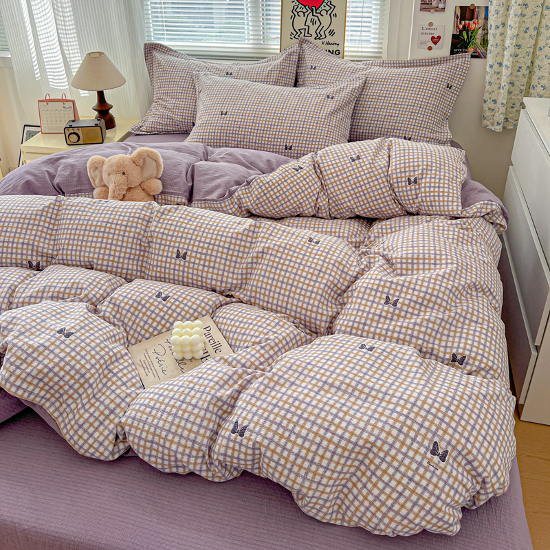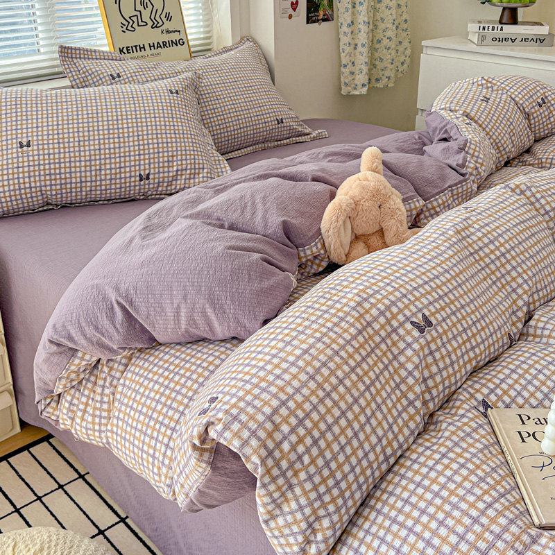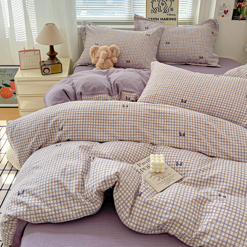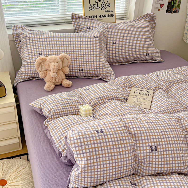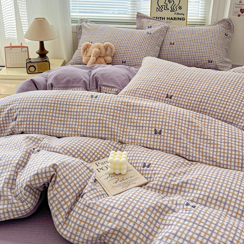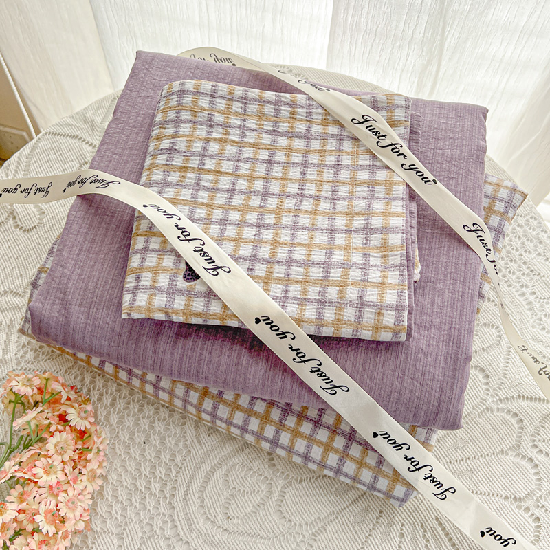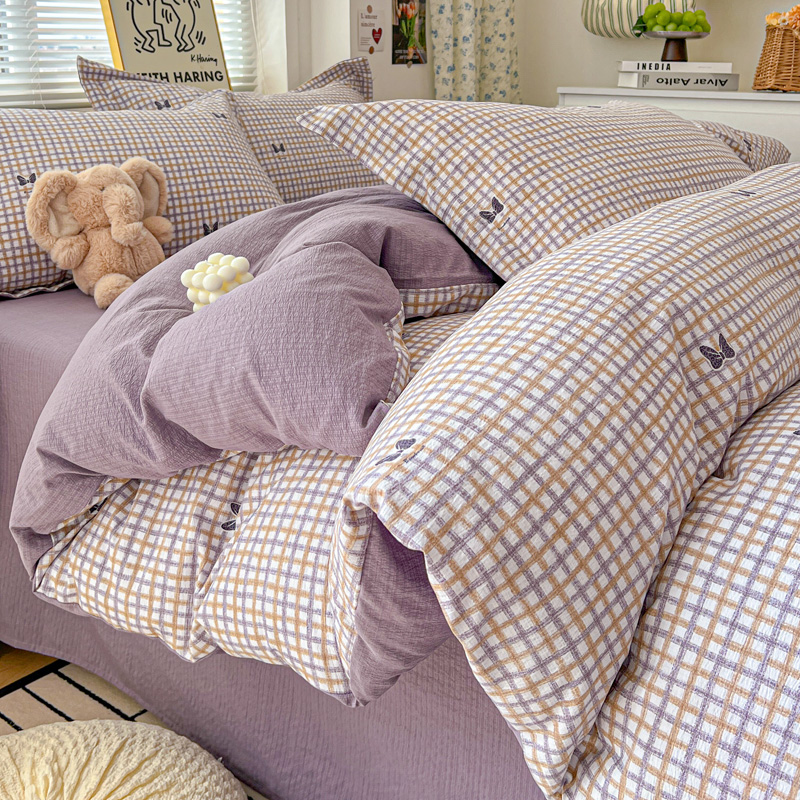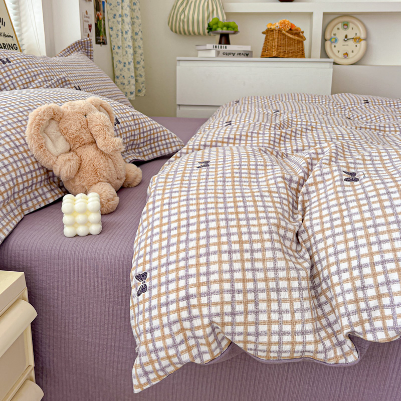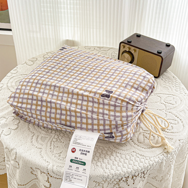 一比一 2025新款古法水洗棉小布袋高克重云柔棉四件套 格纹紫蝶