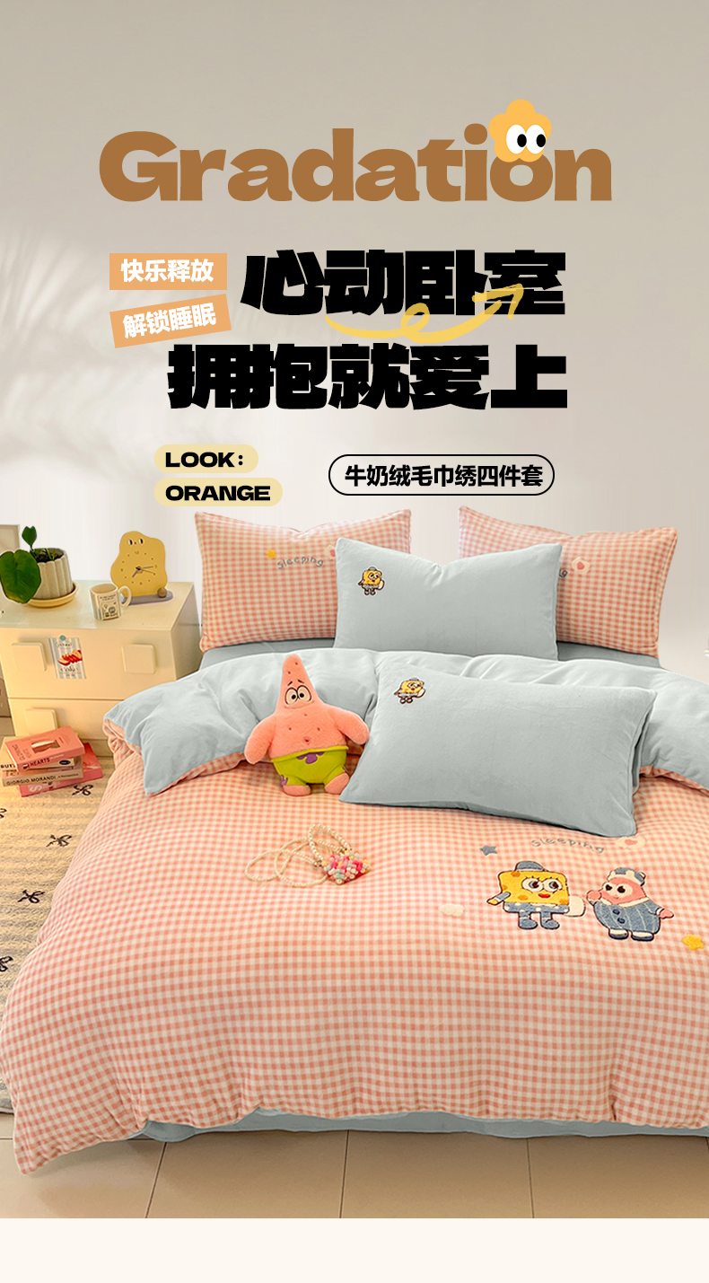 如一 2025新款卡通毛巾绣系列牛奶绒四件套第一批 海绵宝宝