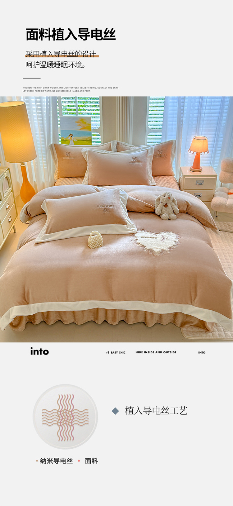 商品名称:漫布云2025秋冬简约轻奢款230g全消光牛奶绒兔毛绒贴布绣花夹棉床盖款四件套纯色蕾丝花边刺绣床裙款床盖--心愿系列 心愿—婴儿蓝
