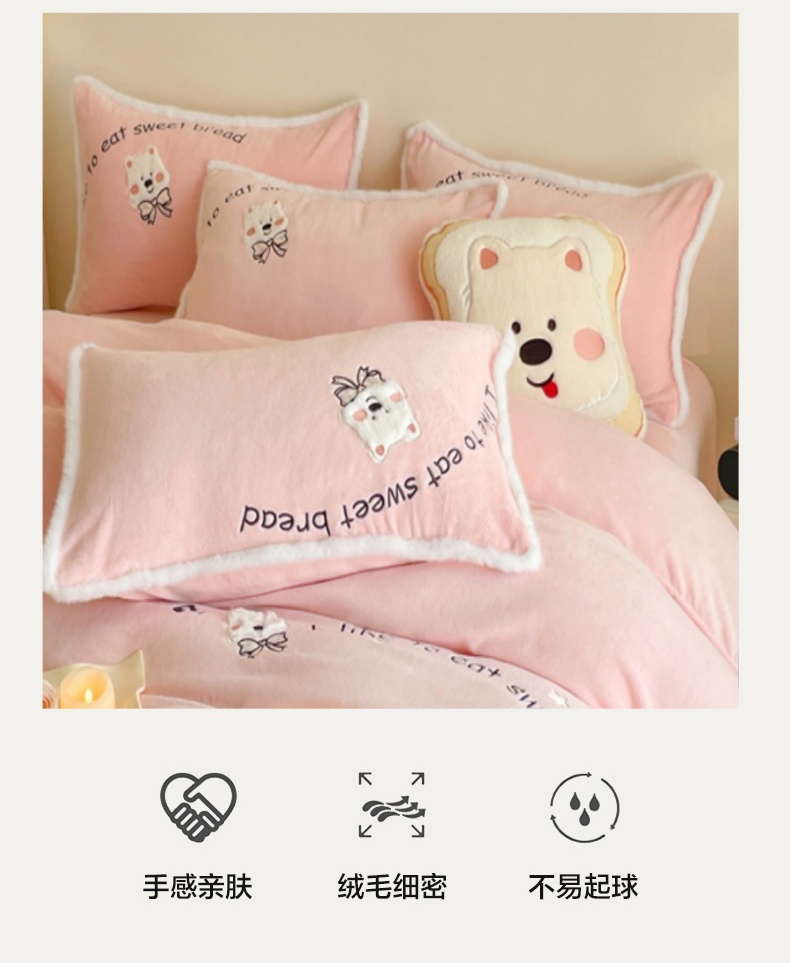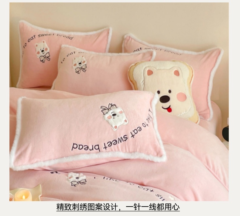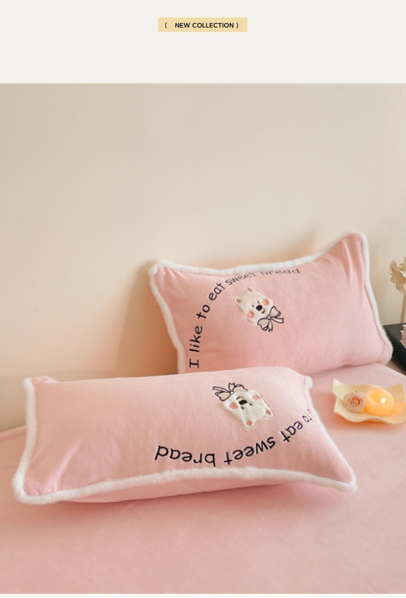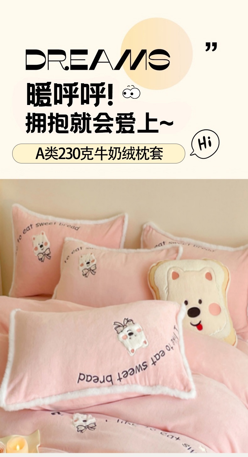 商品名称:梦舒羽 2025新款A类230克全消光刺绣贴布牛奶绒枕套宿舍枕芯套单人枕头套一对装 吐司萌宠-苏漫粉