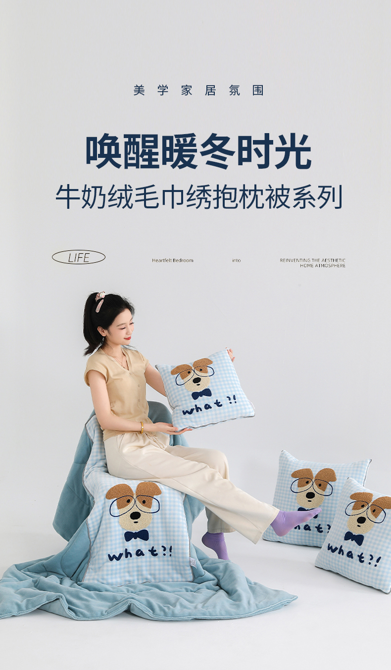 翰轩家居 2025新款卡通牛奶绒抱枕被毛巾绣系列 眼镜狗-蓝