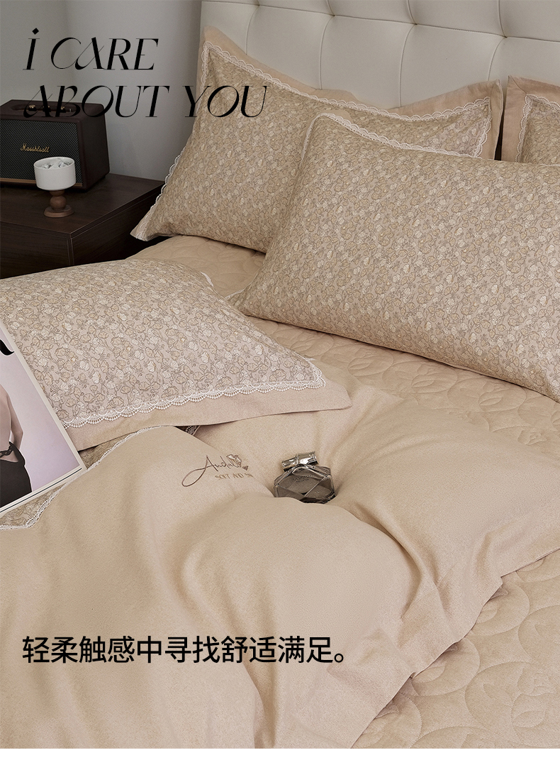 (总)OL家纺 2021居家全棉羊绒保暖亲肤色织蕾丝四件套,海蓝,玫红,活力橙,绅士灰,桃红,熏衣紫,奶茶色,粉玉,薄荷绿,柠檬黄