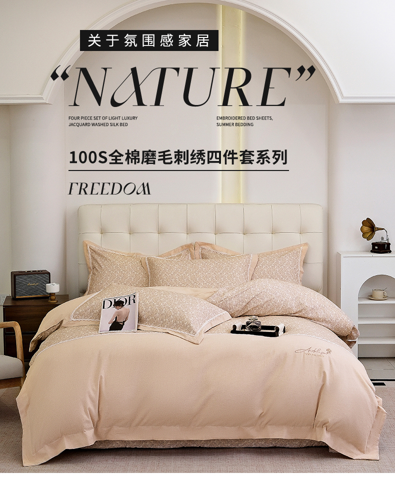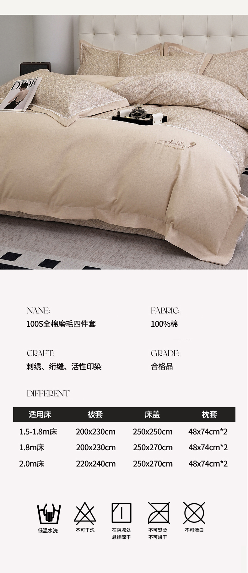 商品名称:OL家纺 2025新款100s全棉磨毛印染加刺绣四件套(控价1.5/1.8标准被套折券后368元!!!) 香槟金
