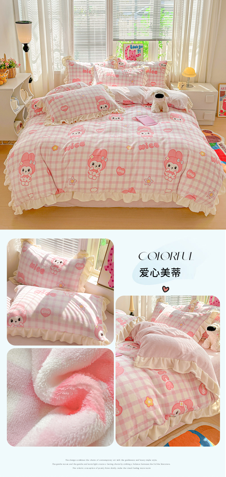 当前位置: 91家纺网 > 商品网购 > 床品套件 > 四件套 > 牛奶绒四件套 > N先生+V 13814689556 发大图/买家秀 2025新款韩式博主风花边款ins卡通牛奶绒四件套 爱心美蒂