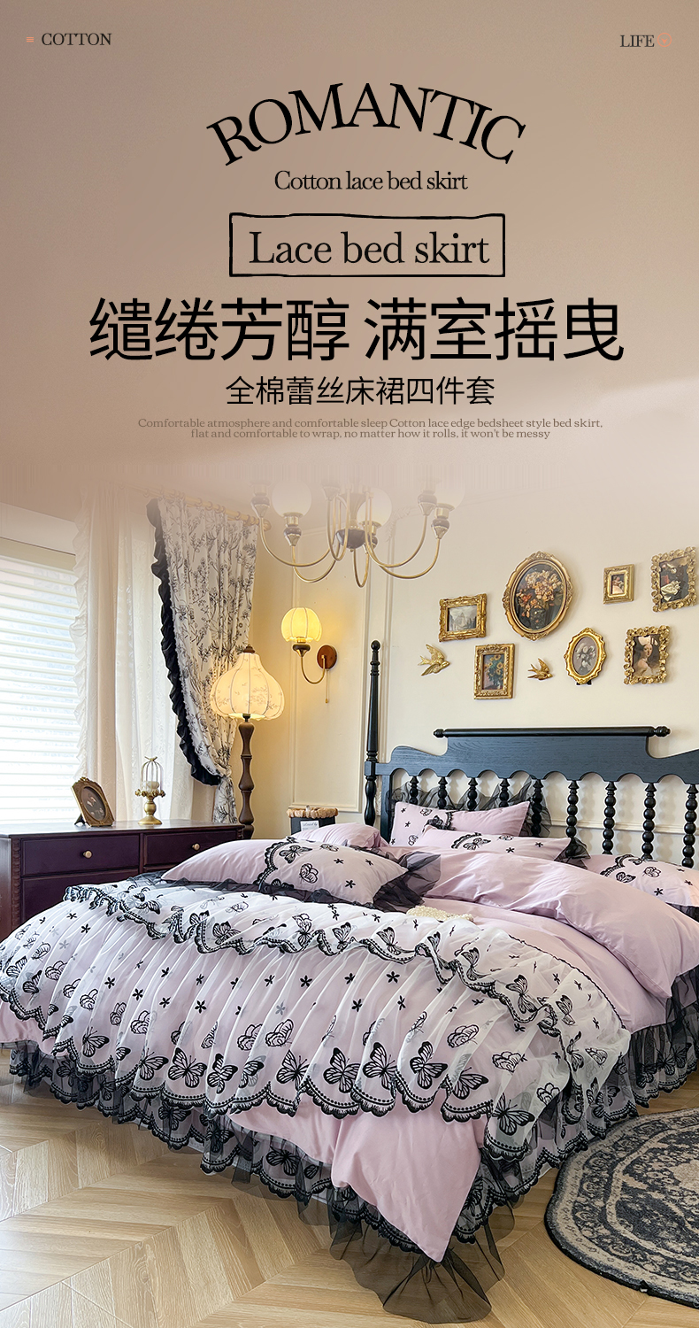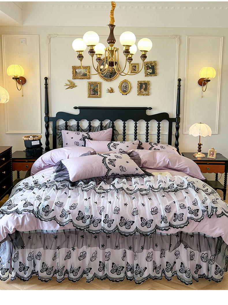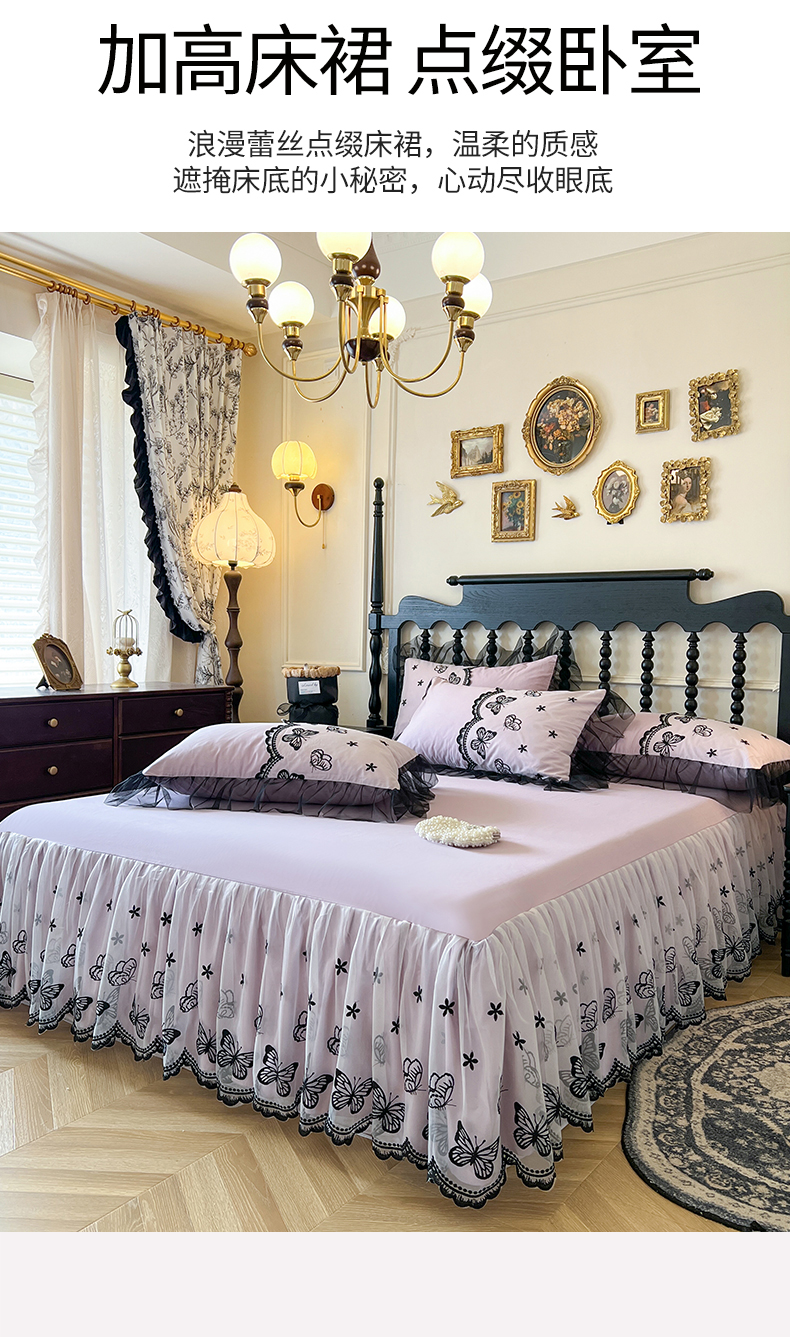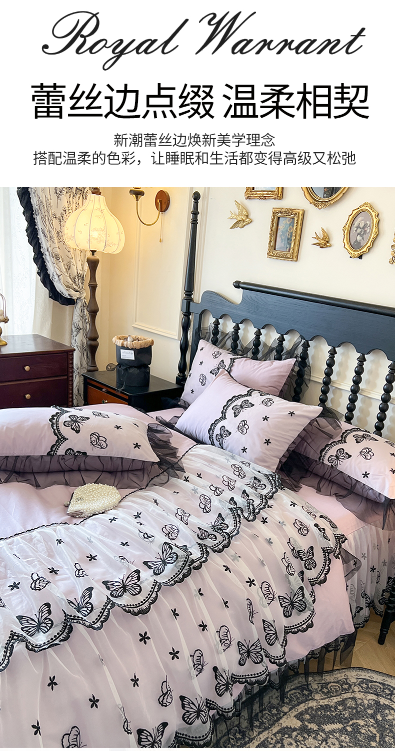 当前位置: 91家纺网 > 商品网购 > 床品套件 > 四件套 > 全棉普通四件套 > 网红馆(ck家纺) 2025新款全棉纯棉蕾丝边床裙款四件套-梦蝶轻舞 梦蝶轻舞-紫