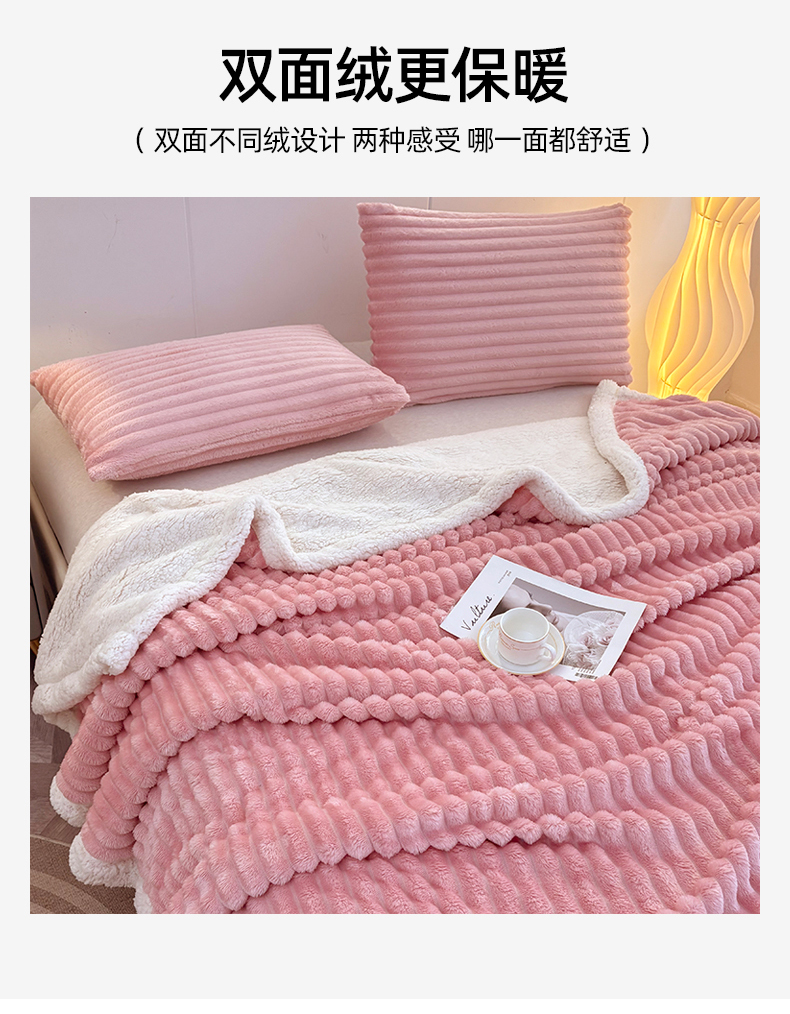 枋梢家纺 2025新款仿兔毛绒大抽条羊羔绒毛毯反包双层条纹羊羔绒法兰绒毛毯跨境外贸 豆沙粉