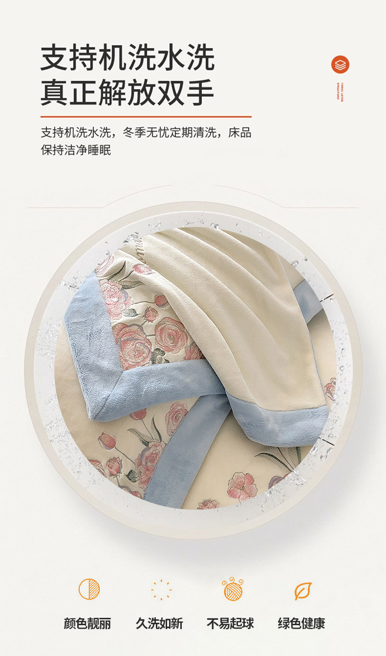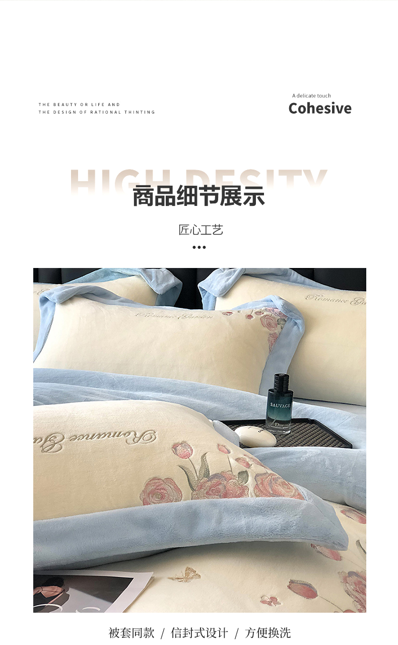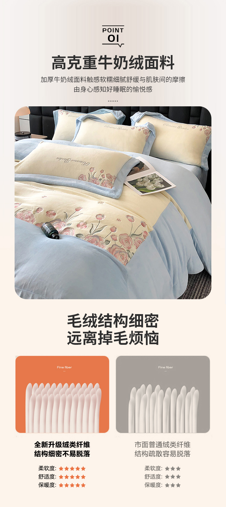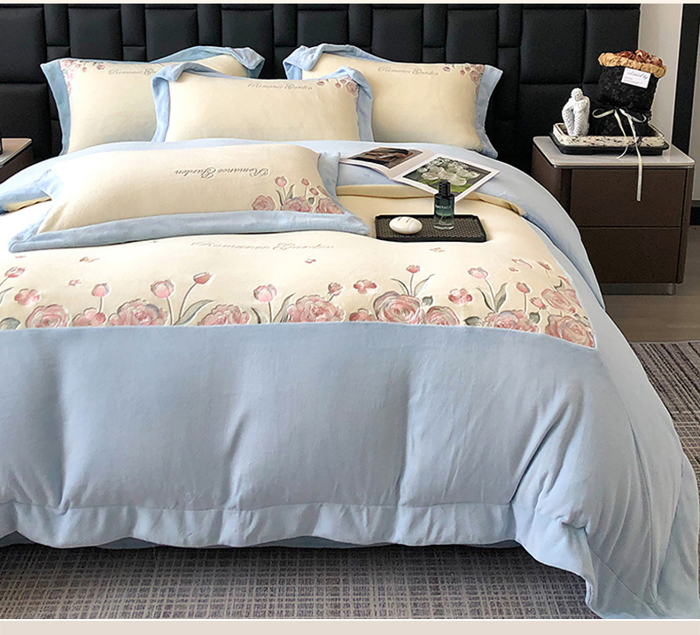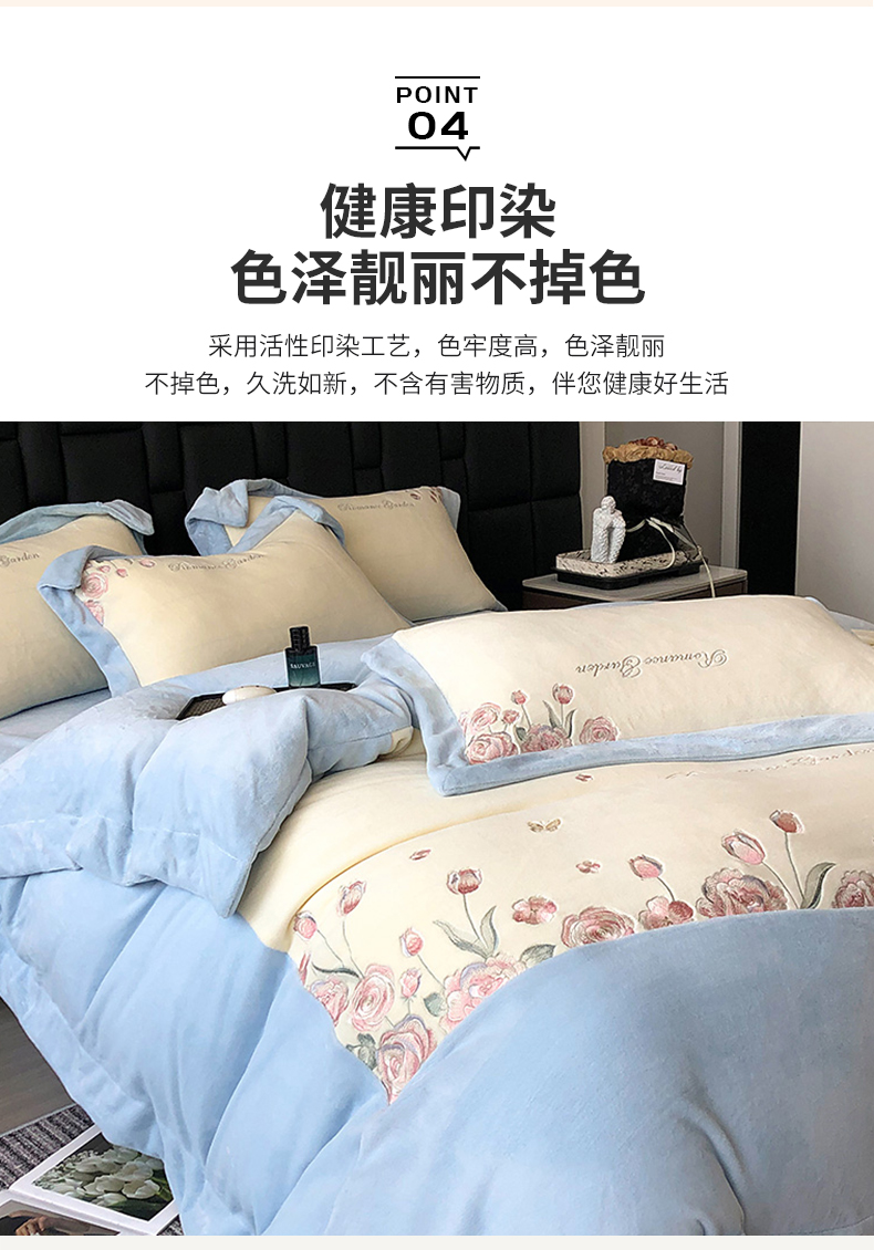 商品名称:家居1号家纺 2025新款230克A类全消光牛奶绒四件套-花海 花海-温馨蓝