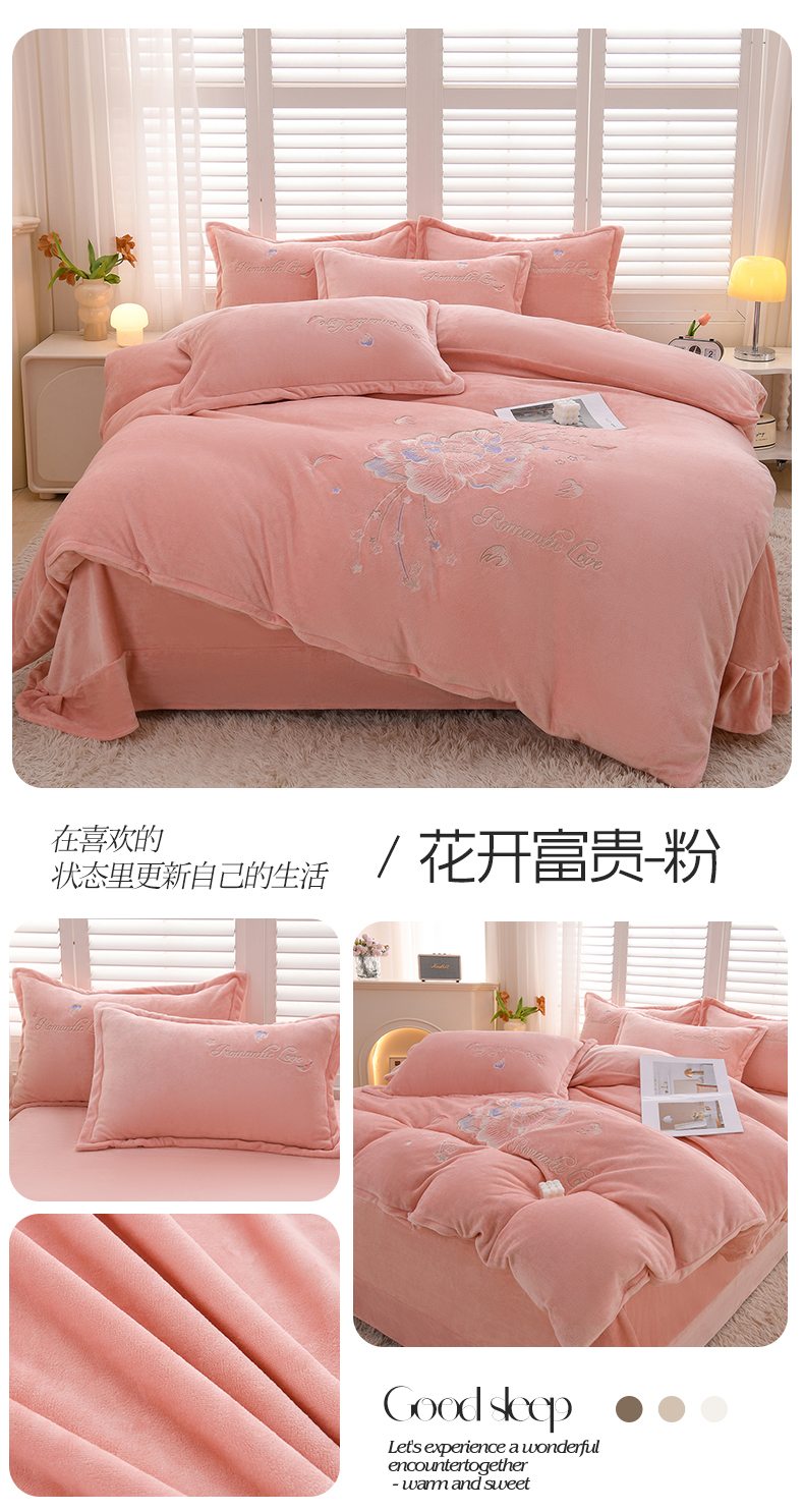 绒小宣 2025新款高克重牛奶绒刺绣四件套 花开富贵-粉,花开富贵-粉