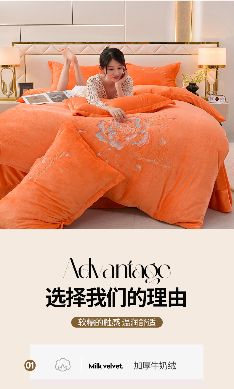 绒小宣 2025新款加厚牛奶绒刺绣花保暖四件套-花开富贵提供买家秀 花开富贵-橙色