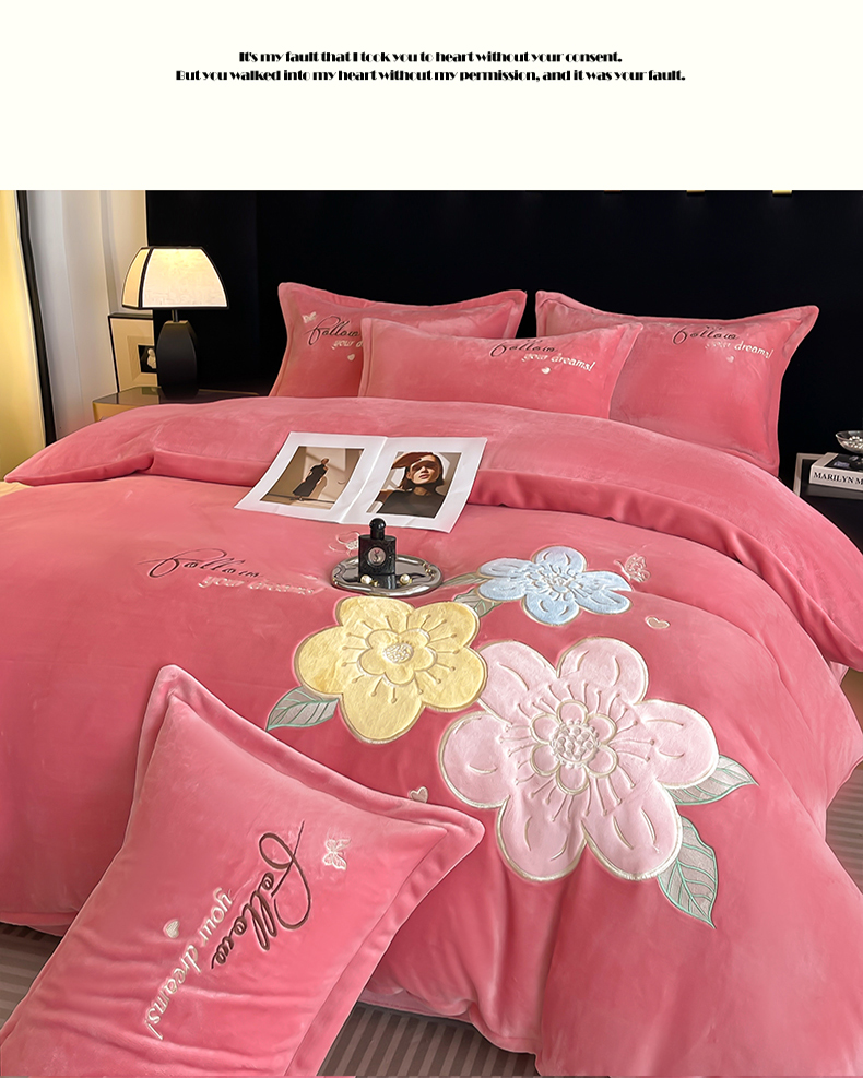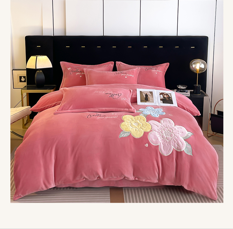 绒小宣 2025新A类牛奶绒贴布绣四件套-花语 花语-芍药粉