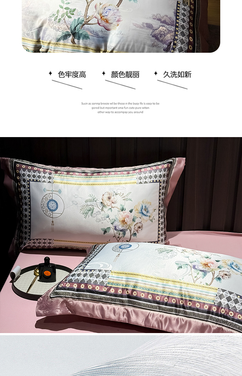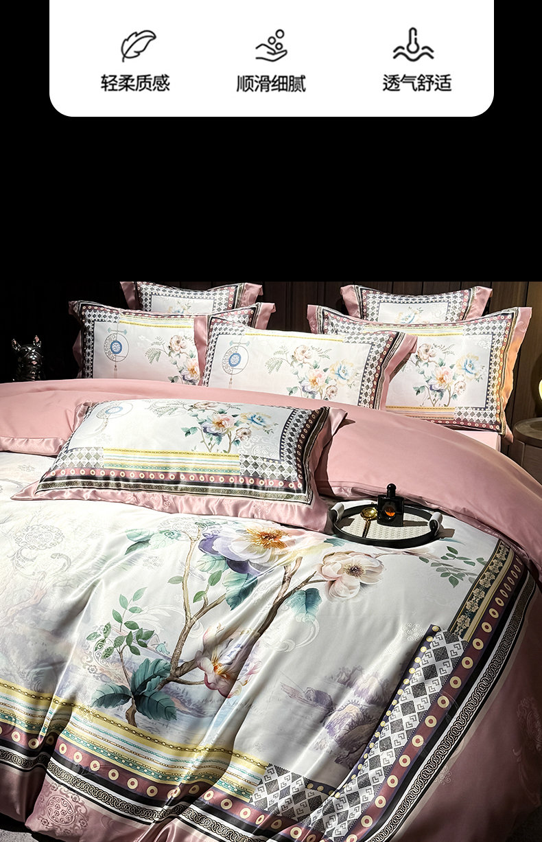 商品名称:七夜居 2025新款直播爆款欧式大阪轻奢贡缎提花加数码印花磨毛四件套 牡丹亭-芙蓉玉