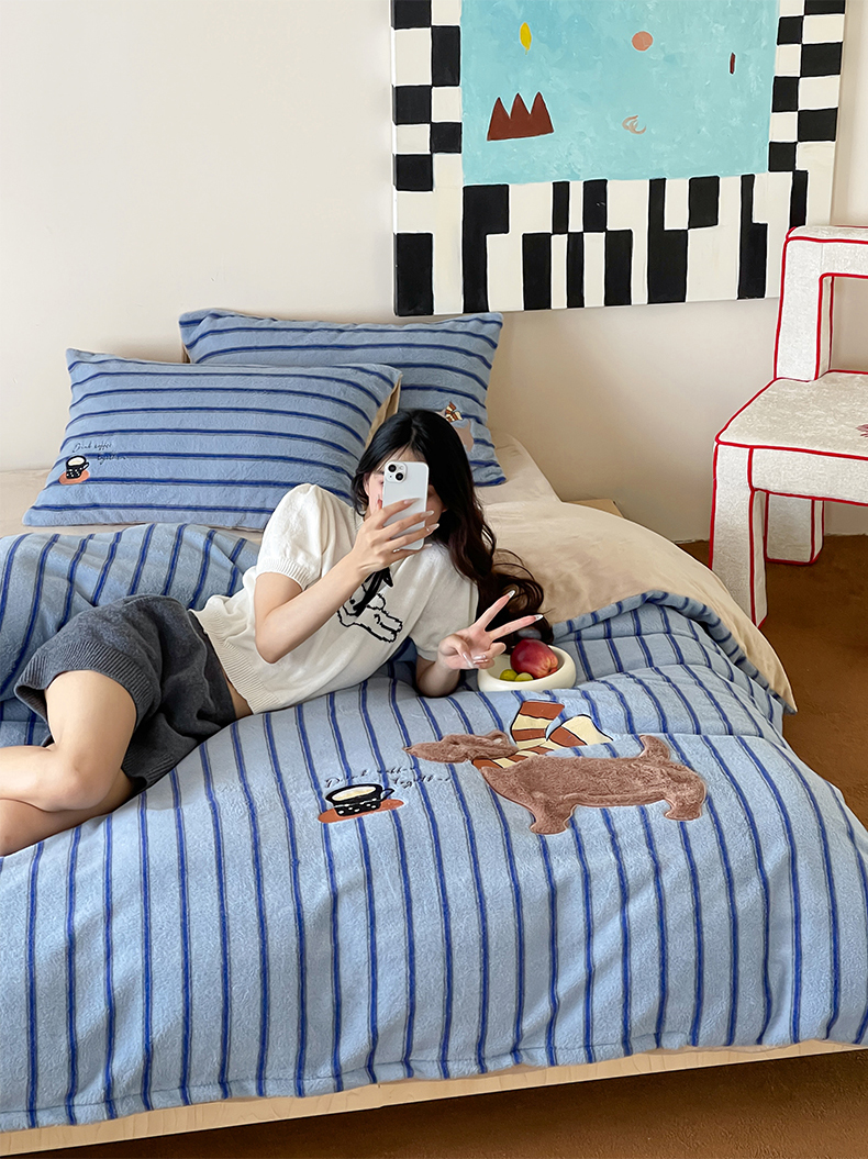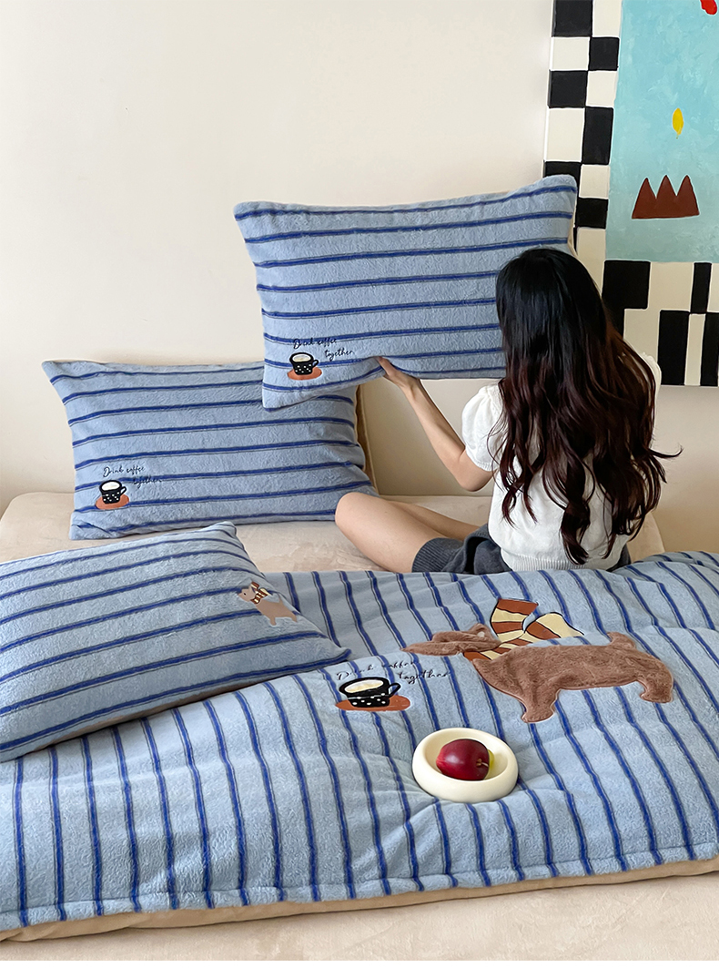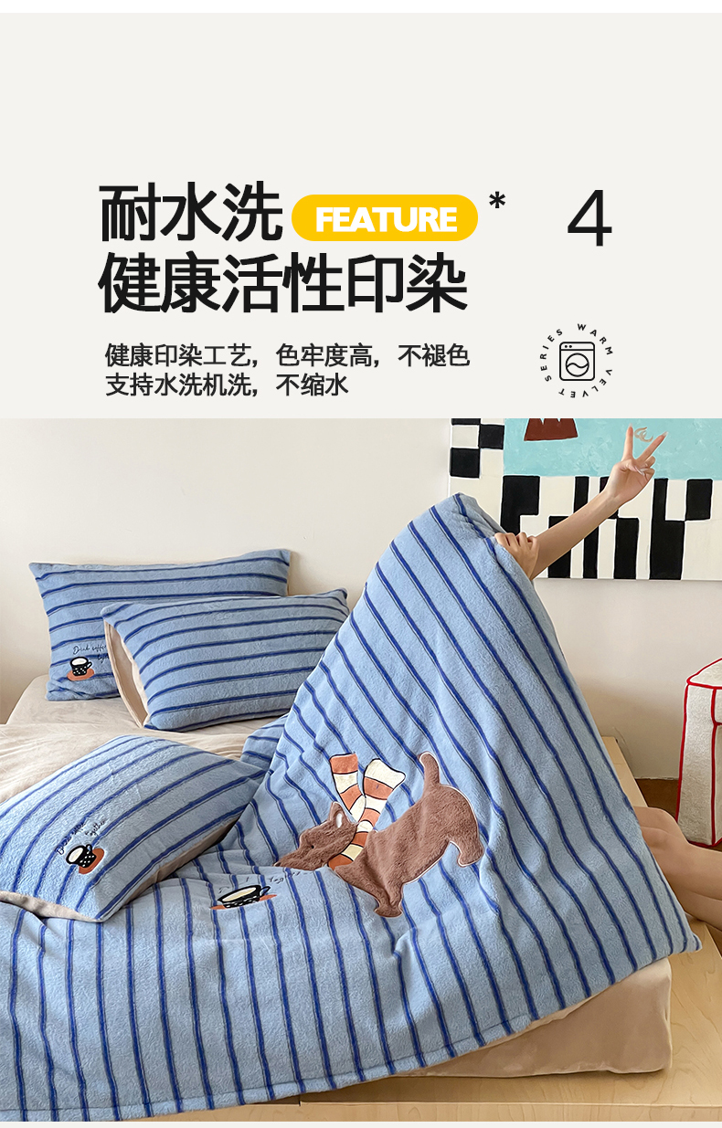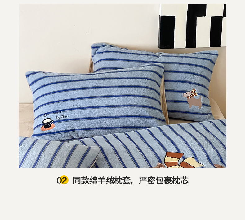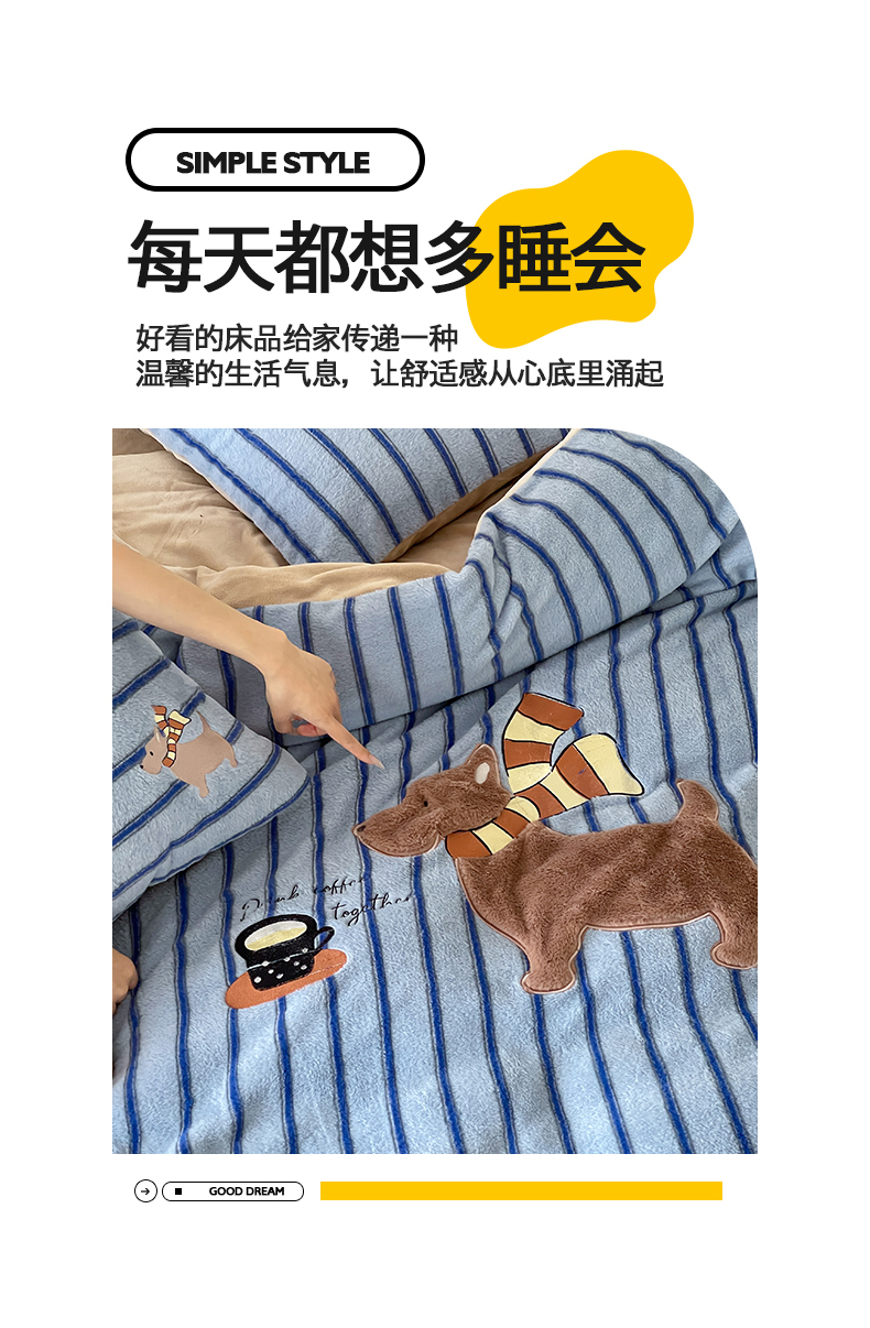 商品名称:桃子家居 2025新款A类高级仿生绵羊绒兔毛贴布绣刺绣工艺卡通少女加厚牛奶绒系列四件套 绵羊绒-蓝条咖啡狗