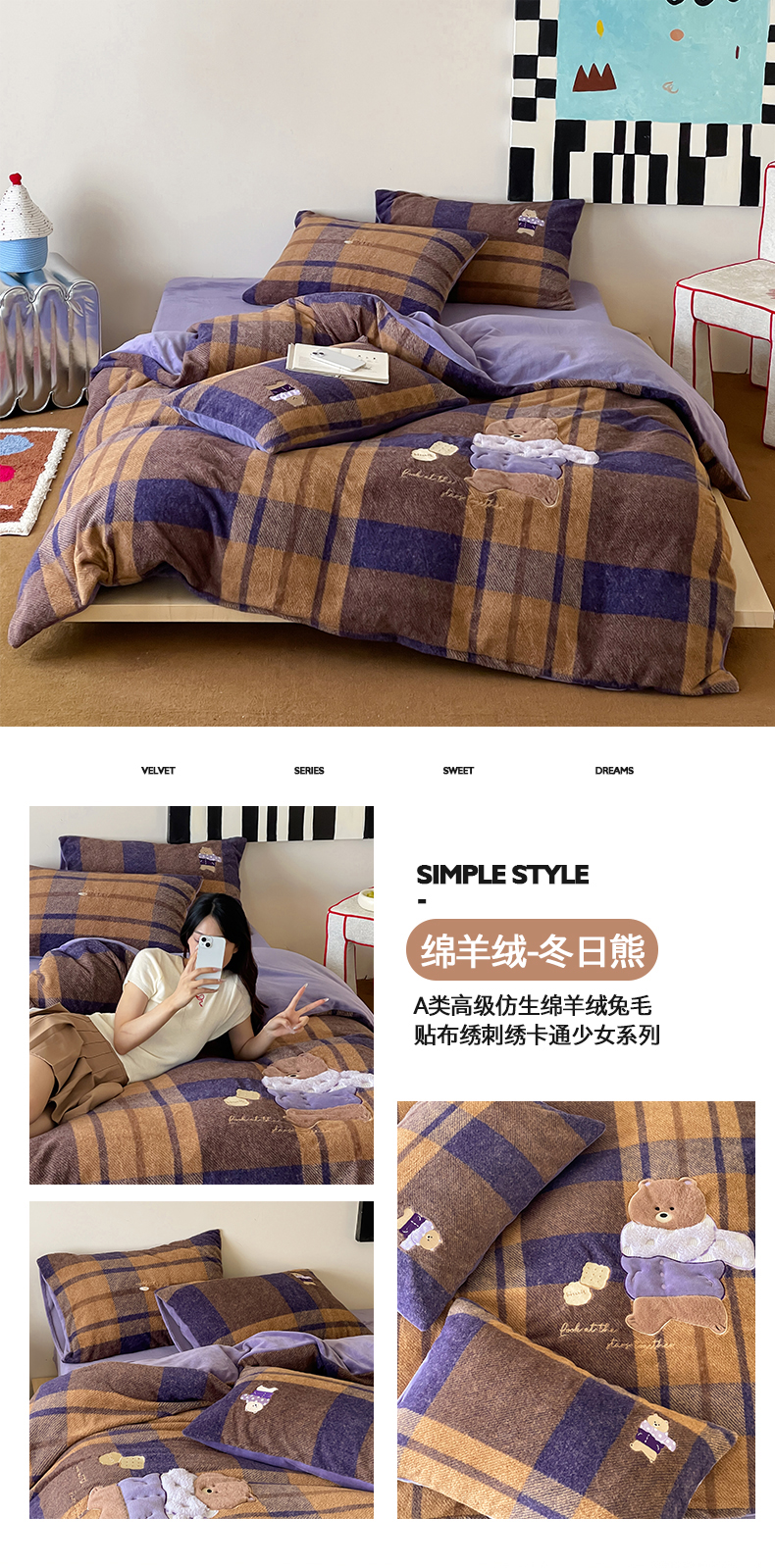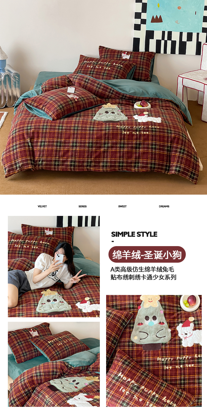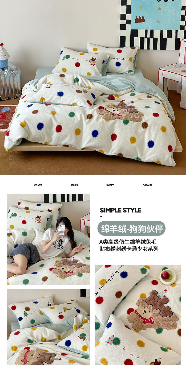 (总)桃子家居 2025新款A类高级仿生绵羊绒兔毛贴布绣刺绣工艺卡通少女加厚牛奶绒系列四件套,绵羊绒-冬日熊,绵羊绒-狗狗伙伴,绵羊绒-蓝条咖啡狗,绵羊绒-毛球猫咪,绵羊绒-圣诞小狗,绵羊绒-星星人