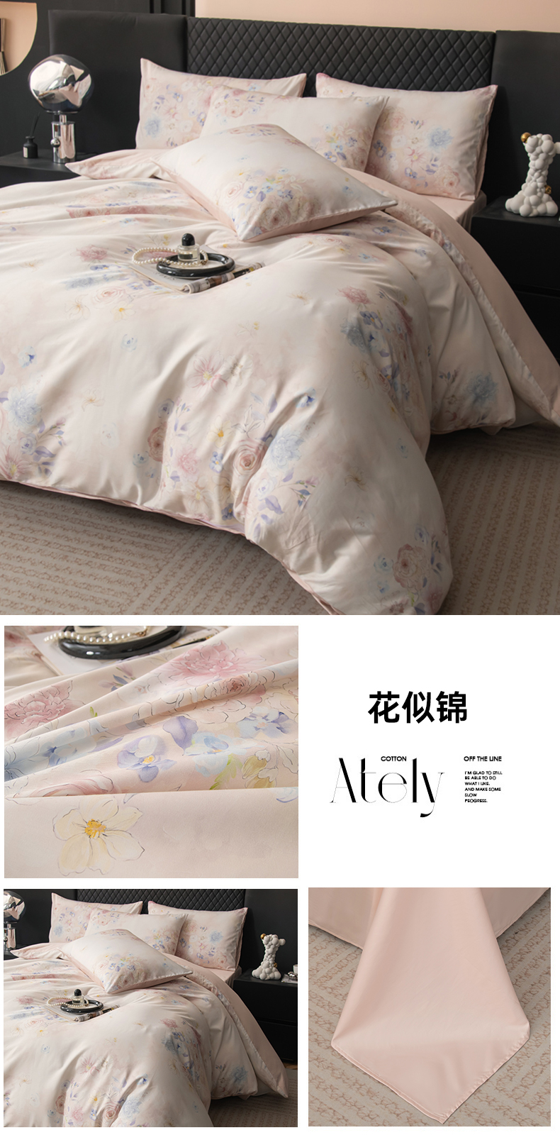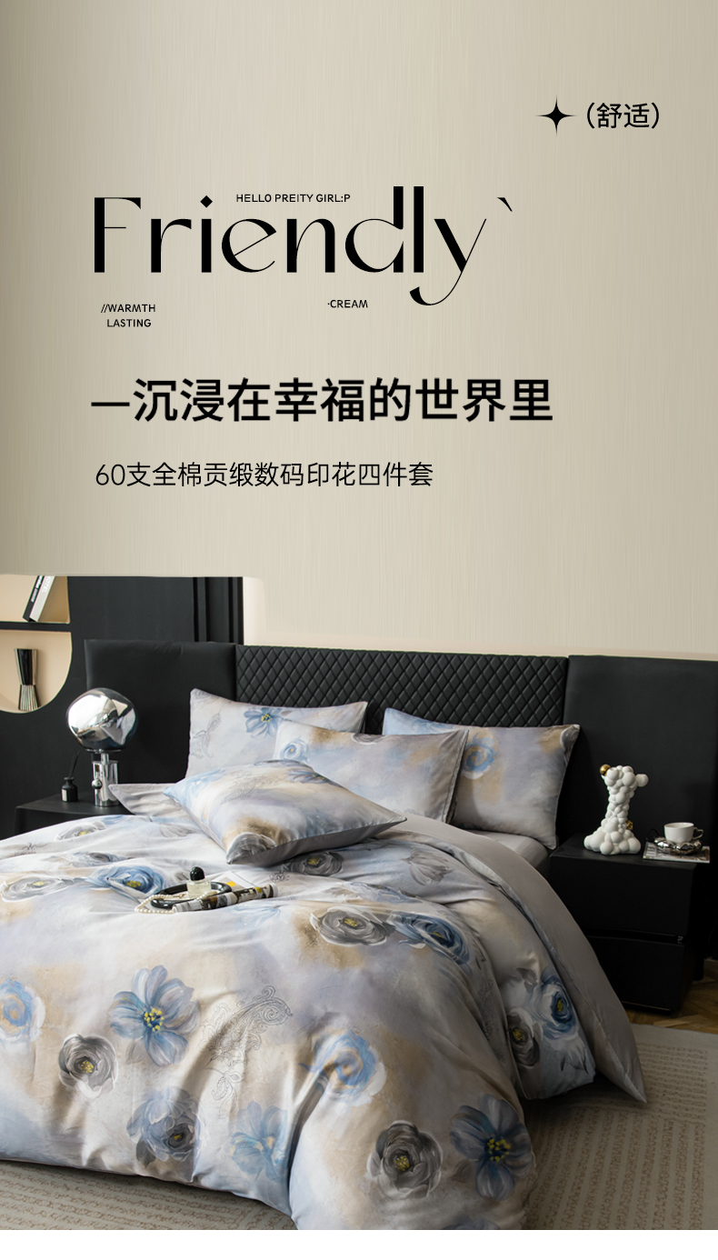 商品名称:优姿家纺 2026新款60支全棉贡缎数码印花四件套 瑞贝卡