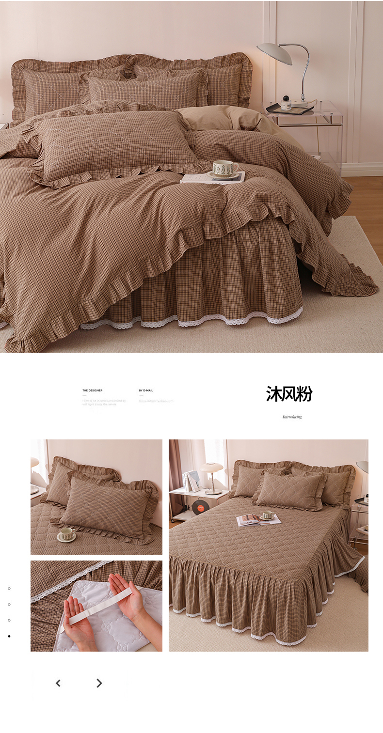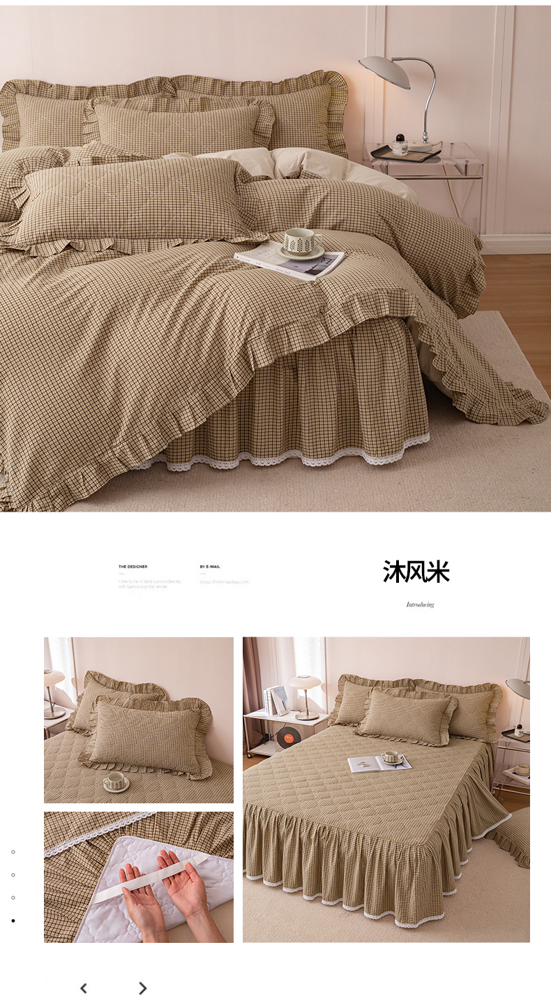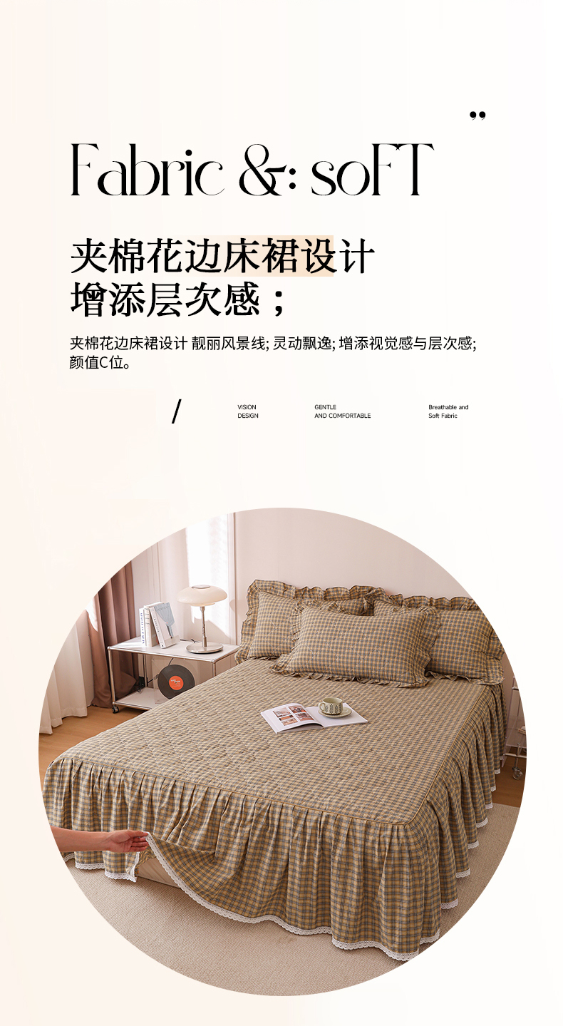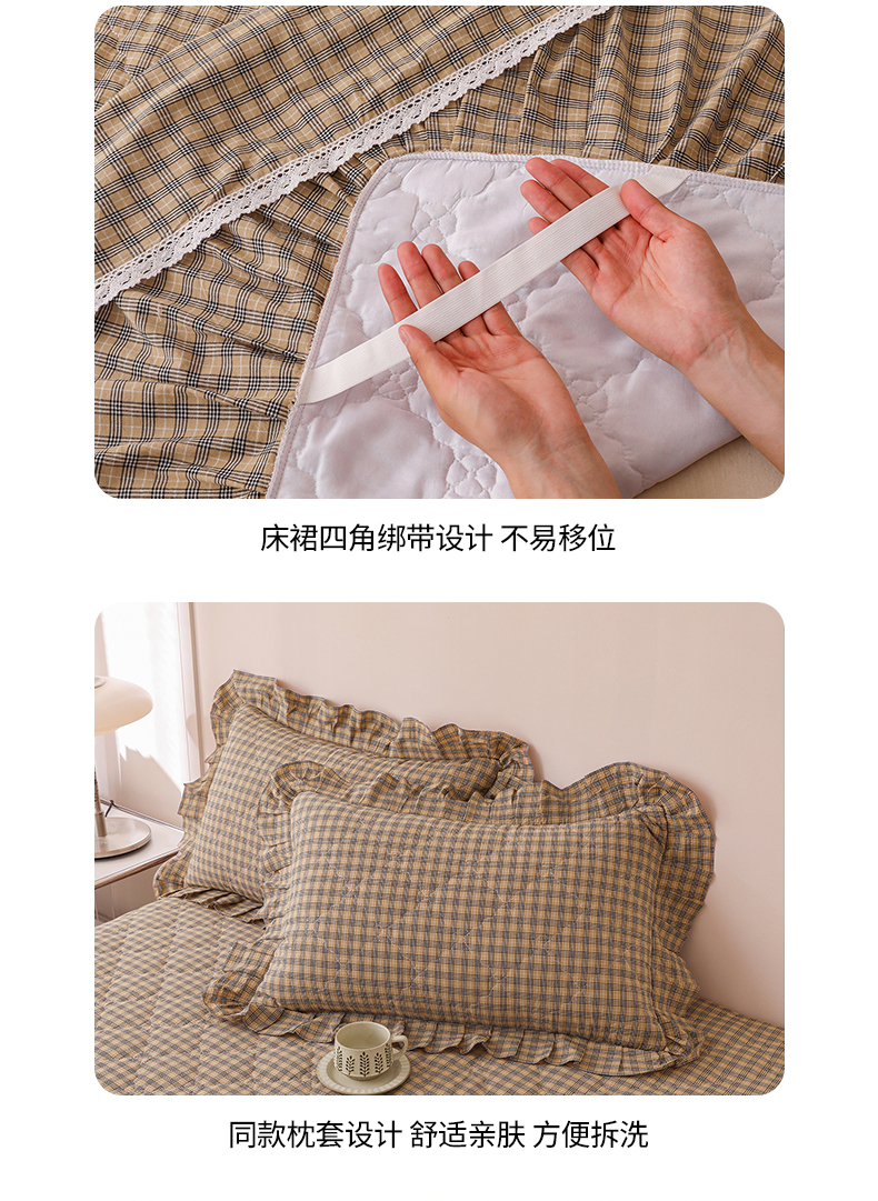 商品名称:(总)依蔓羽 2026年新款A类全棉色织水洗棉夹棉绗缝床裙四件套米朵【专注面料品质和做工】 100%全棉精梳紧密纺色织水洗棉面料,柔软舒适,退货率低(并非市面上粗糙气流纺面 料)