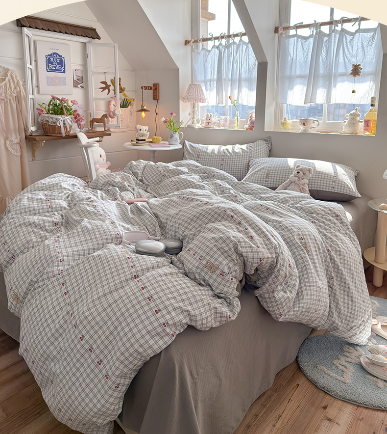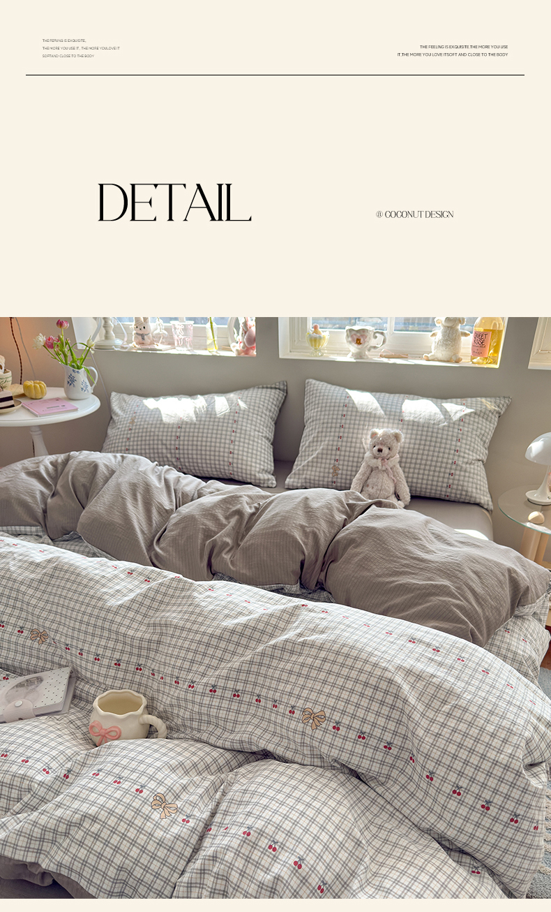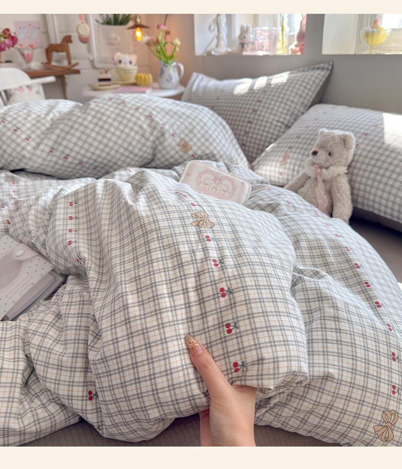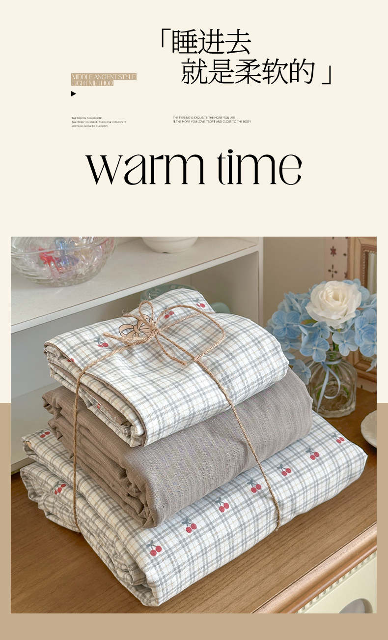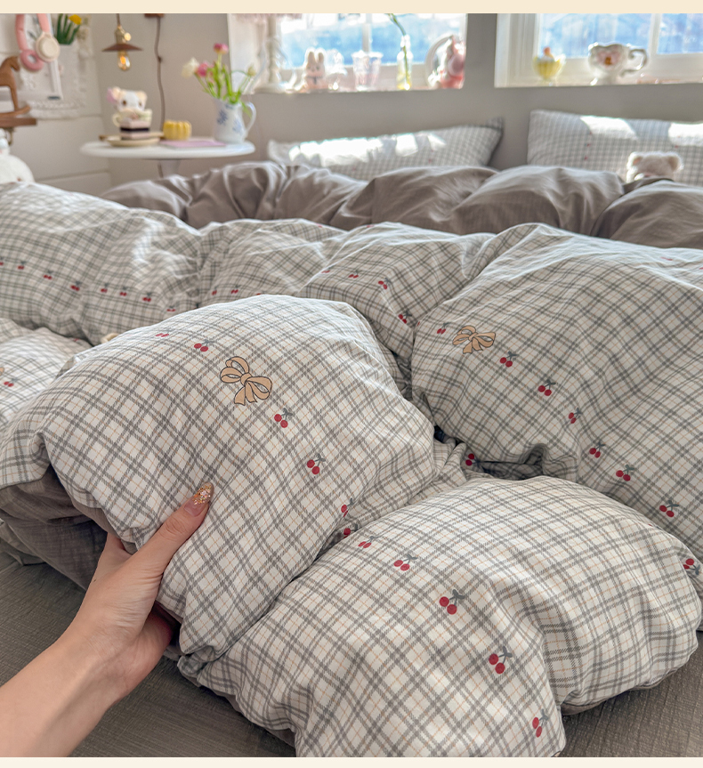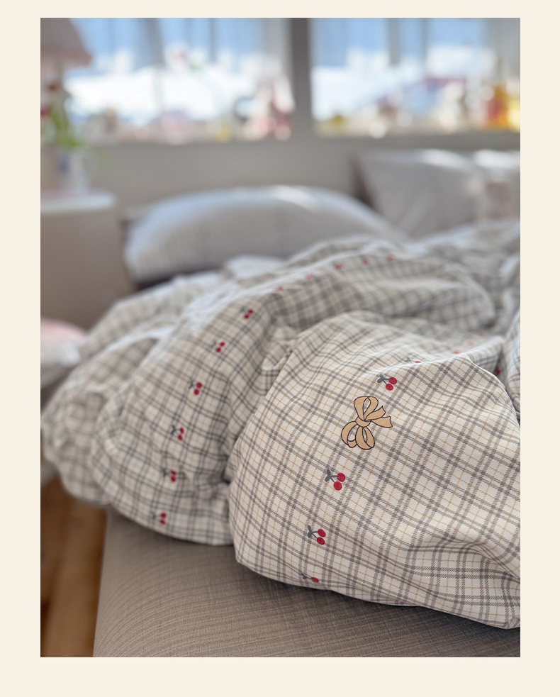 当前位置: 91家纺网 > 商品网购 > 床品套件 > 四件套 > 化纤普通四件套 > 罗亿家纺 2026新款A类古法水洗仿棉云感纱四件套 樱桃格格