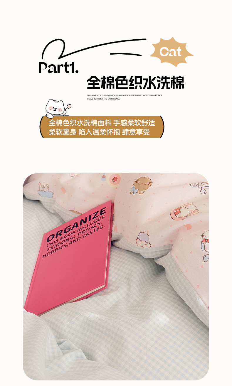 (总)雅居纺家纺 2026新款全棉色织水洗棉毛巾绣猫咪四件套,绿格猫咪,木马猫咪,派对小猫,气球猫咪,星星猫咪,幸福猫咪