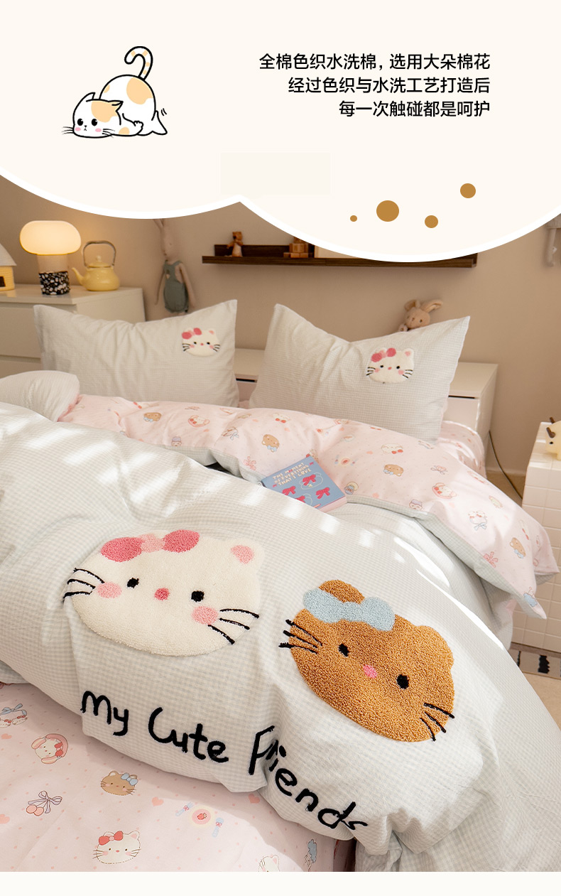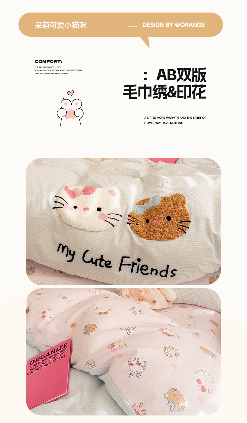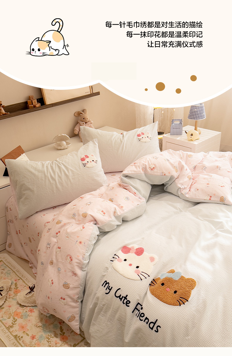 雅居纺家纺 2026新款全棉色织水洗棉毛巾绣猫咪四件套 幸福猫咪