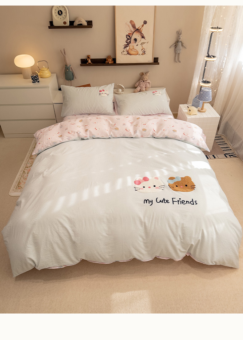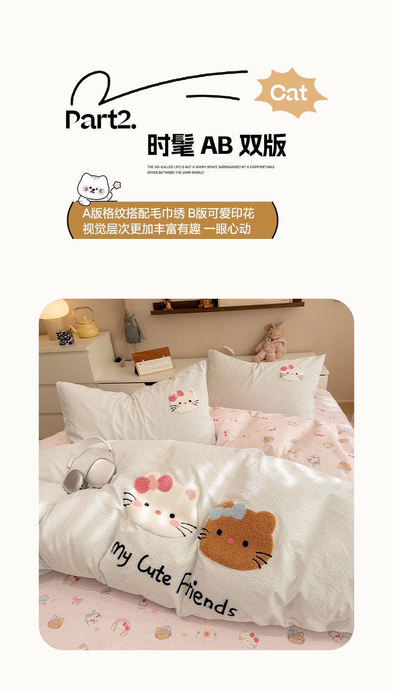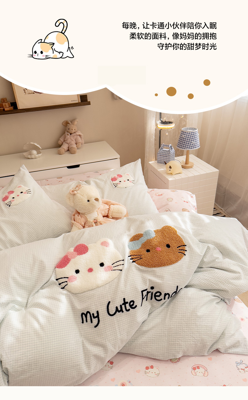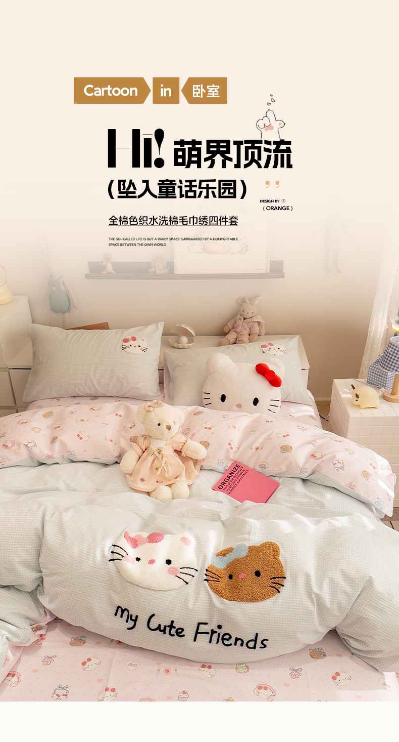 雅居纺家纺 2026新款全棉色织水洗棉毛巾绣猫咪四件套 幸福猫咪
