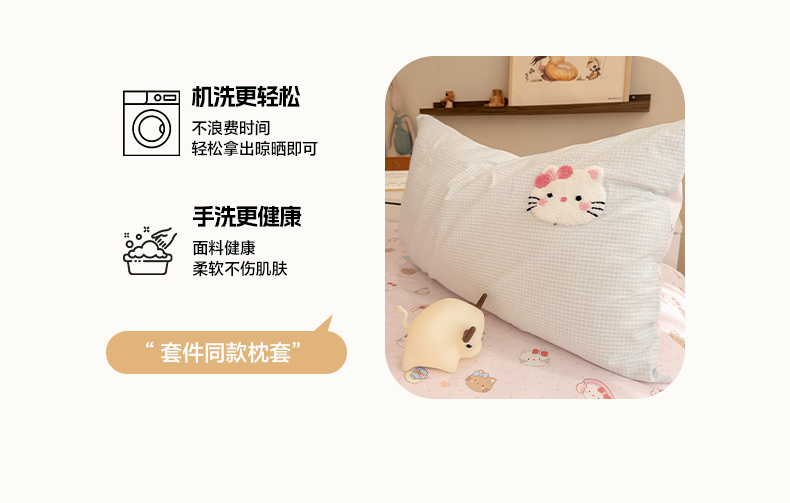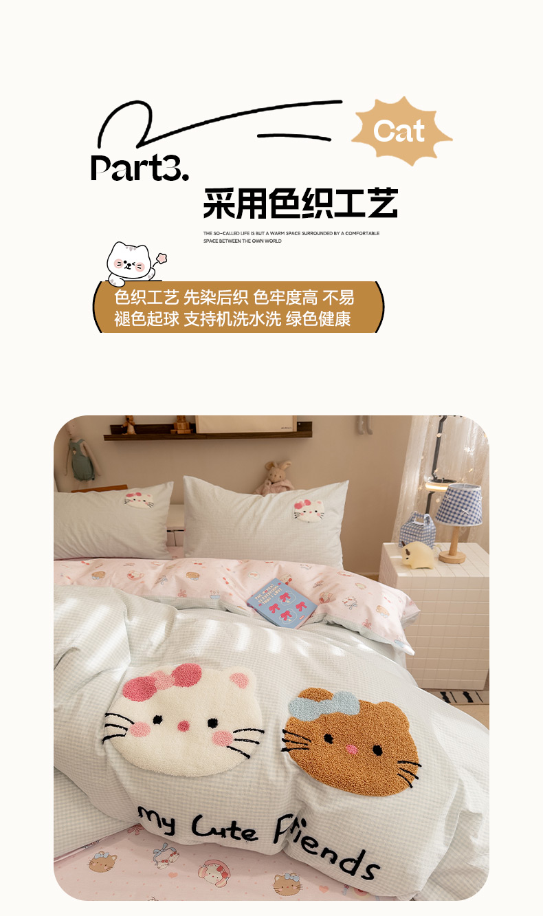 商品名称:雅居纺家纺 2026新款全棉色织水洗棉毛巾绣猫咪四件套 幸福猫咪