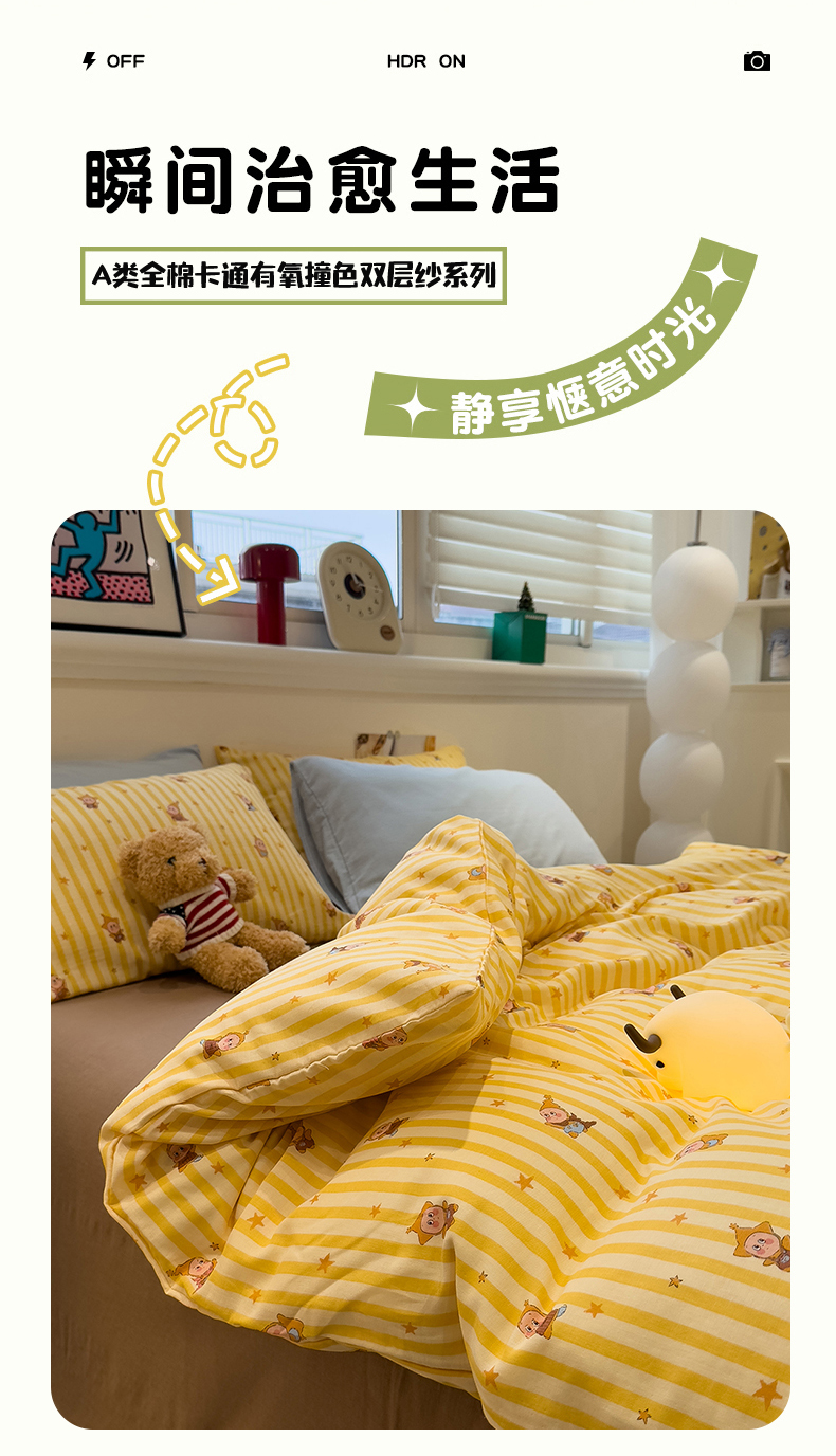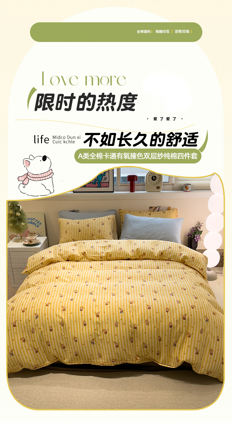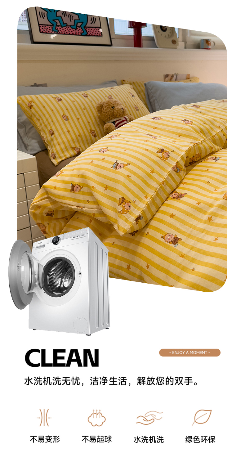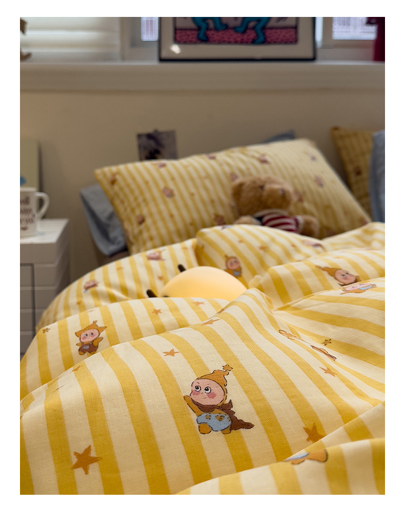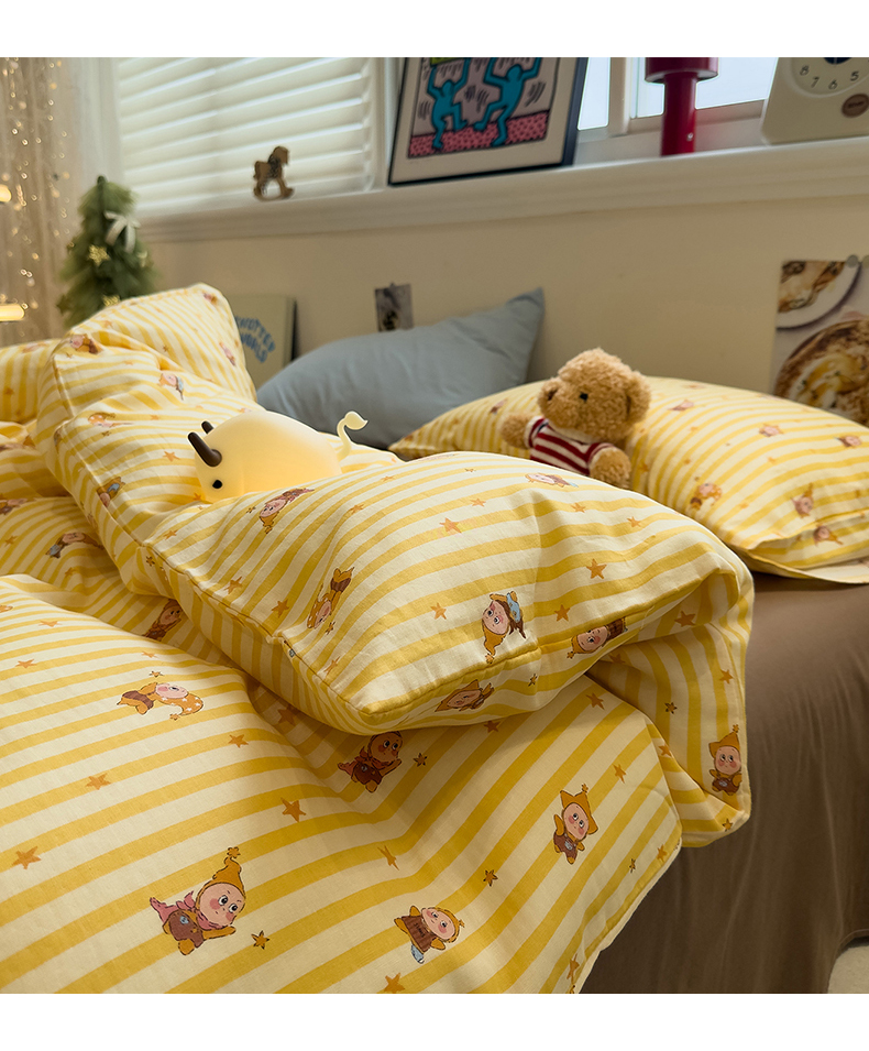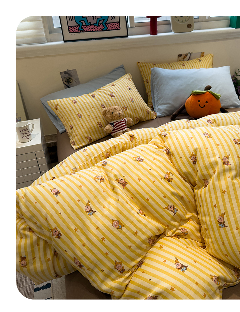 (总)呗旺鹿 2026新款全棉纯棉40支13070卡通印花四件套-场景二,萌星,鼻涕狗,果子象,机灵猫,可爱星人,幸福小熊