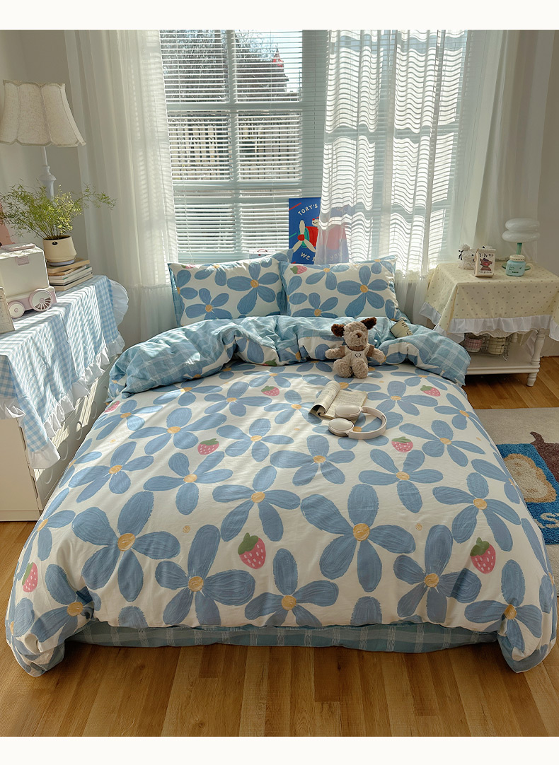 雅居纺家纺 2026新款全棉小清新印花四件套 草莓蓝花