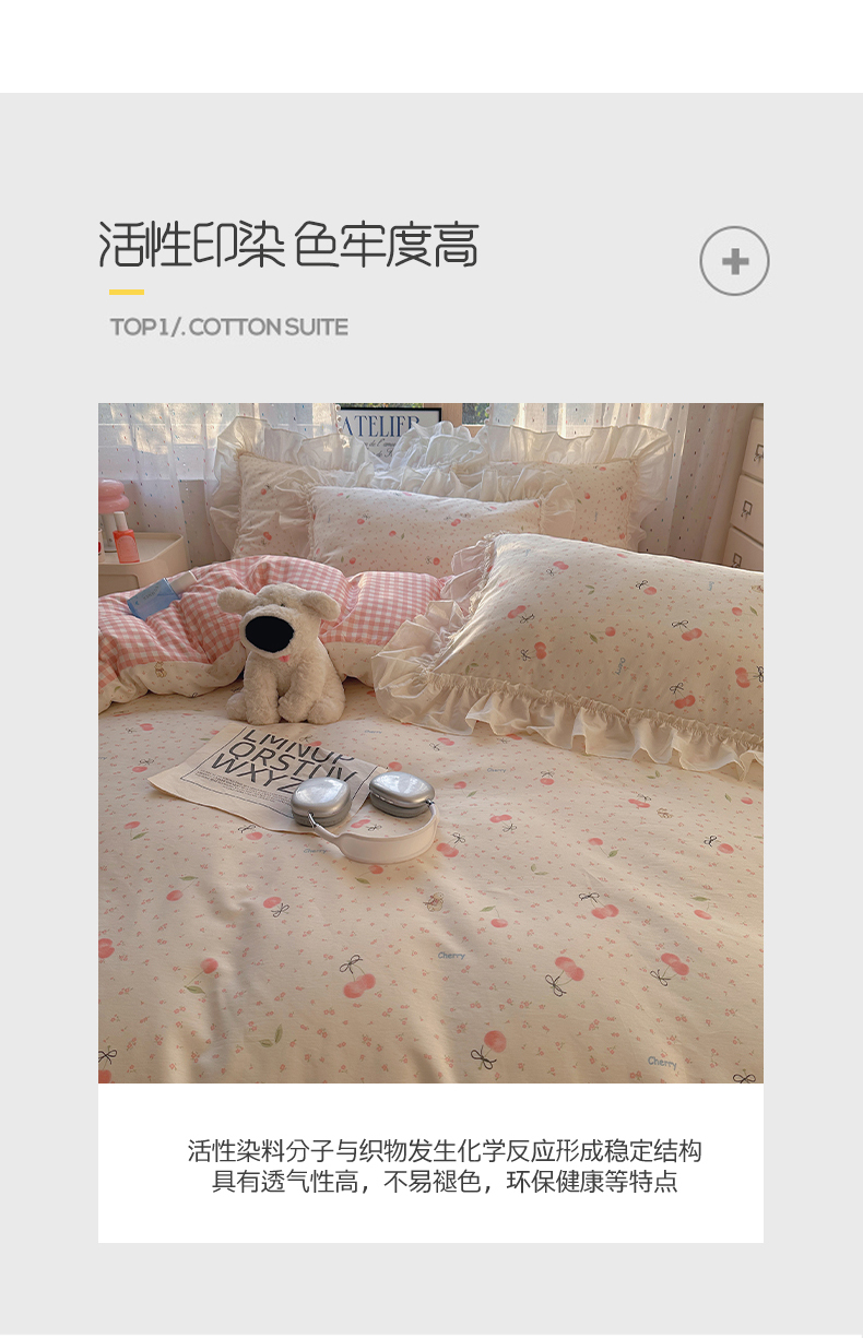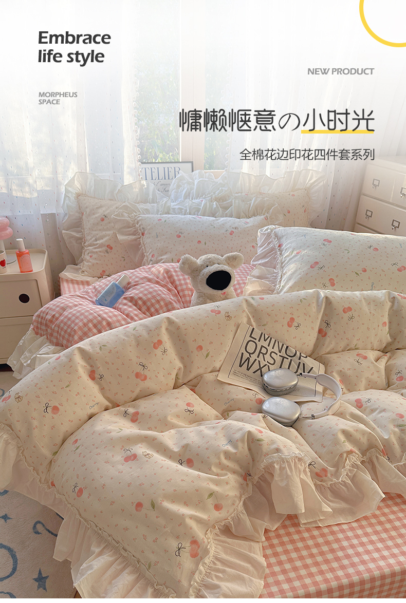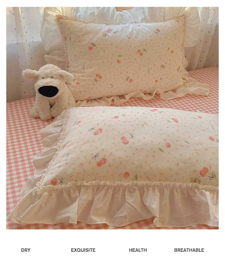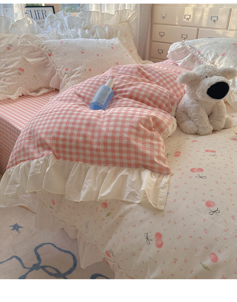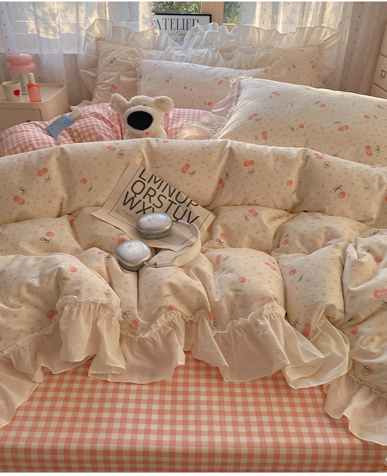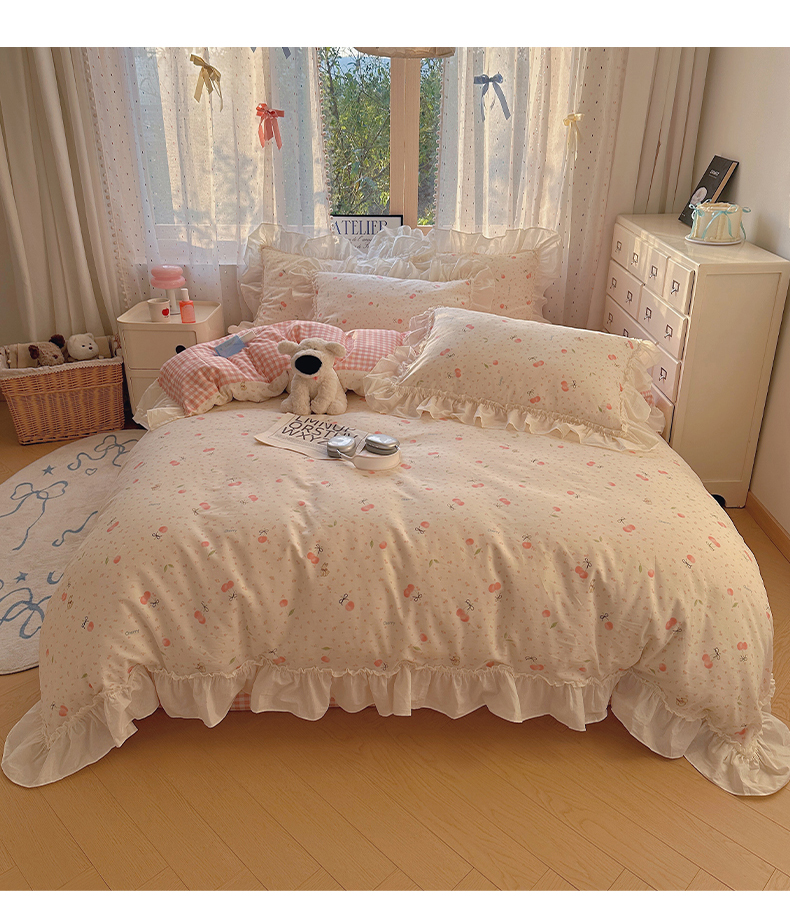 当前位置: 91家纺网 > 商品网购 > 床品套件 > 四件套 > 全棉普通四件套 > 瑞莱 2026春夏新款全棉纯棉印花韩系卡通花边四件套 樱桃甜宠