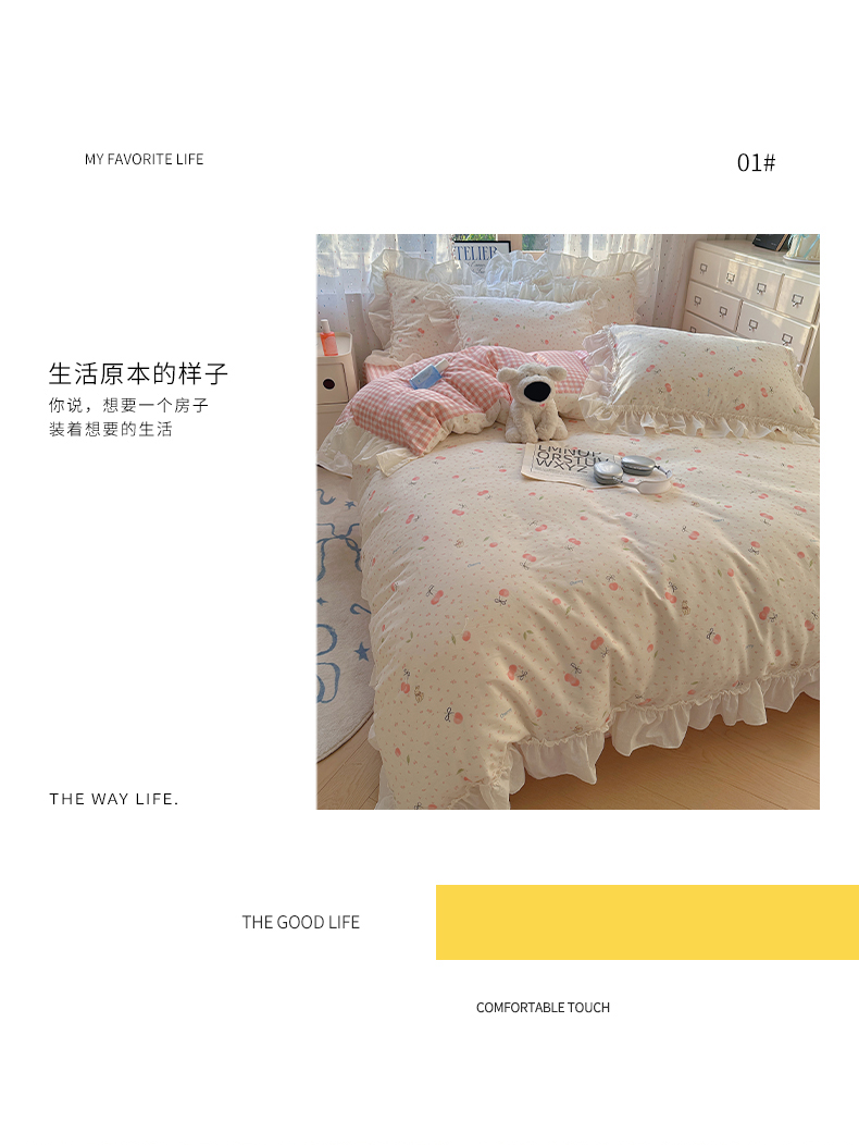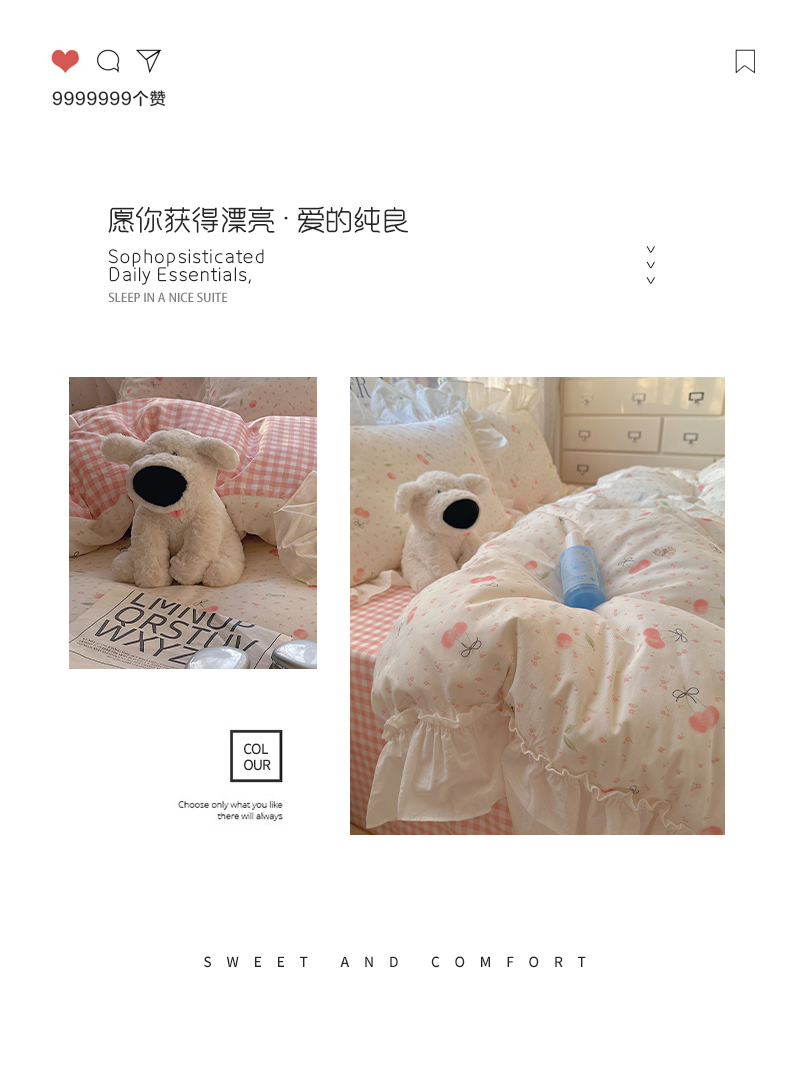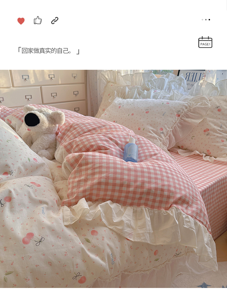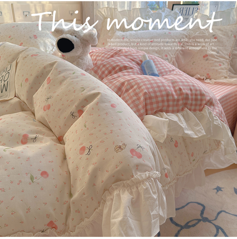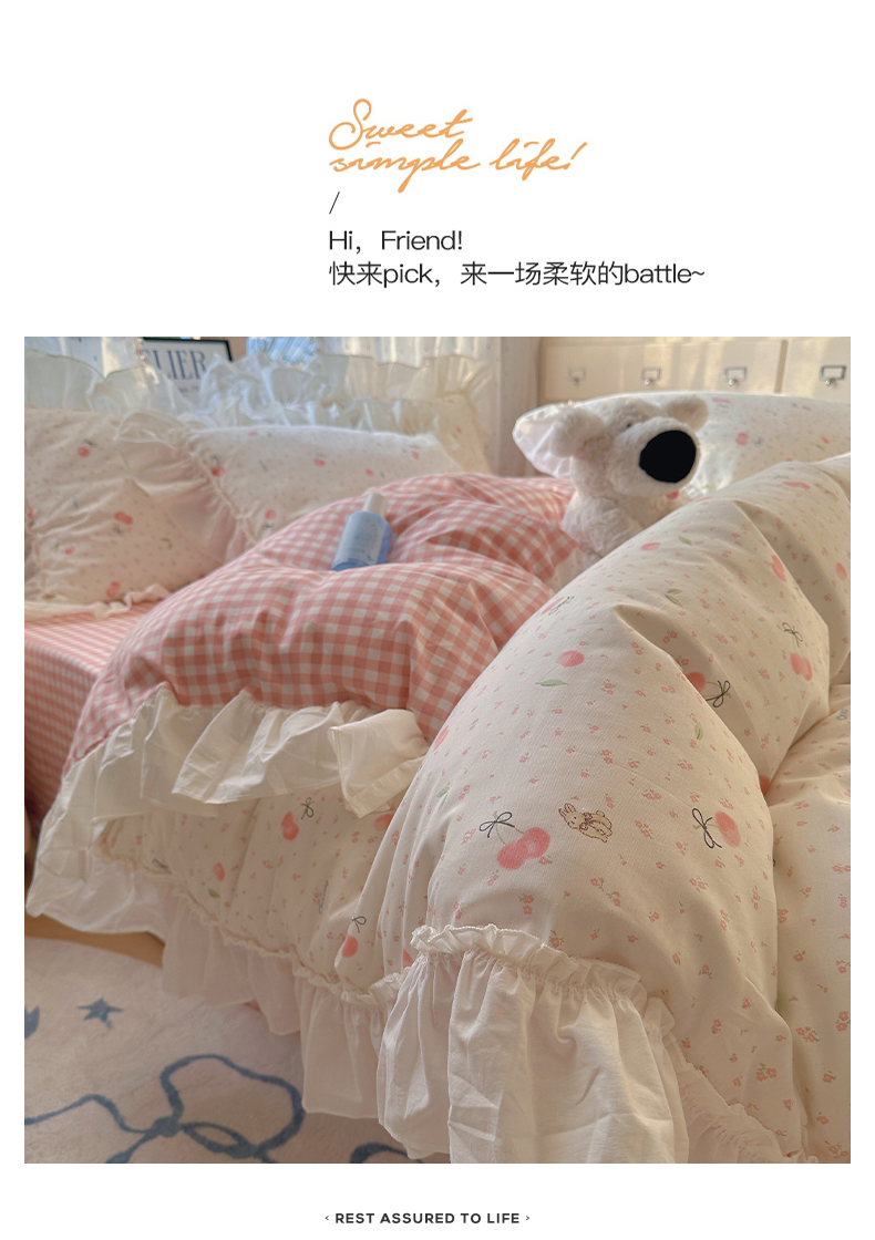 当前位置: 91家纺网 > 商品网购 > 床品套件 > 四件套 > 全棉普通四件套 > 瑞莱 2026春夏新款全棉纯棉印花韩系卡通花边四件套 樱桃甜宠