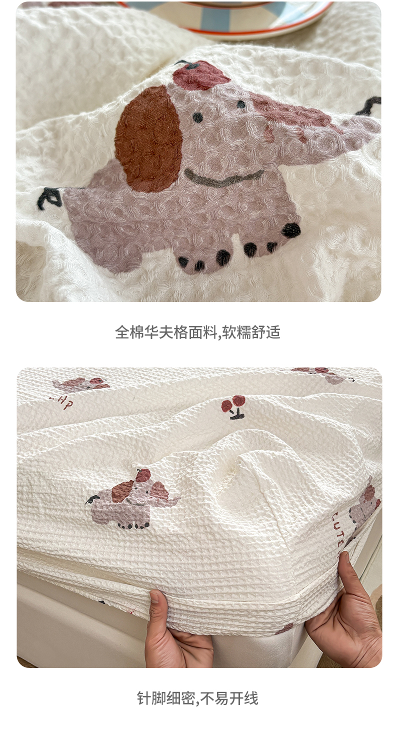 (总)居眠 2026新款全棉印花华夫格床笠,彩带条,花眠,条纹粉,细灰条,小斑点,小樱桃,樱桃小象,月亮星星,组合叠拍图