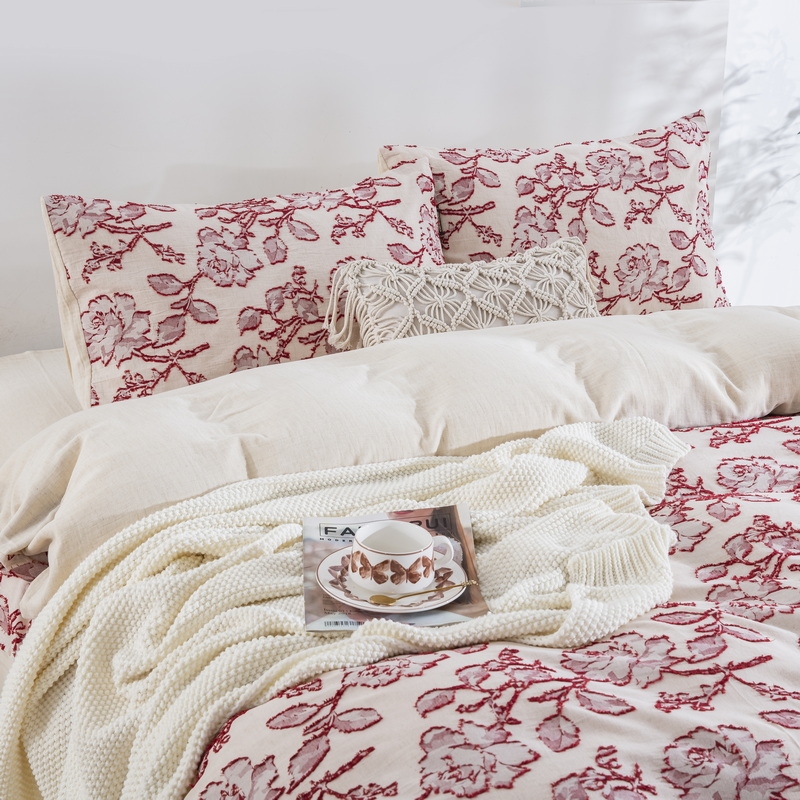 (总)双层纱家居 2026新款全棉纯棉色织提花拼角飞边款四件套-郁金花园正红,郁金花园正红