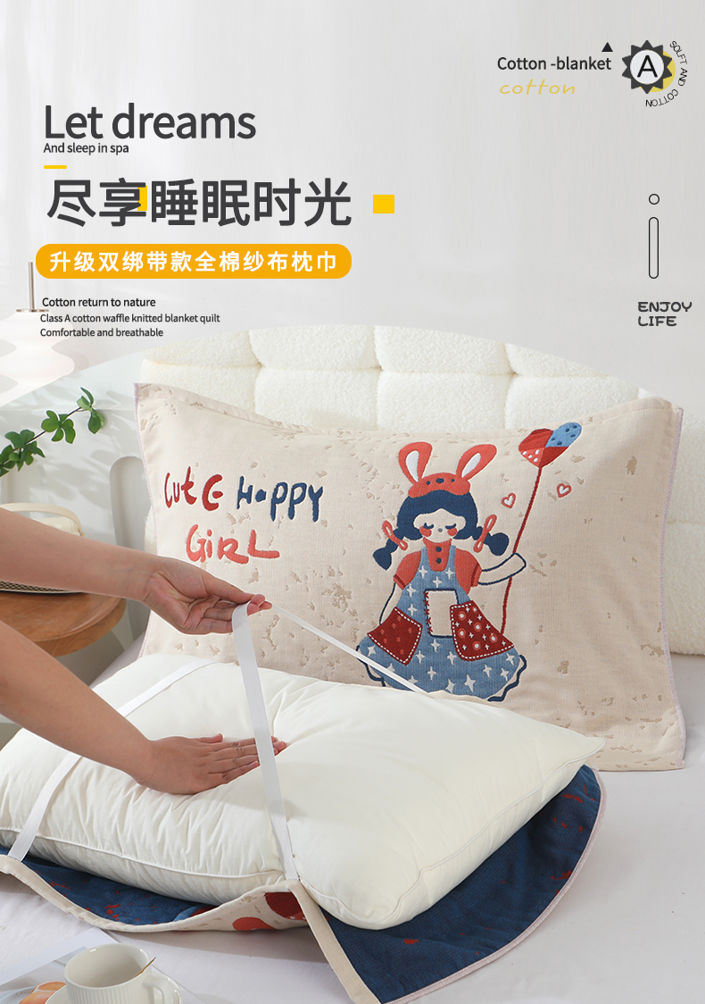 (总)娇兰毛巾 2025新款7A抗菌全棉A类加厚纱布枕巾双绑带枕巾,乐-灰,乐-蓝,乐-粉,乐-黄