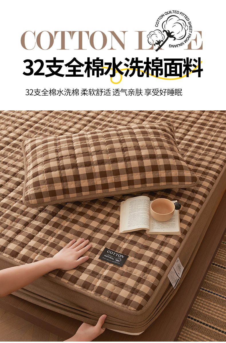 3C 2026新款全棉水洗棉棉花夹棉床笠 棕咖格