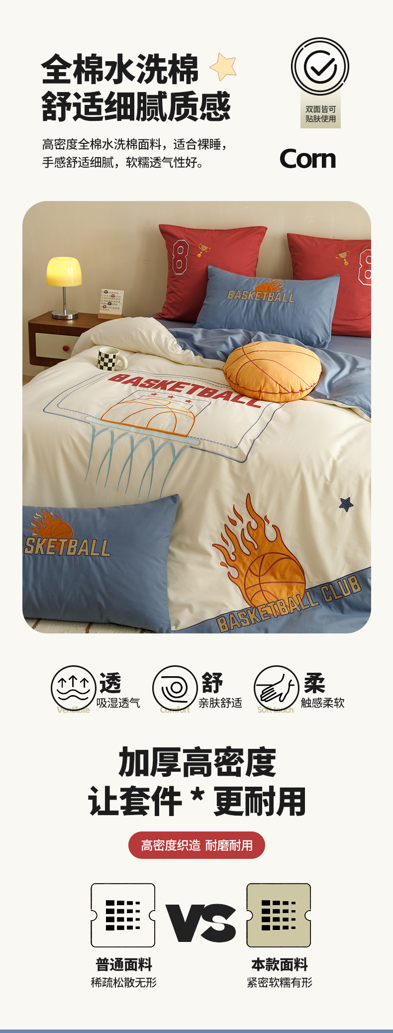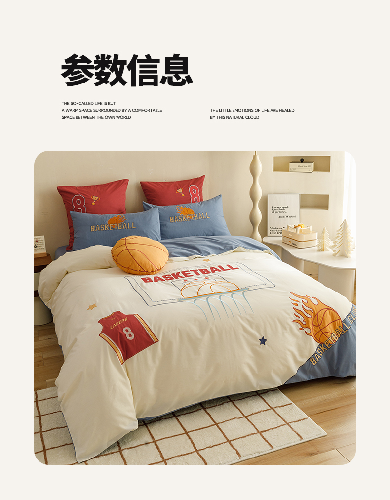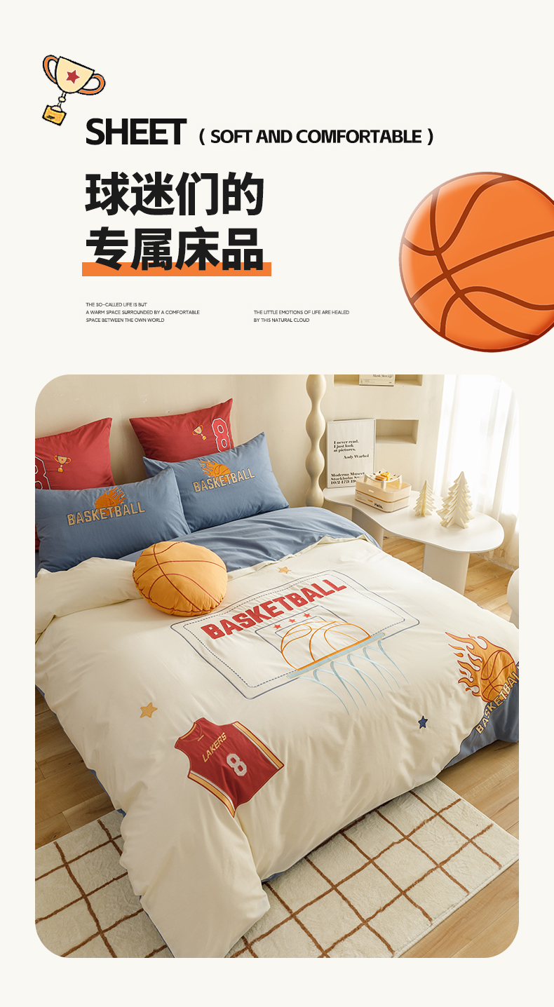 商品名称:绒梦里 2026新款A类全棉水洗棉卡通贴布绣套件三四件套 挚爱篮球-米色