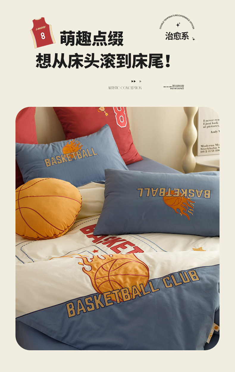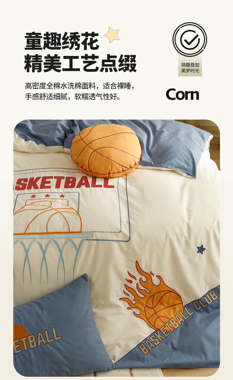 绒梦里 2026新款A类全棉水洗棉卡通贴布绣套件三四件套 挚爱篮球-米色