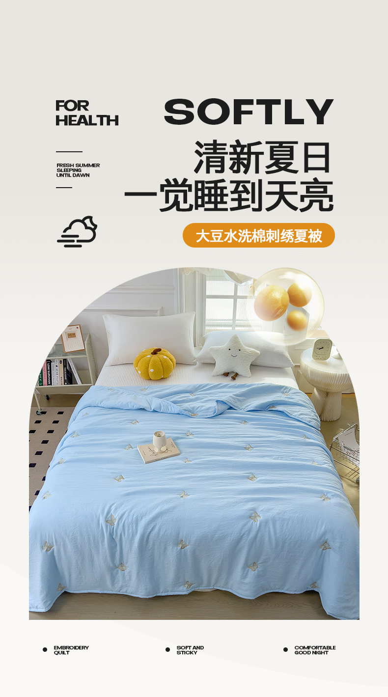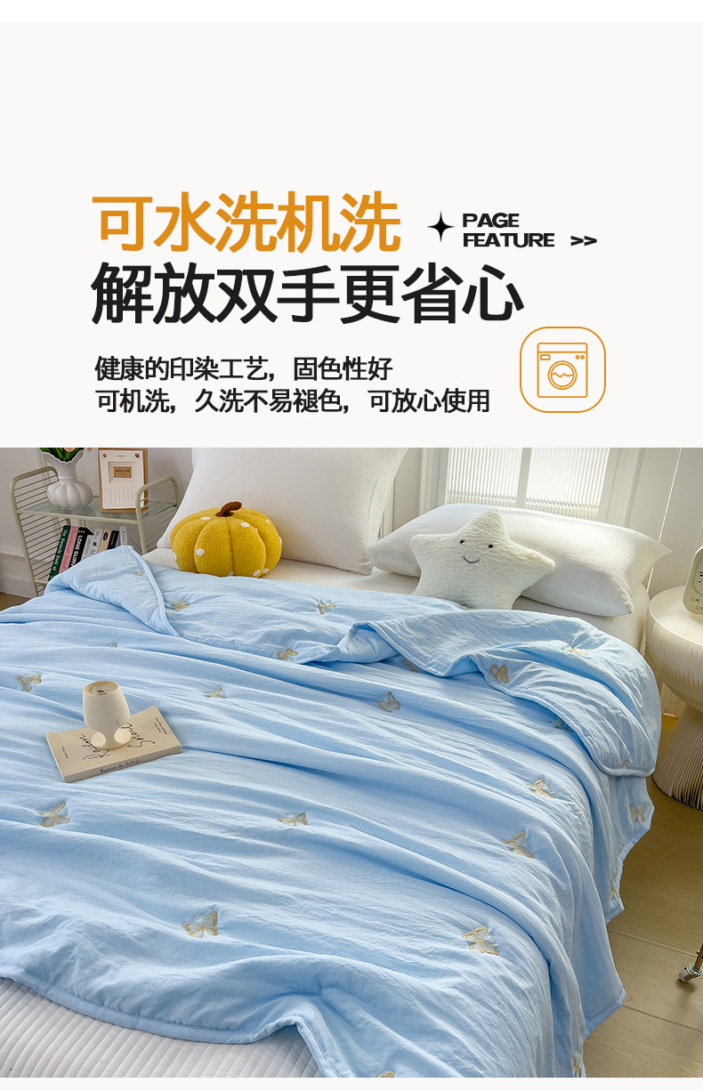 兄弟坊 2026新款水洗棉大豆刺绣夏被夏凉被空调被午睡被 蝴蝶-蓝白