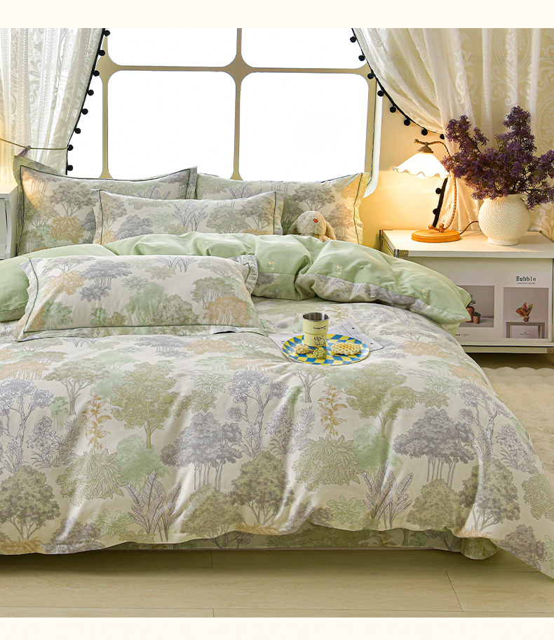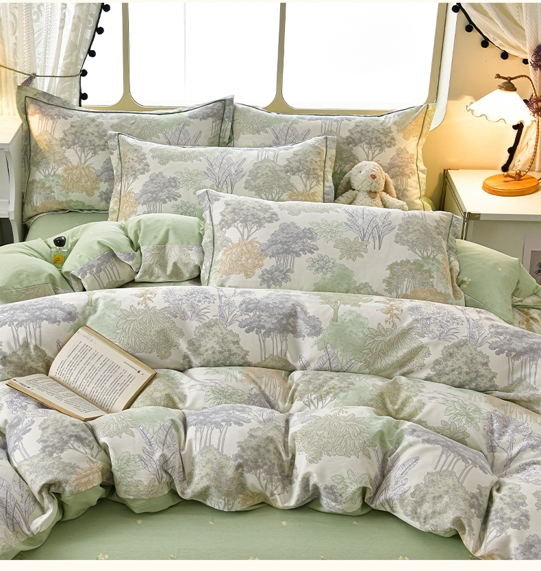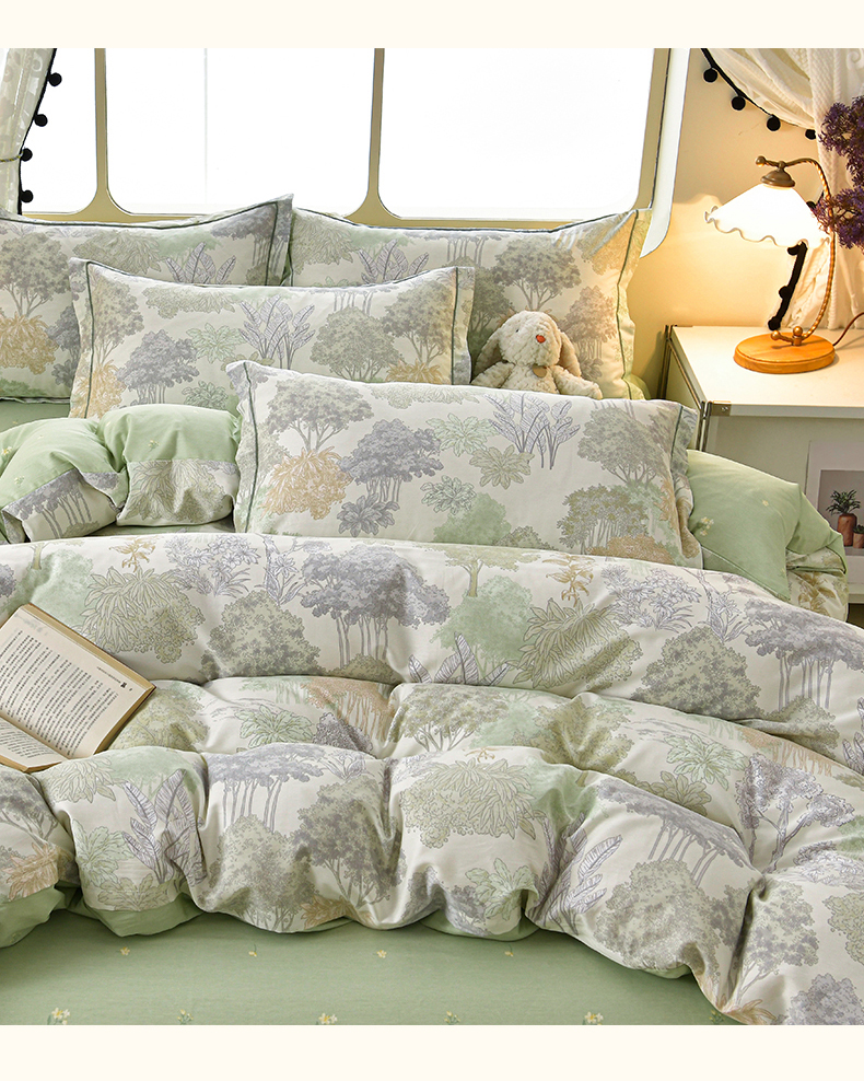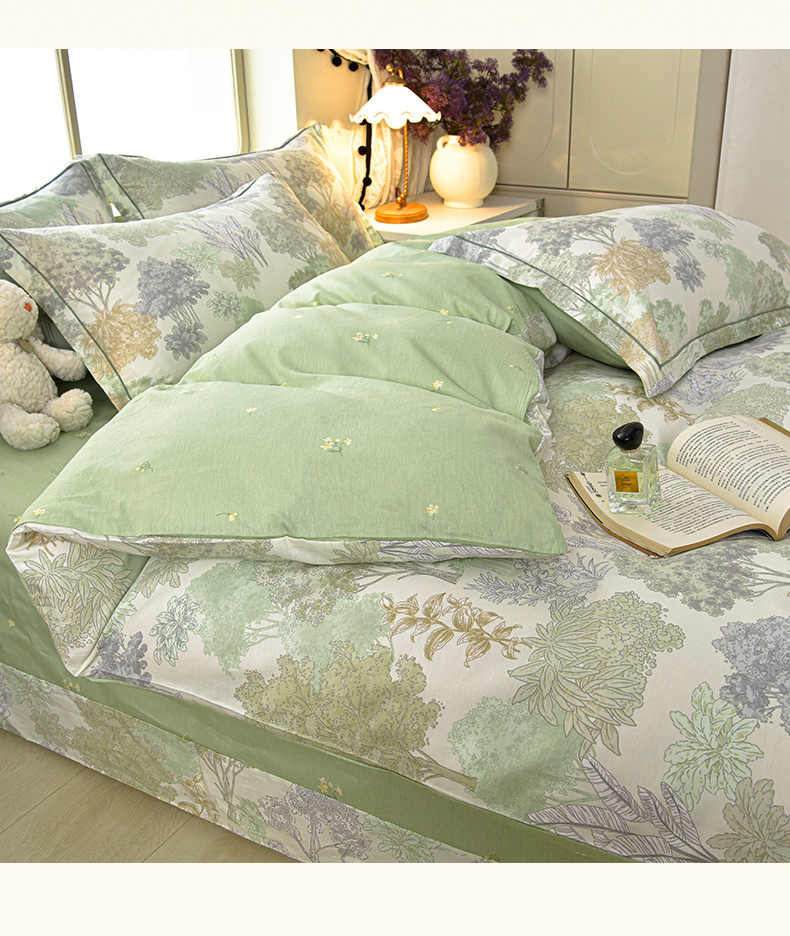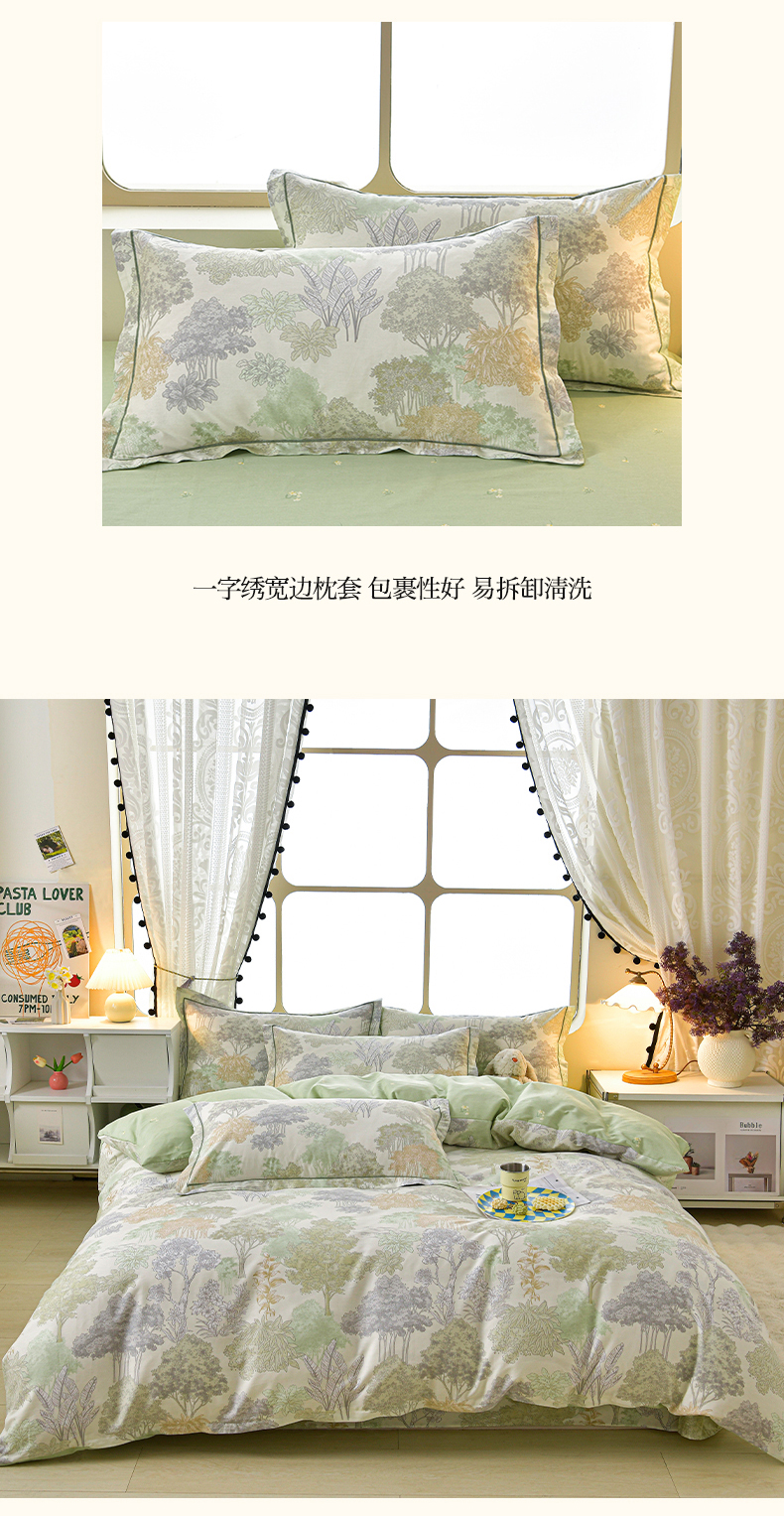 商品名称:绘萱家居 2026直播爆款一字绣吊边款纯棉100%全棉四件套印花百分百(喷气高品质) 绿叶森林