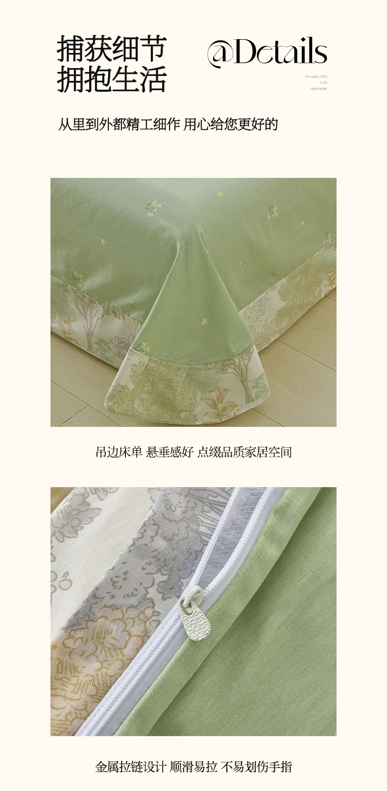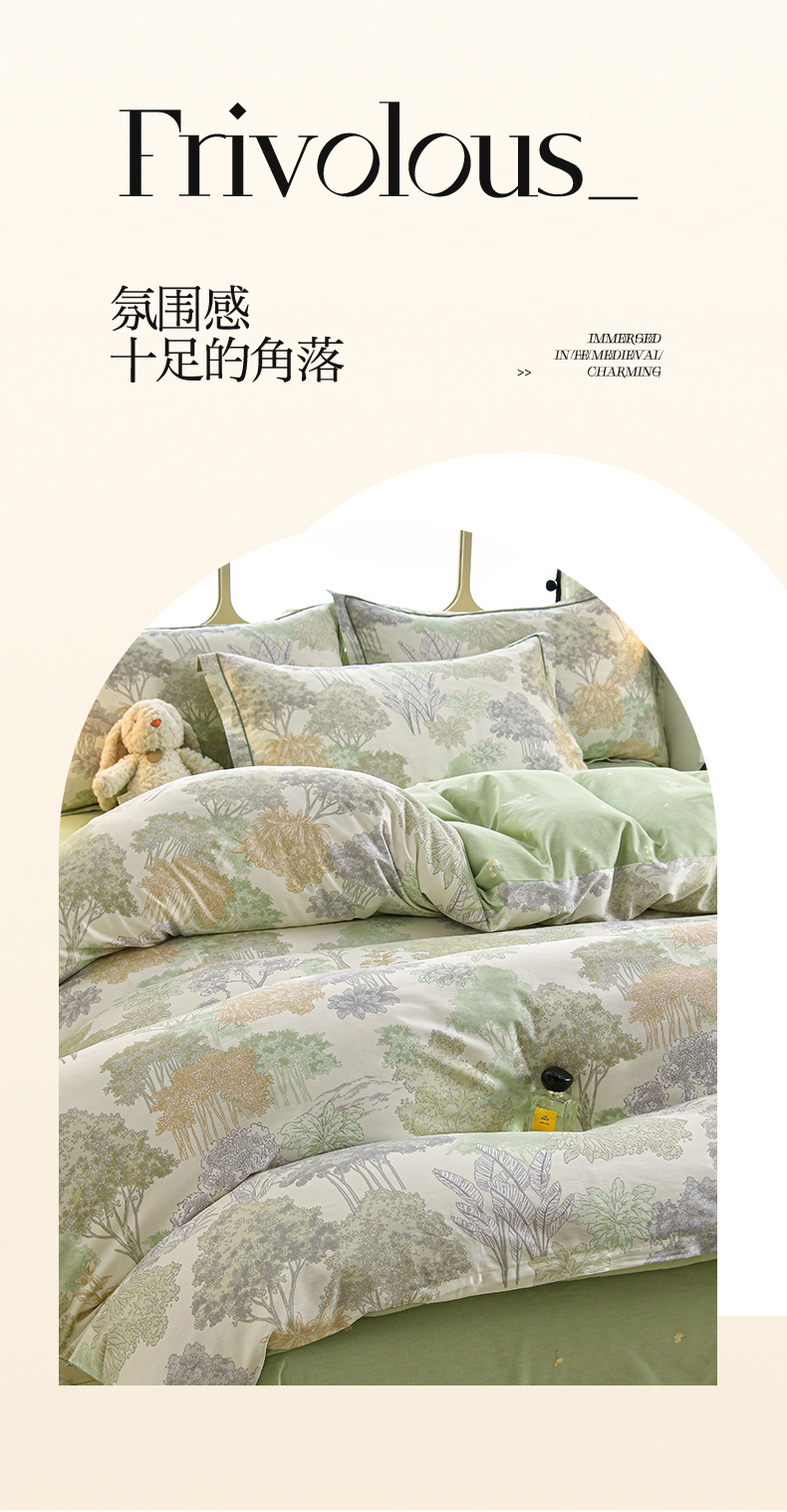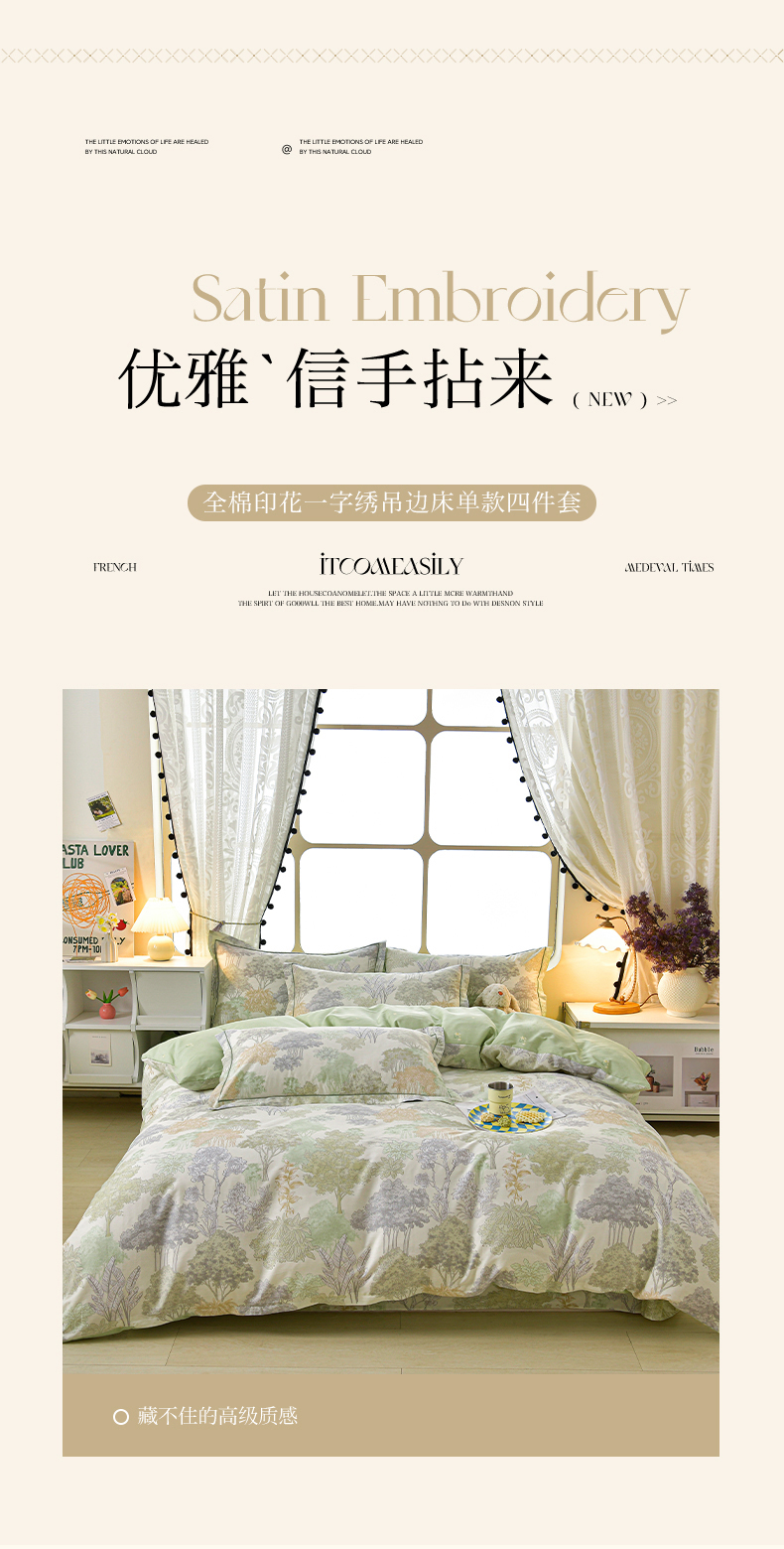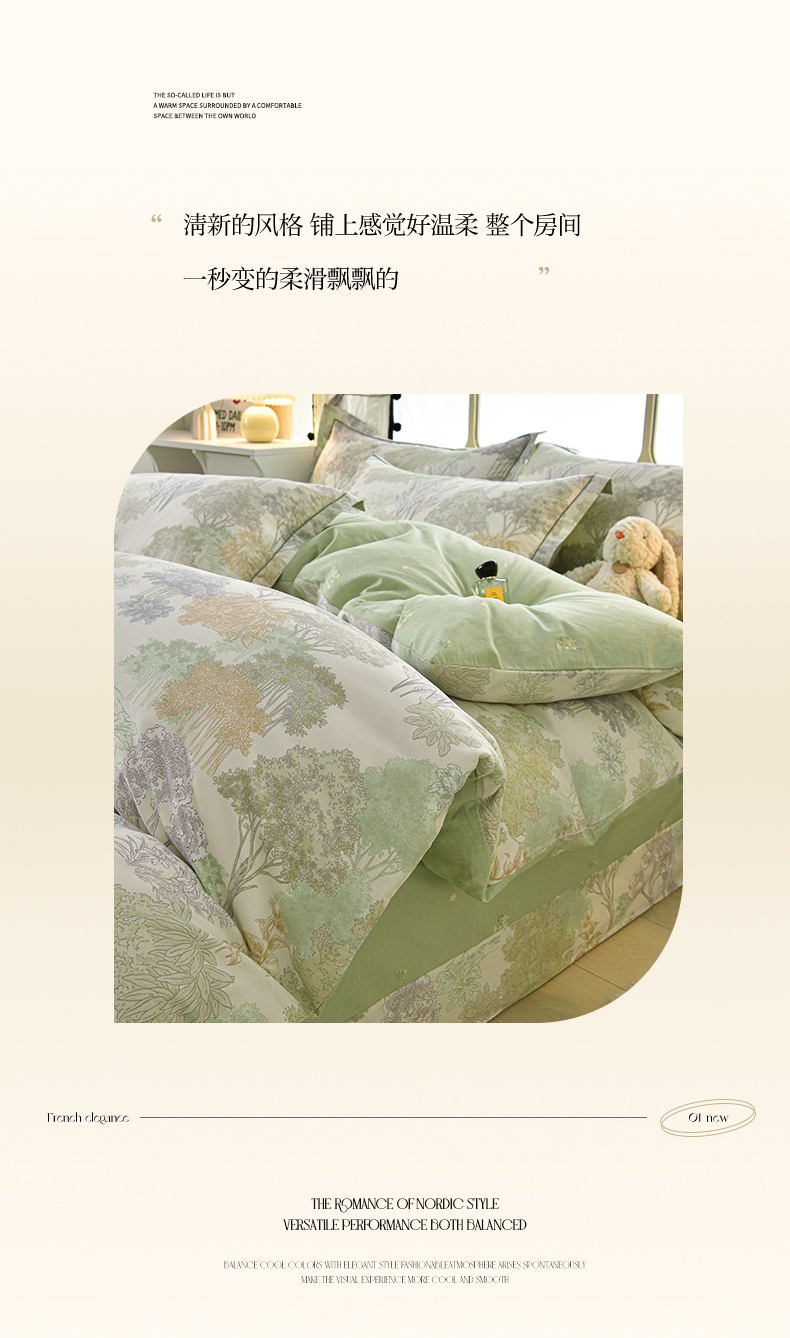 商品名称:绘萱家居 2026直播爆款一字绣吊边款纯棉100%全棉四件套印花百分百(喷气高品质) 绿叶森林