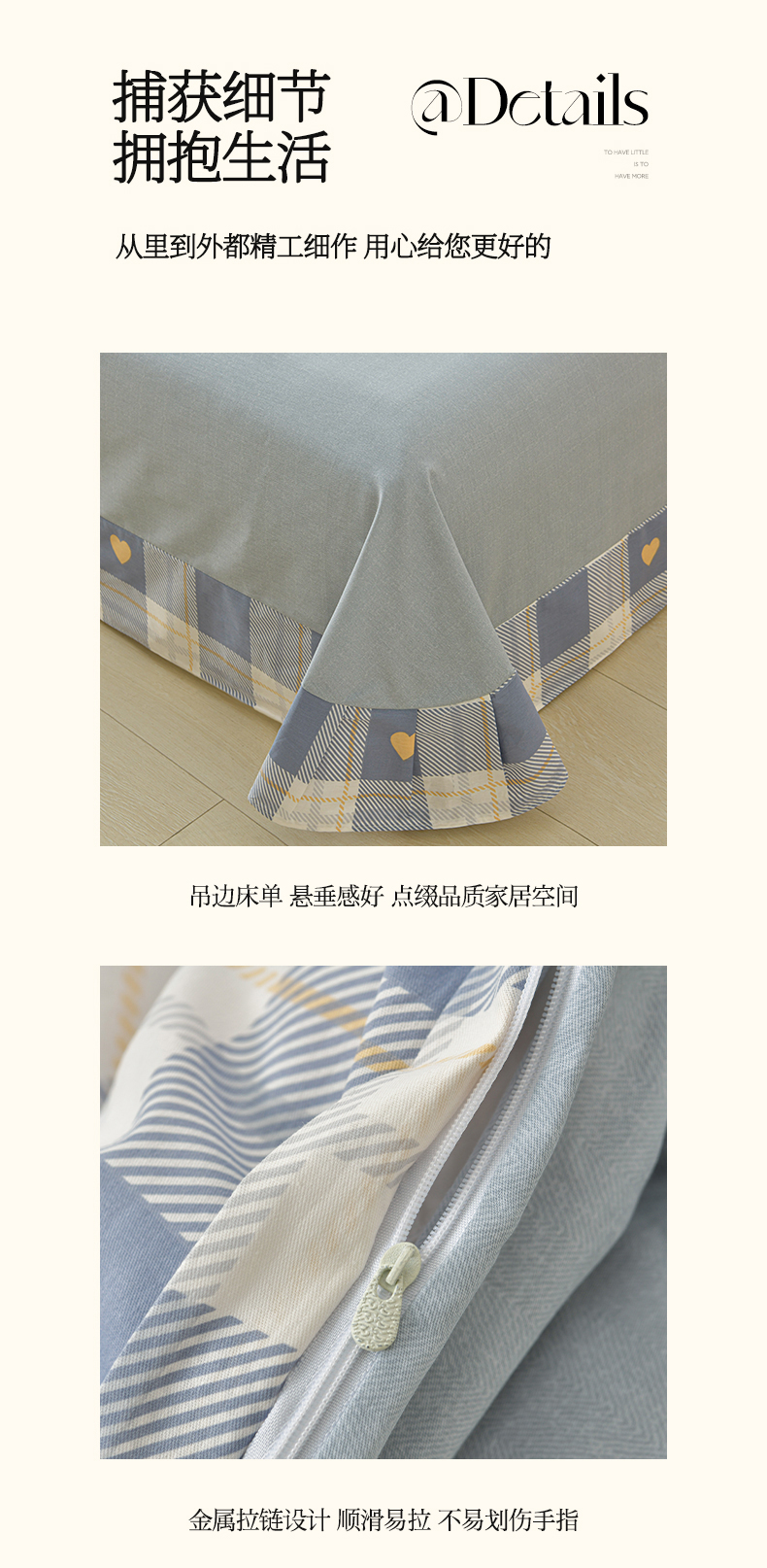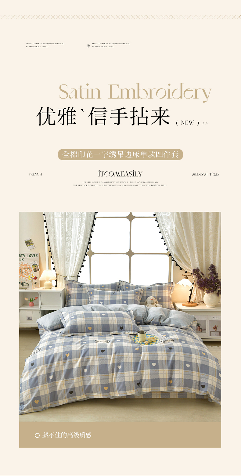 商品名称:绘萱家居 2026直播爆款一字绣吊边款纯棉100%全棉四件套印花百分百(喷气高品质) 心晴格语