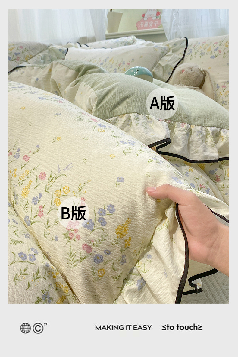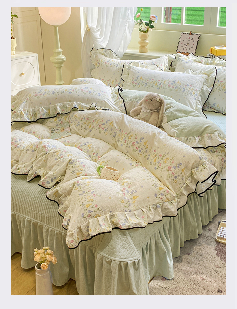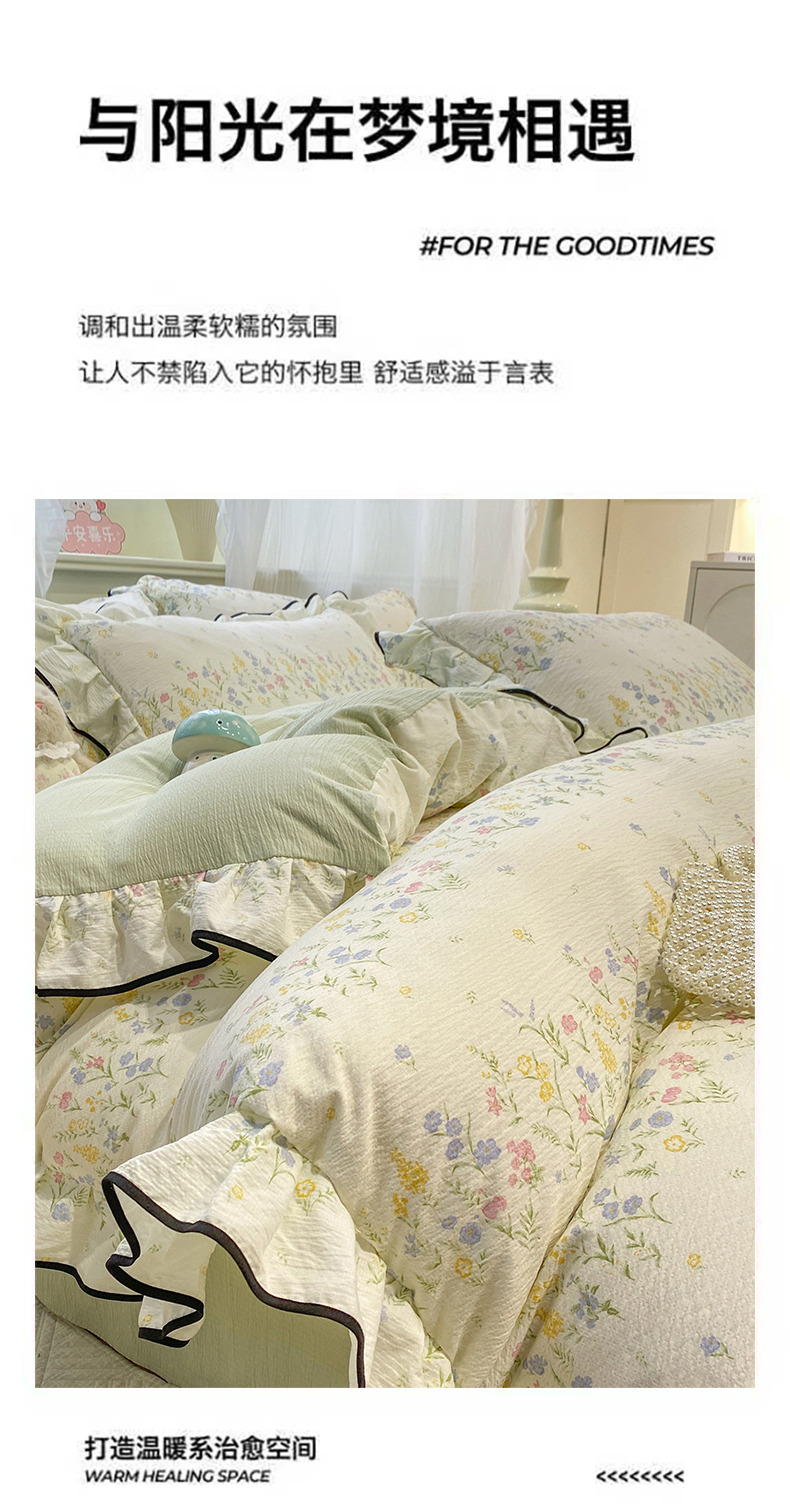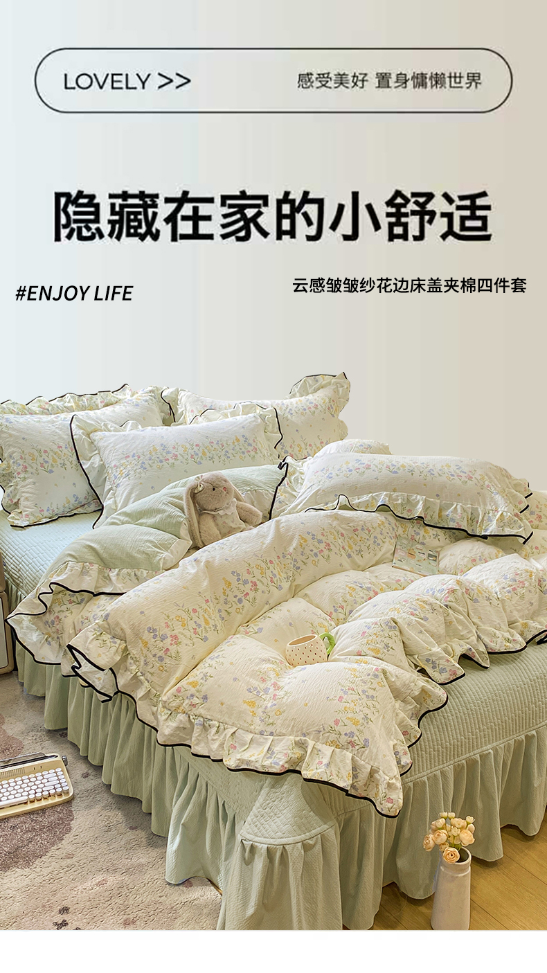 优贝家纺 2026新款云感双层纱皱皱纱花边床盖夹棉四件套 春日花园