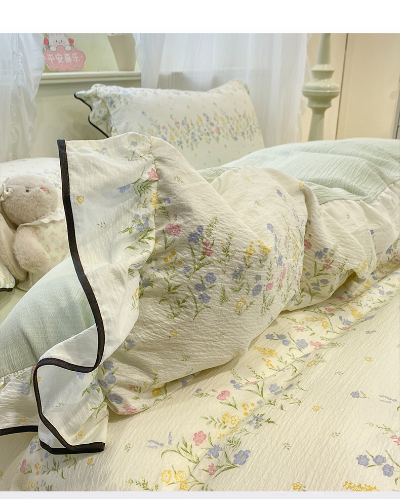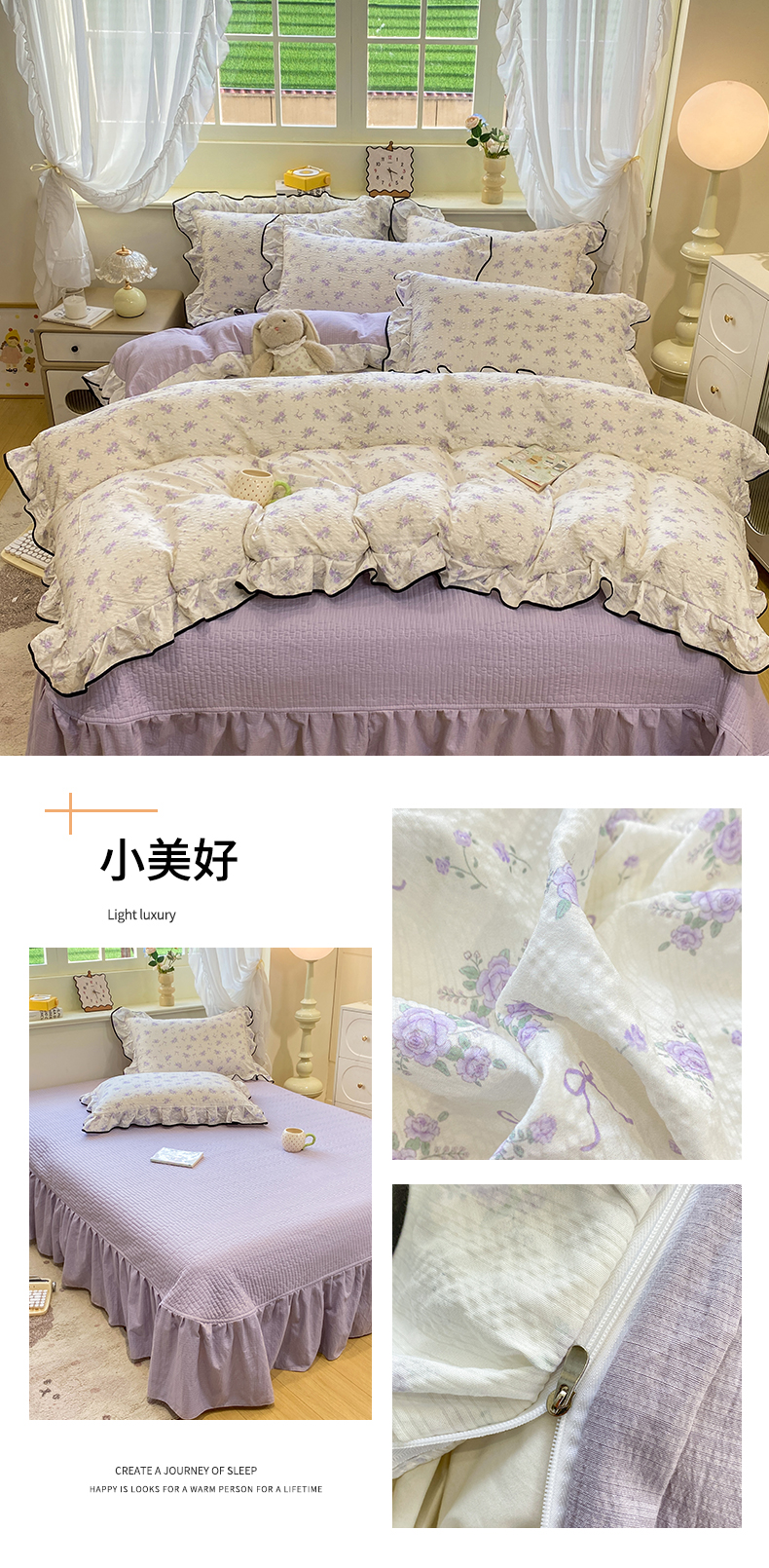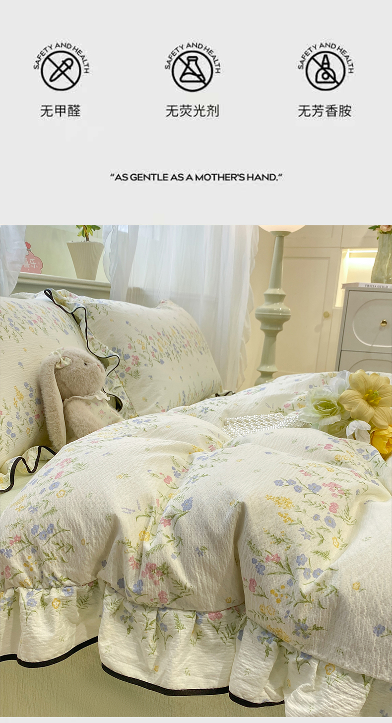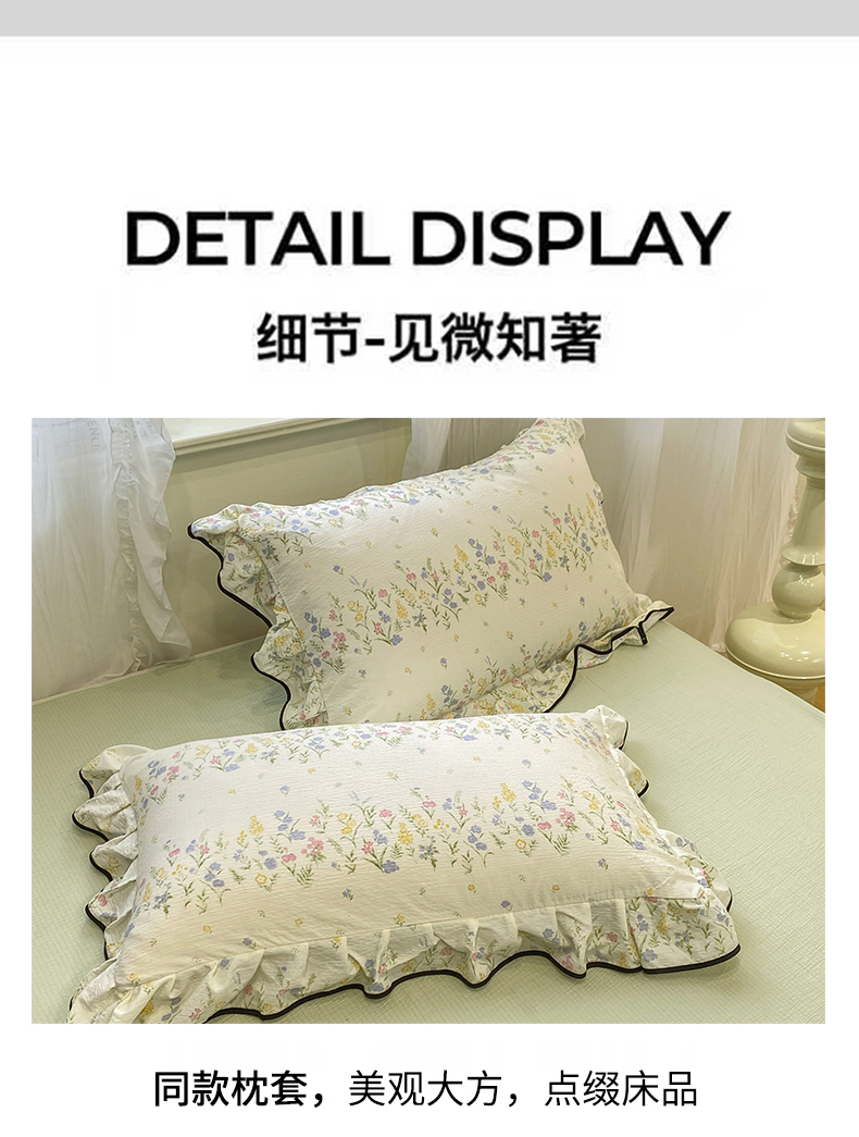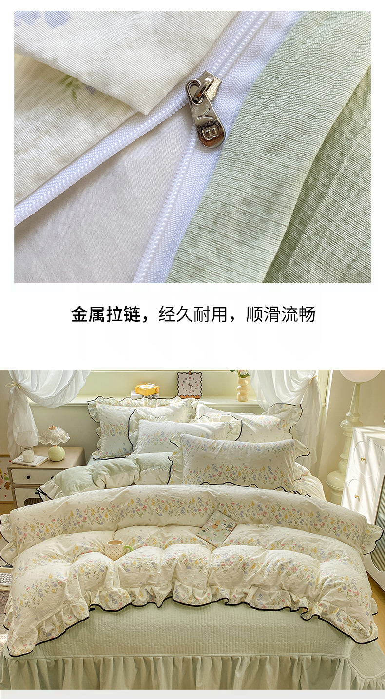 商品名称:优贝家纺 2026新款云感双层纱皱皱纱花边床盖夹棉四件套 春日花园