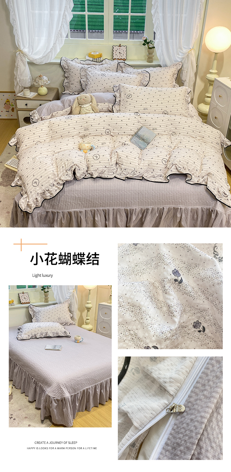(总)优贝家纺 2026新款云感双层纱皱皱纱花边床盖夹棉四件套,春日花园,马马福福-咖,马马福福,小花蝴蝶结,花香,甜心时光,可爱熊,奇奇乐园,小马乐园,小美好,星星人,星雪人,悠然小花