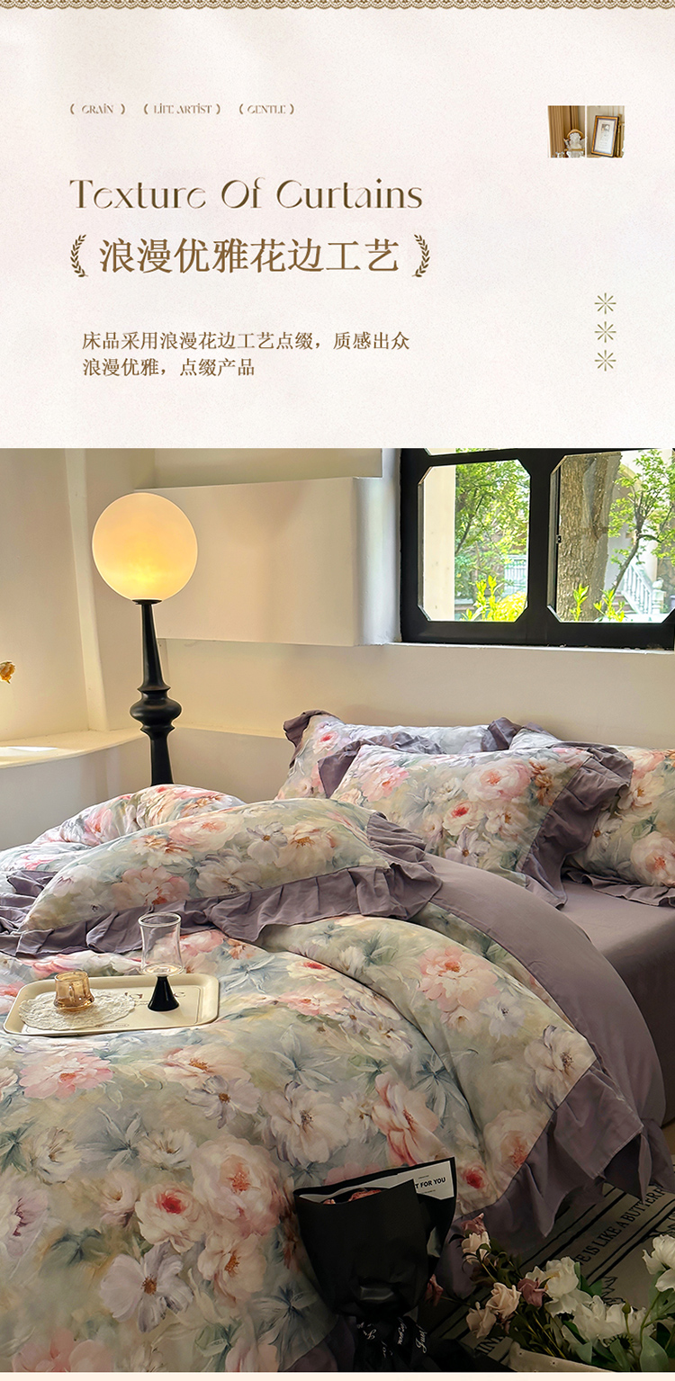 (总)(总)2026高端韩版法式公主复古油画风全棉纯棉双层纱四件套赫本浪漫荷叶花边仙女纯棉全棉双层纱四件套床上用品被套,仲夏,香榭丽舍,莫奈花园,南法假日,青青子衿,普罗旺斯,采薇,城堡玫瑰
