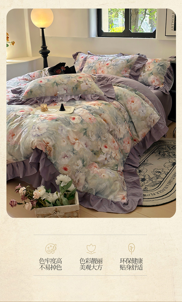 (总)2026高端韩版法式荷叶边印花纯棉全棉双层纱四件套复古赫本公主风少女花边全棉纯棉双层纱四件套,青黛,时光里里,疏影,暮色玫瑰,蔷薇恋人,爱丽丝,木槿,芳菲