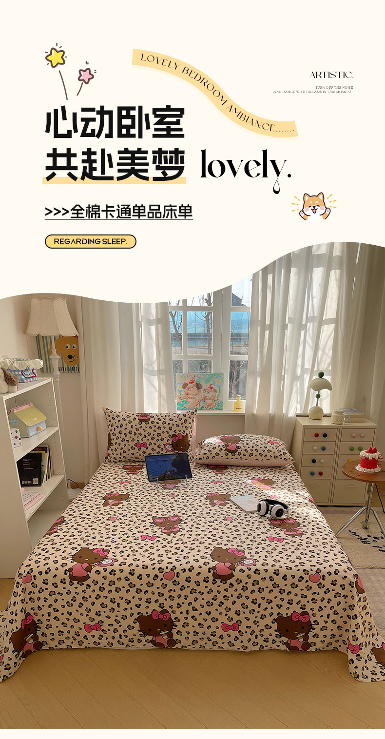 商品名称:六巷胡同 2026新款40支全棉13070INS卡通全棉单品床单 咖豹纹喵喵